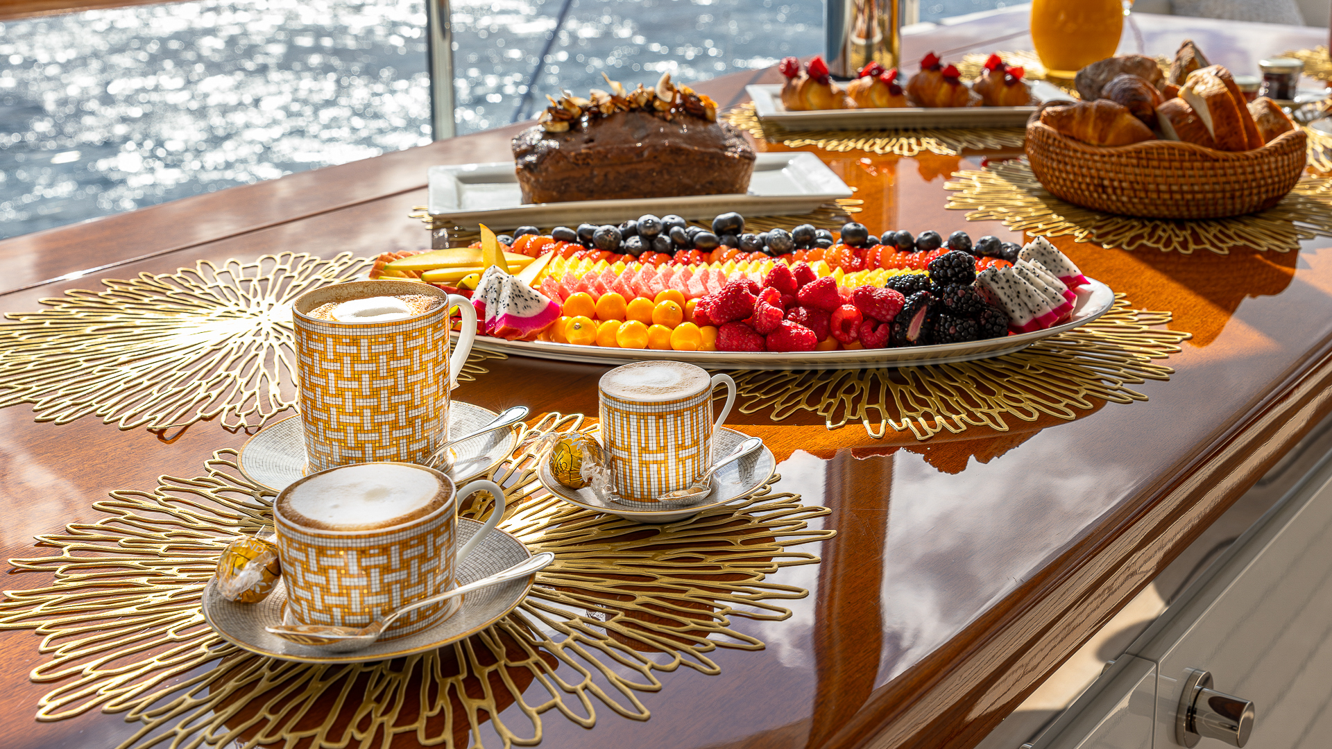 Across her 60m length and three deck levels, there is plenty of al fresco entertainment space where elegant furnishings offer a choice of dining, lounging and sunbathing. The sun deck is fabulous, with a forward jacuzzi area which finds a round spa pool surrounded by sun pads and sofas. The sofas wrap around the deck with tables and there is an elegant lounge setting with occasional chairs under the canopy where a skylight with tinted glass dims automatically depending on the strength of the sunlight. There is a bar for the crew to serve drinks and a spacious open deck aft furnished with a collection of moveable sun beds that can be flexibly positioned to make the most of the sun.