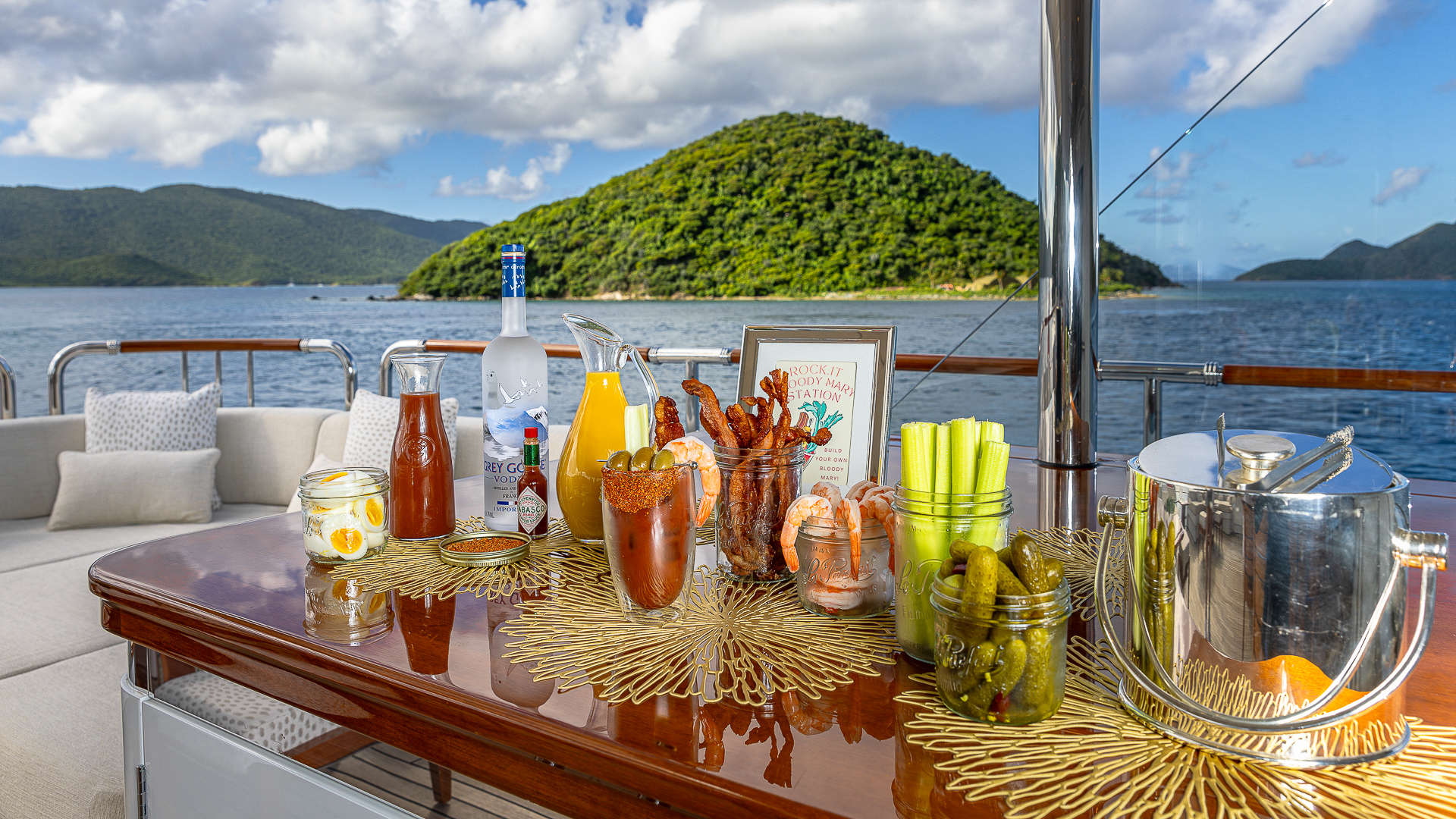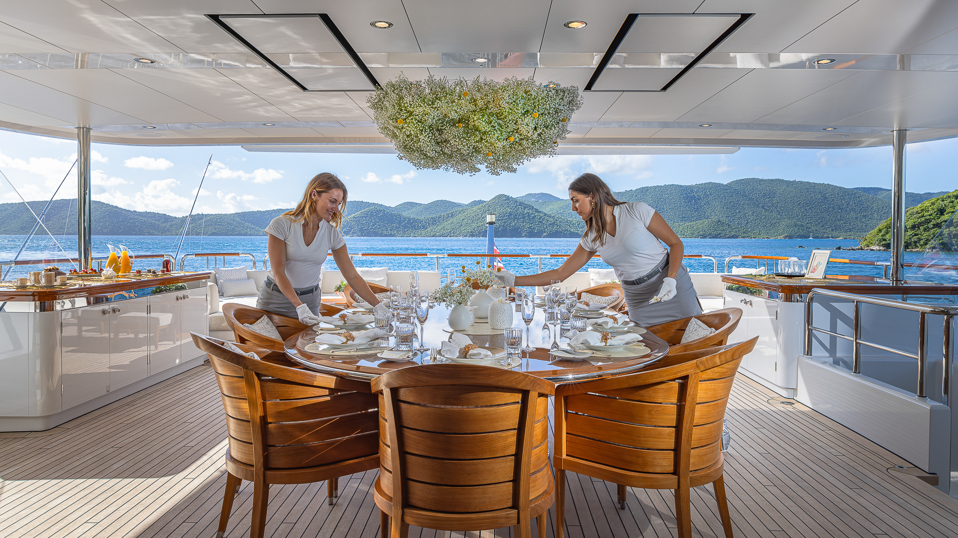 The bridge deck is the hub for al fresco dining with a stunning dining table that can seat everyone on board under the shelter of the sun deck overhang. There are two L-shaped sofas, one to port and one to starboard which face forward and surround flexible tables. Glass doors to the sky lounge recess into the superstructure to create a huge sociable space.