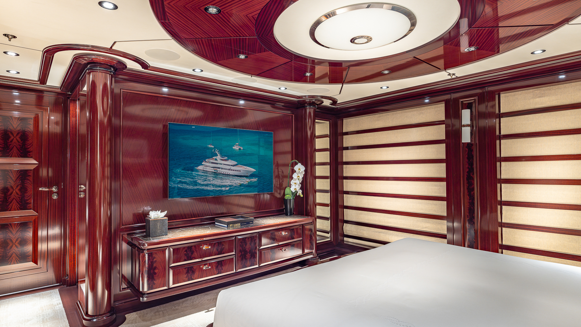 The main salon on the main deck is a truly stunning formal space with a lounge and dining room separated by a handsome built-in, low-level cabinet. The gloss wood finishes are complemented perfectly with cream sofas, chairs and soft furnishings finished with jewel-coloured velvet cushions. The entrance to the main salon from on deck is via a circular grand bar area with marble flooring and refined lighting.