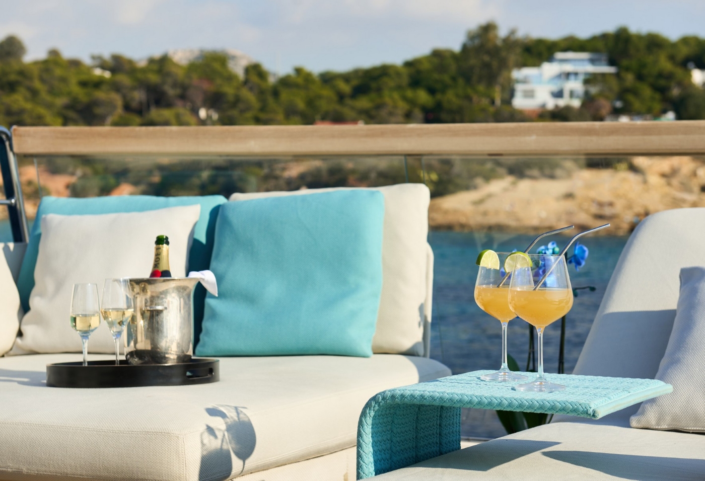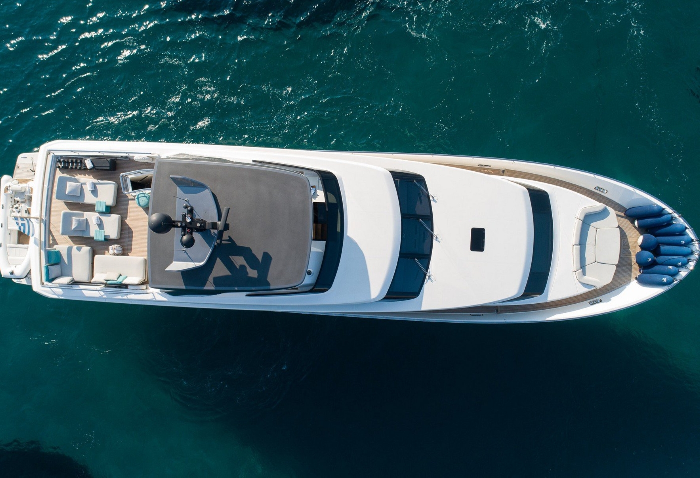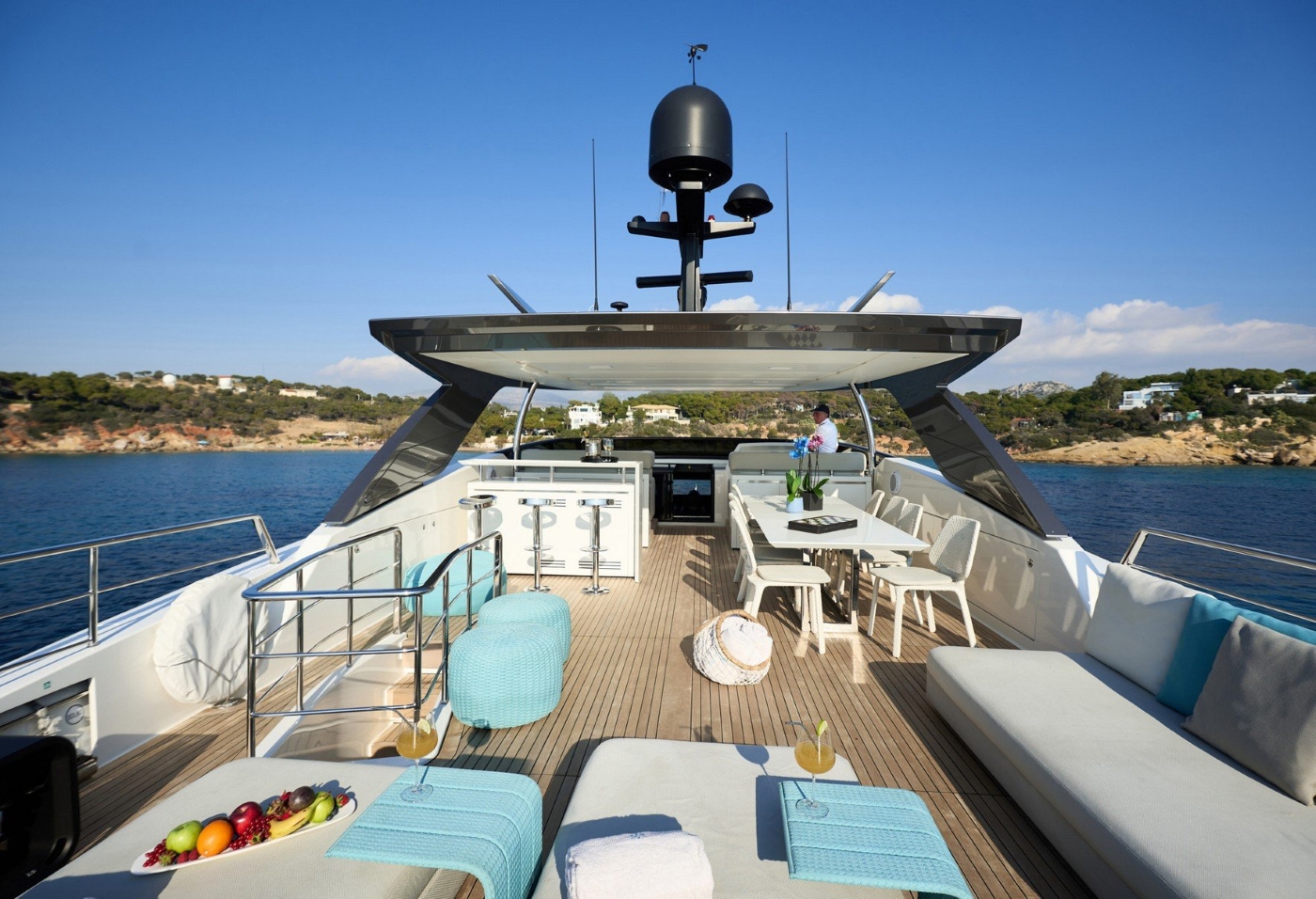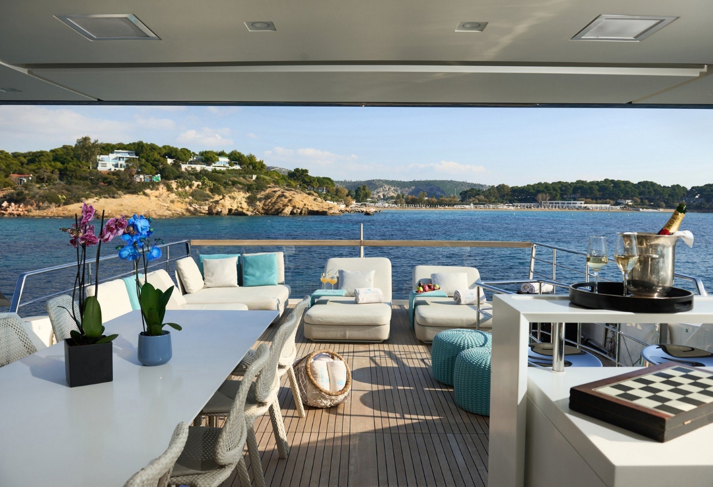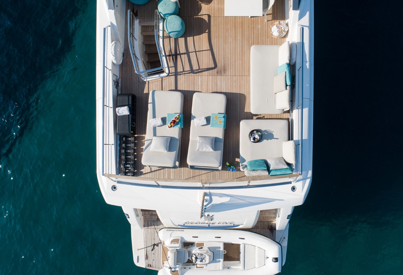 Exterior living is ample over 2 levels. From the salon, doors lead directly to the partially shaded aft deck and relaxation area. For water enthusiasts, the extended swim platform is the ideal water activity centre. Her upper deck is a social hub, offering an alfresco dining option, complete wet bar and service station, sun pads, seating and chaise loungers. The upper deck is partially shaded by a fixed hardtop Bimini.