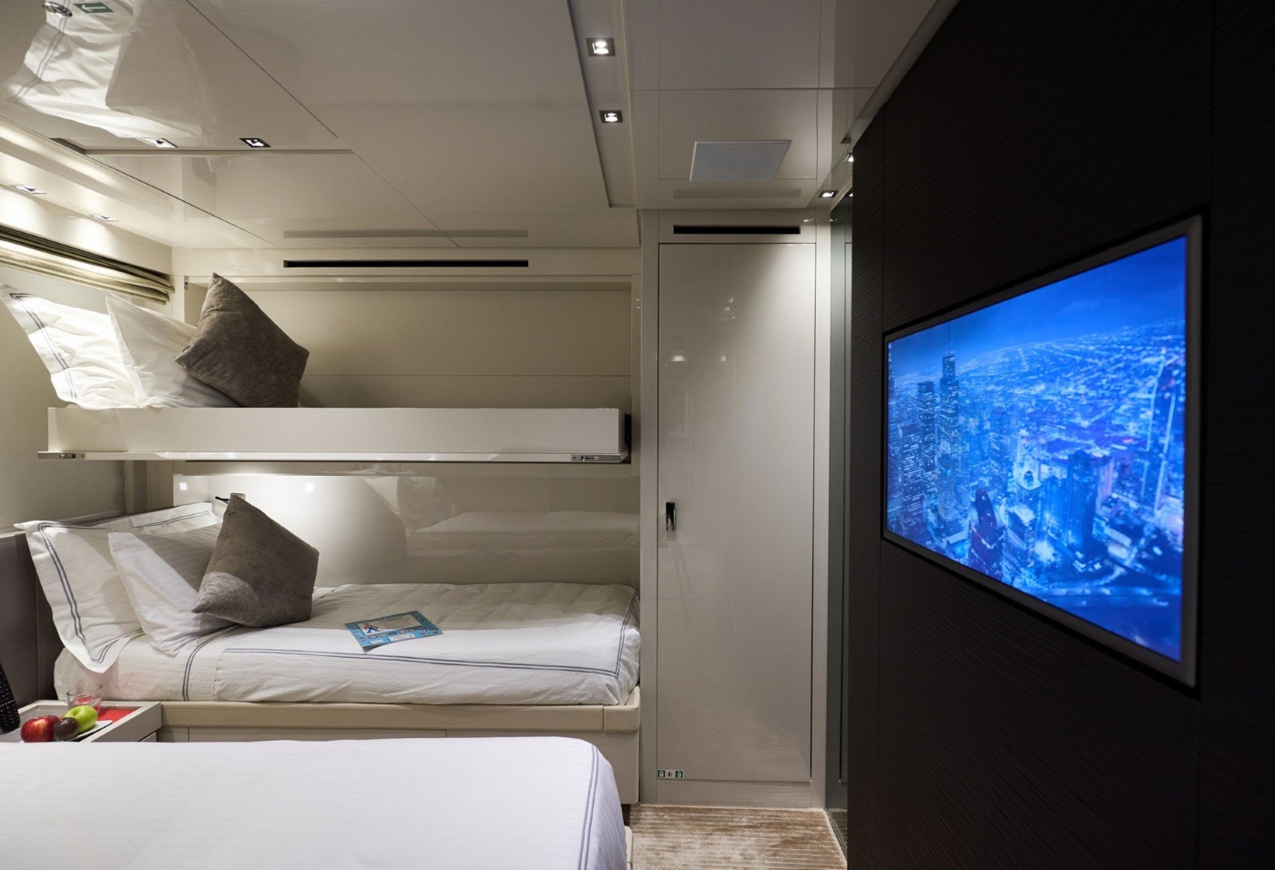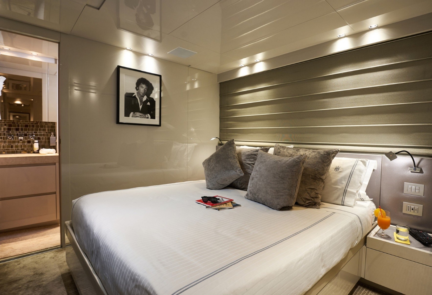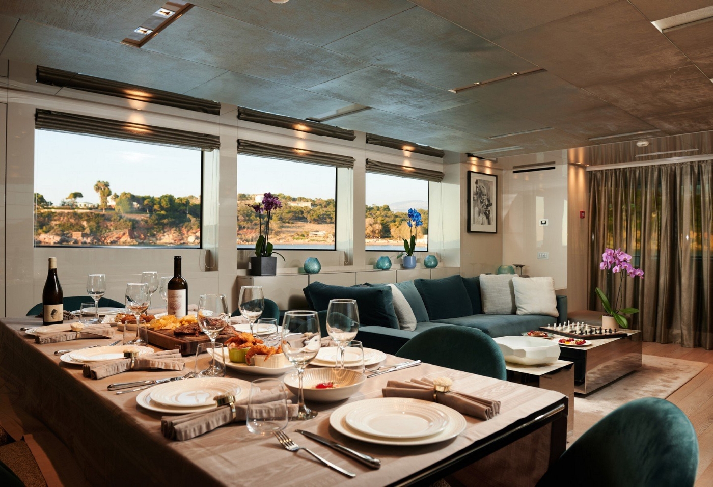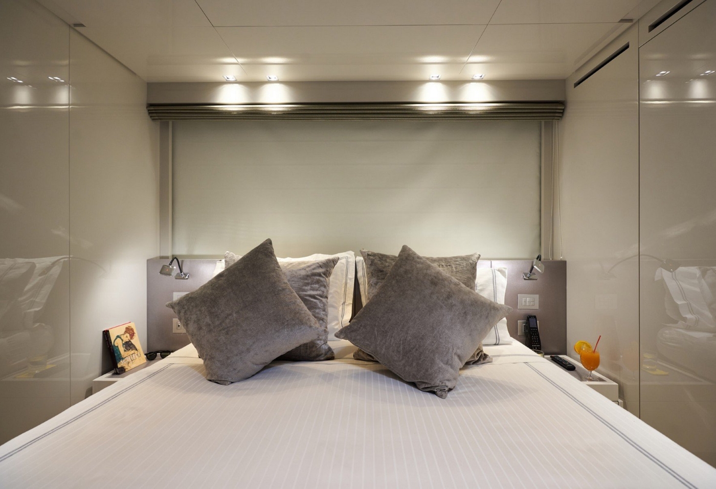 The yacht's interiors are light, contemporary and airy. An open-plan salon and dining space is surrounded by panoramic windows and features a large sofa with a coffee table and full entertainment systems aft, with a formal dining table forward. On the port side, a foyer gives access to the lower deck, followed by a private entrance on the main deck, to the full-beam master stateroom. Below decks, accommodation is in 3 cabins with queen size beds and one cabin with convertible twin beds, to a double bed.