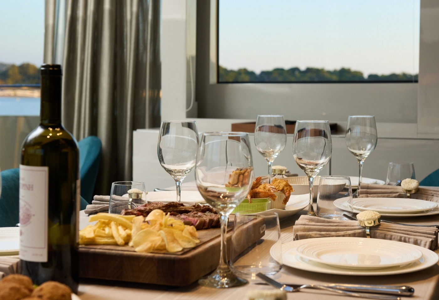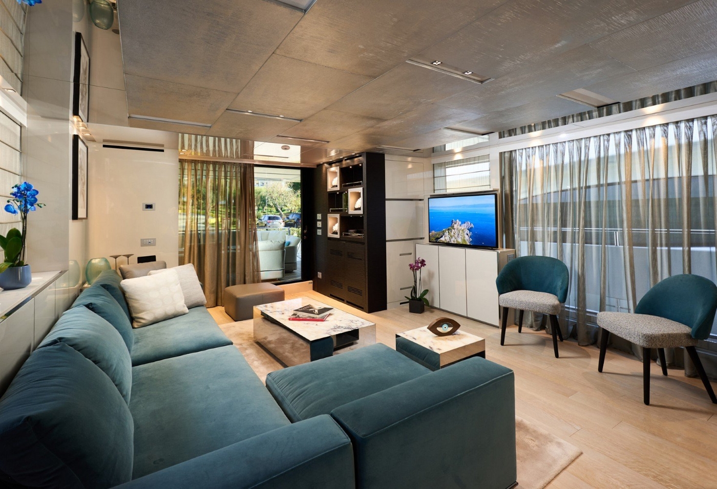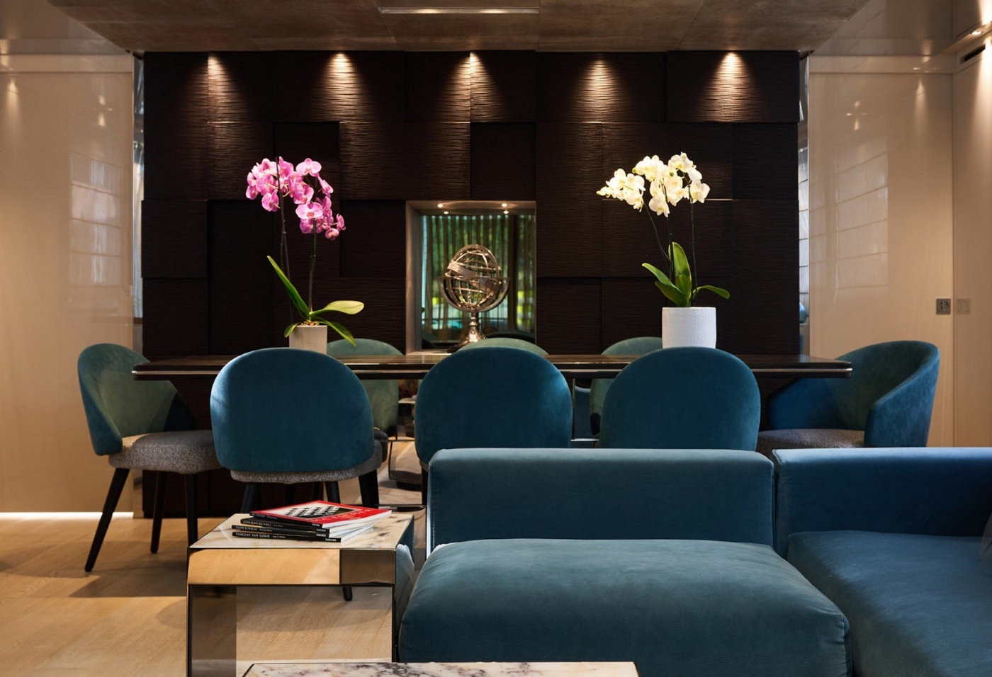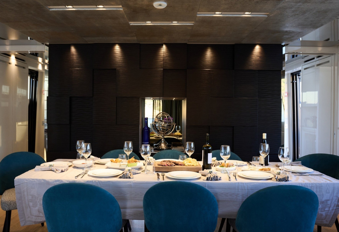 The yacht's interiors are light, contemporary and airy. An open-plan salon and dining space is surrounded by panoramic windows and features a large sofa with a coffee table and full entertainment systems aft, with a formal dining table forward. On the port side, a foyer gives access to the lower deck, followed by a private entrance on the main deck, to the full-beam master stateroom. Below decks, accommodation is in 3 cabins with queen size beds and one cabin with convertible twin beds, to a double bed.