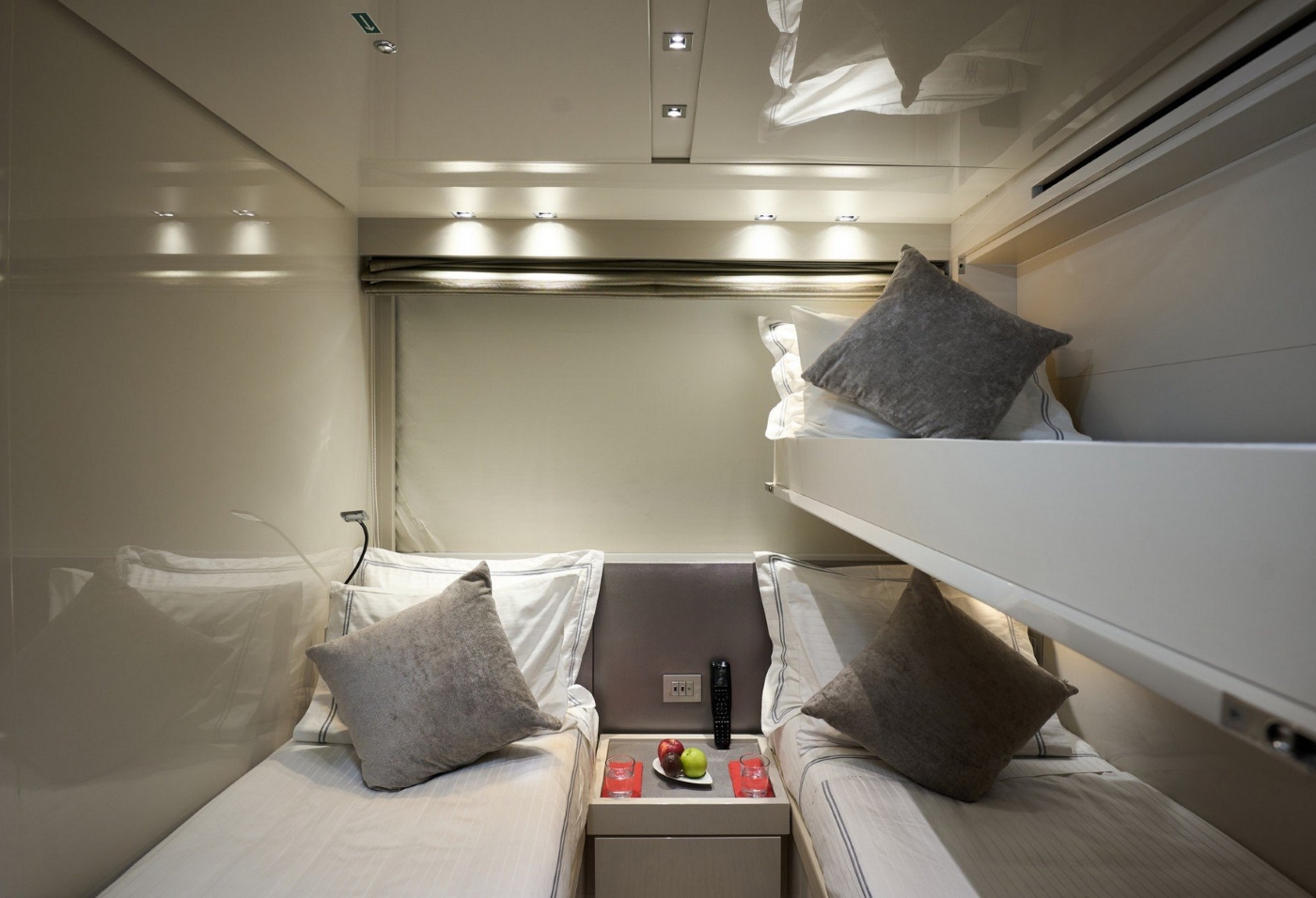 Accommodation is in 5 en-suite cabins, for 11 guests. The master stateroom is located on the main deck, forward of the salon and dining. The master cabin offers a queen-size bed, vanity, generous en-suite with a tub and plenty of storage. Below decks, 3 cabins have queen size beds and one cabin has a convertible twin, to double bed. An optional Pullman berth is also available.