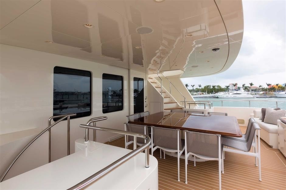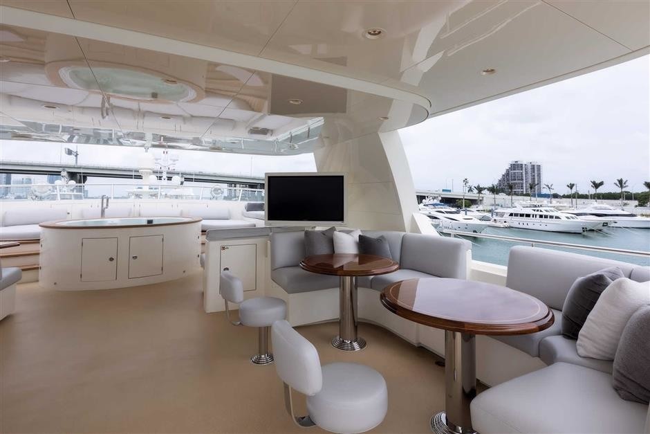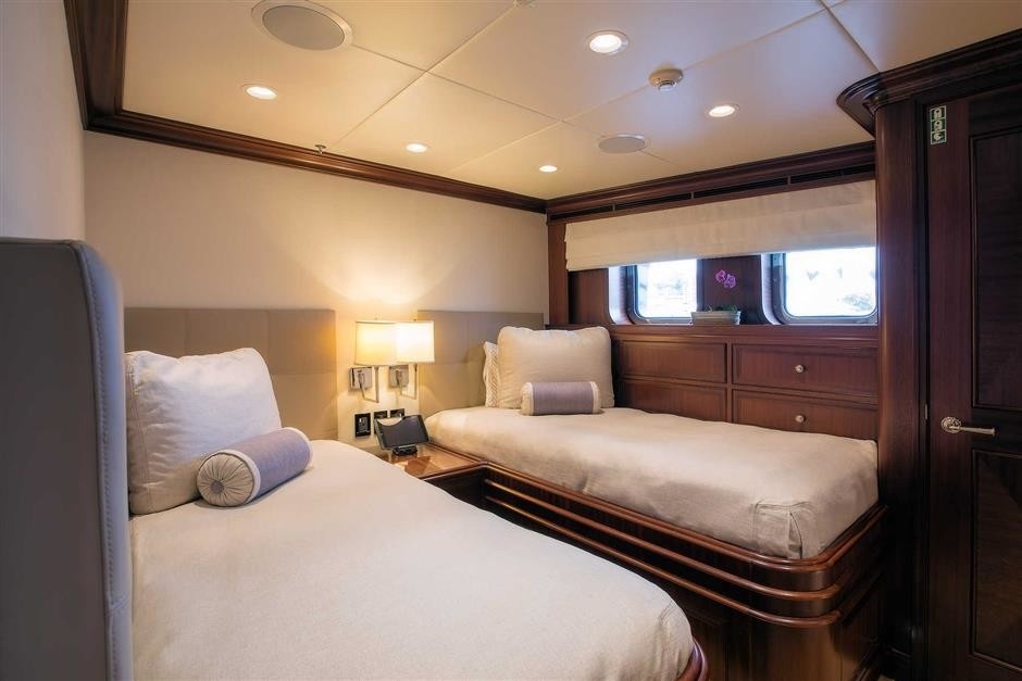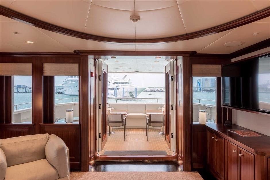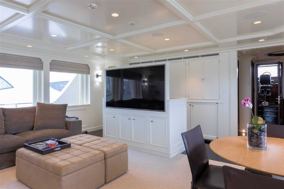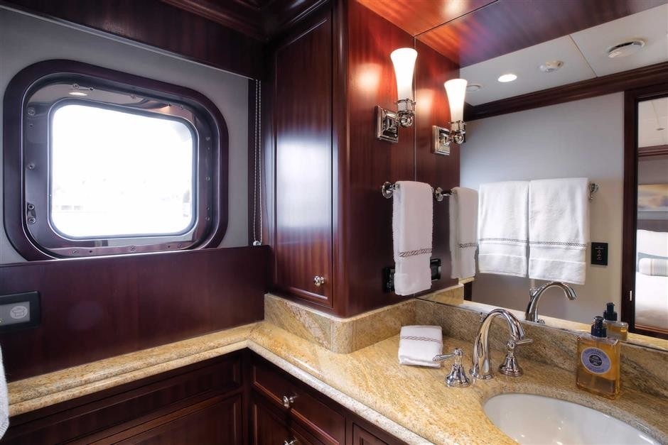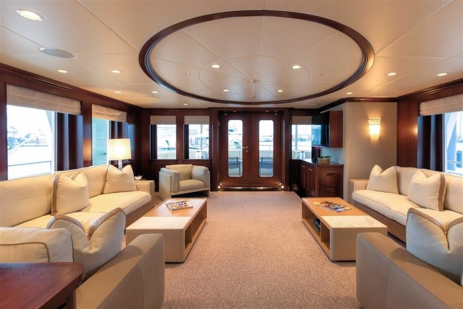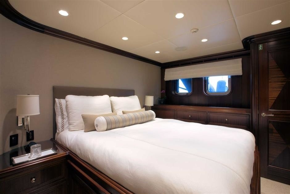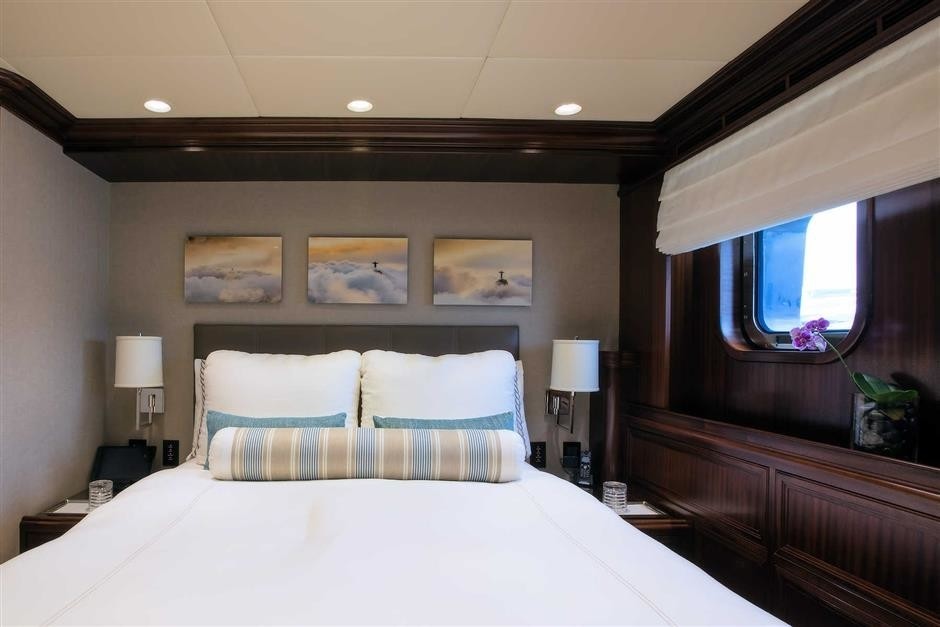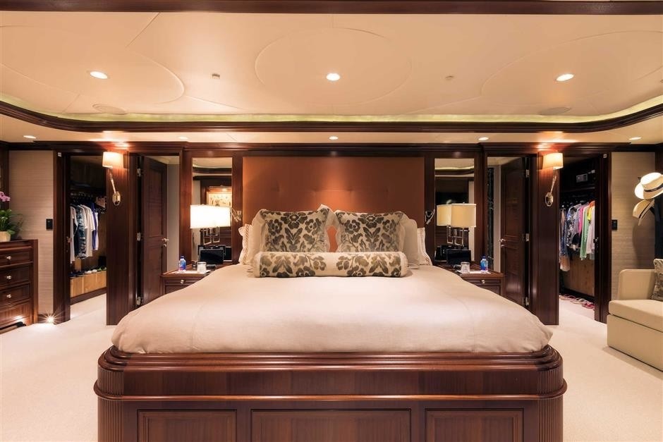 Interior design is that of Michael David & Associates and boasts a harmonious combination of modern chic, art deco and traditional classic. The main salon is open and airy with the lounge aft and fine dining forward. Further forward, the master stateroom is on the main deck, offering a full beam layout, king size bed, sofa, vanity and en-suite with deluxe bath and oversized shower.