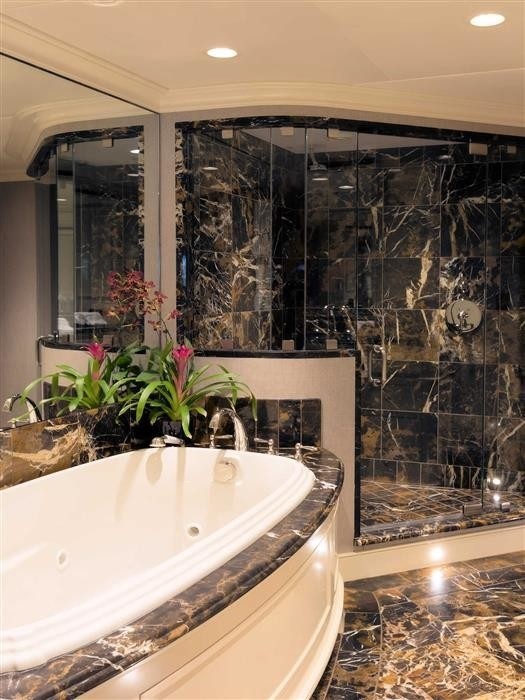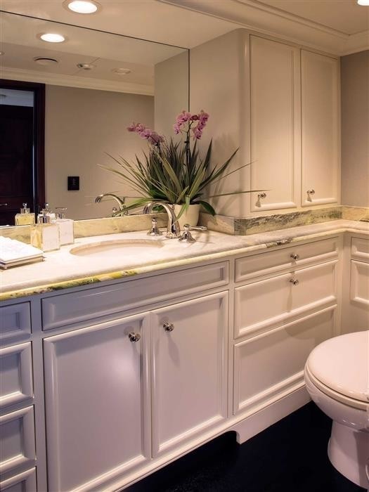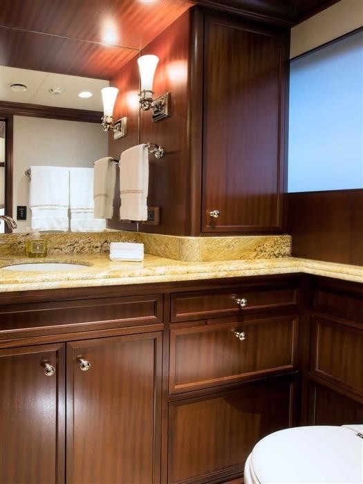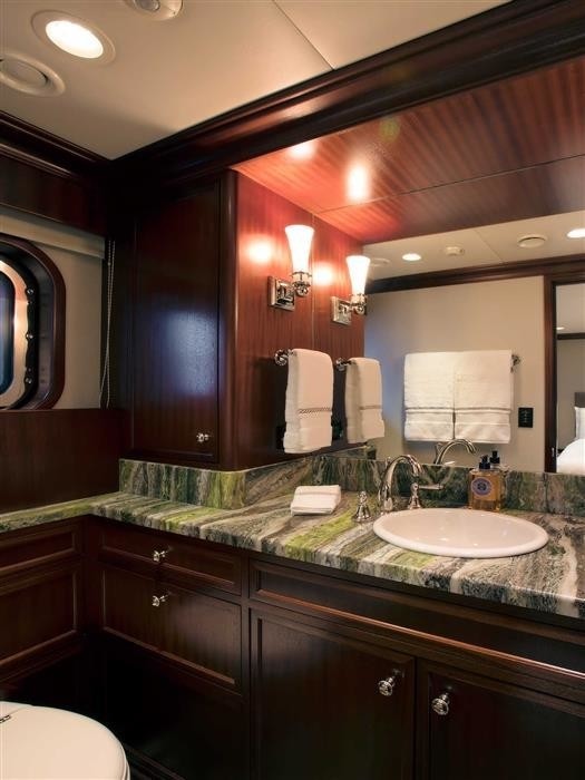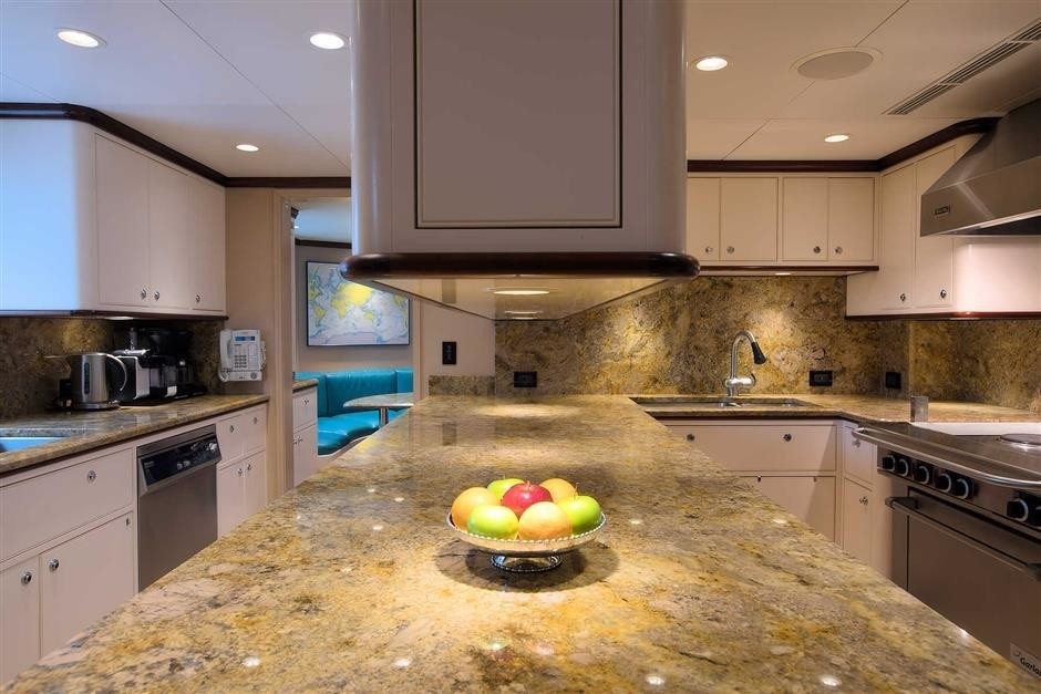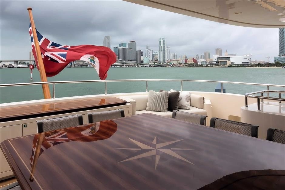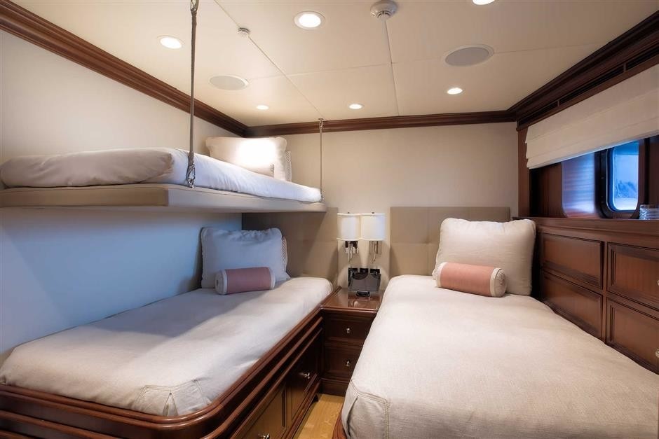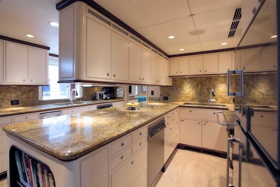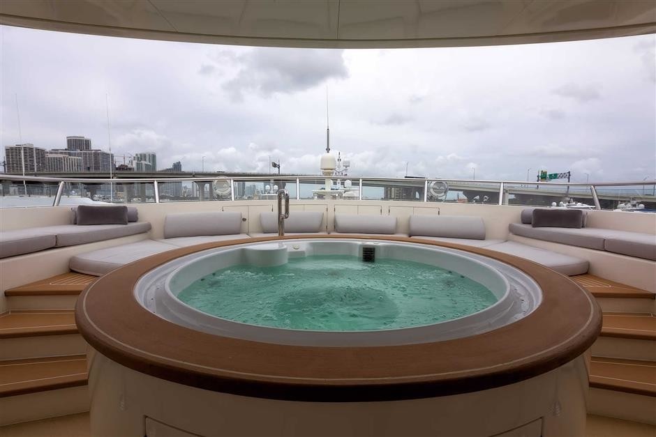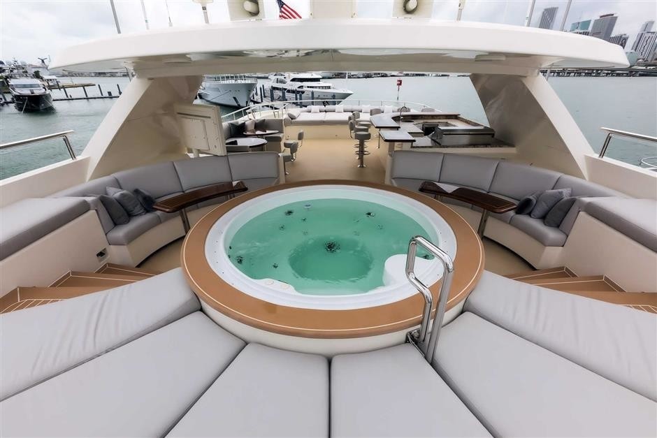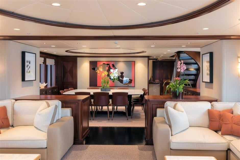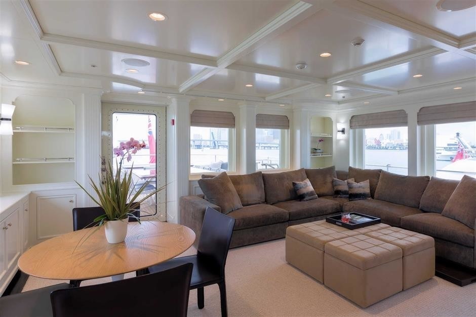 Interior design is that of Michael David & Associates and boasts a harmonious combination of modern chic, art deco and traditional classic. The main salon is open and airy with the lounge aft and fine dining forward. Further forward, the master stateroom is on the main deck, offering a full beam layout, king size bed, sofa, vanity and en-suite with deluxe bath and oversized shower.
