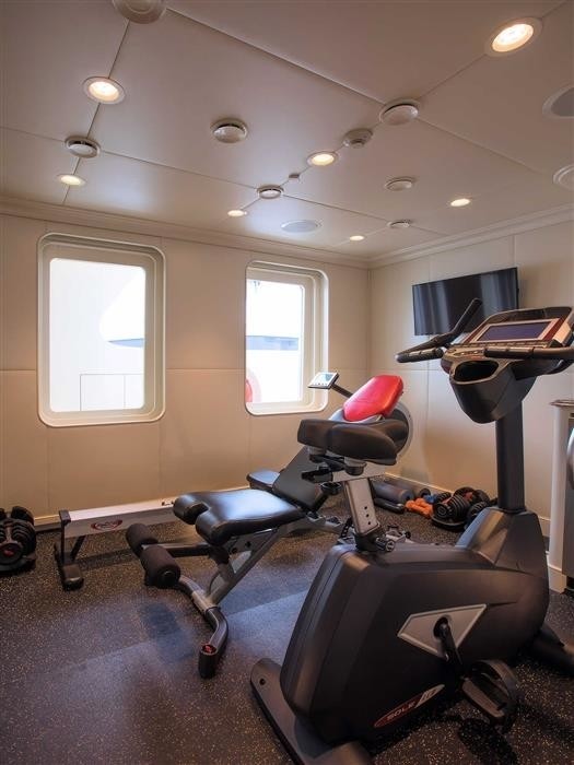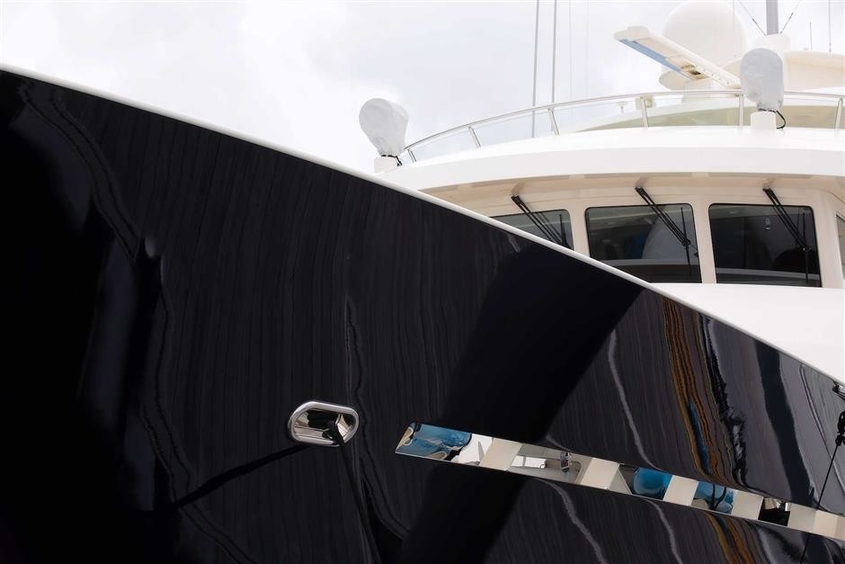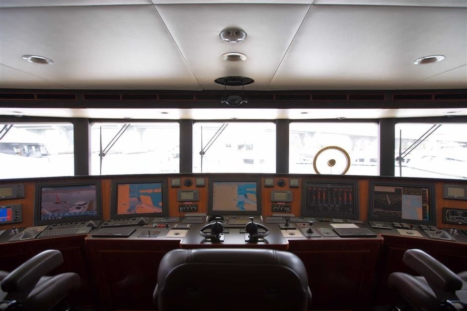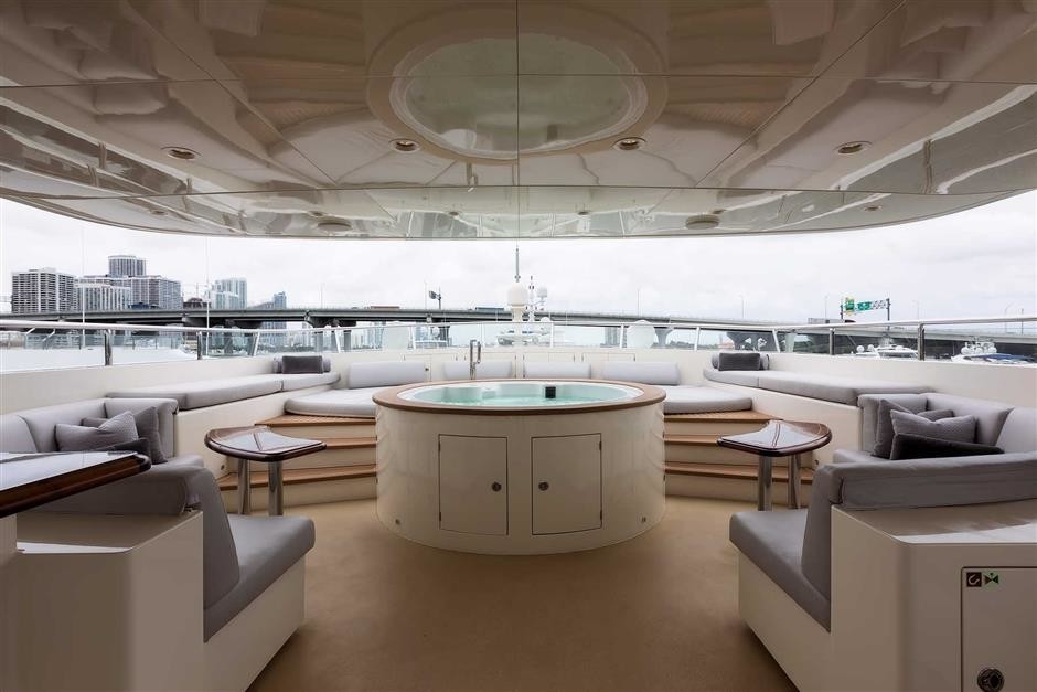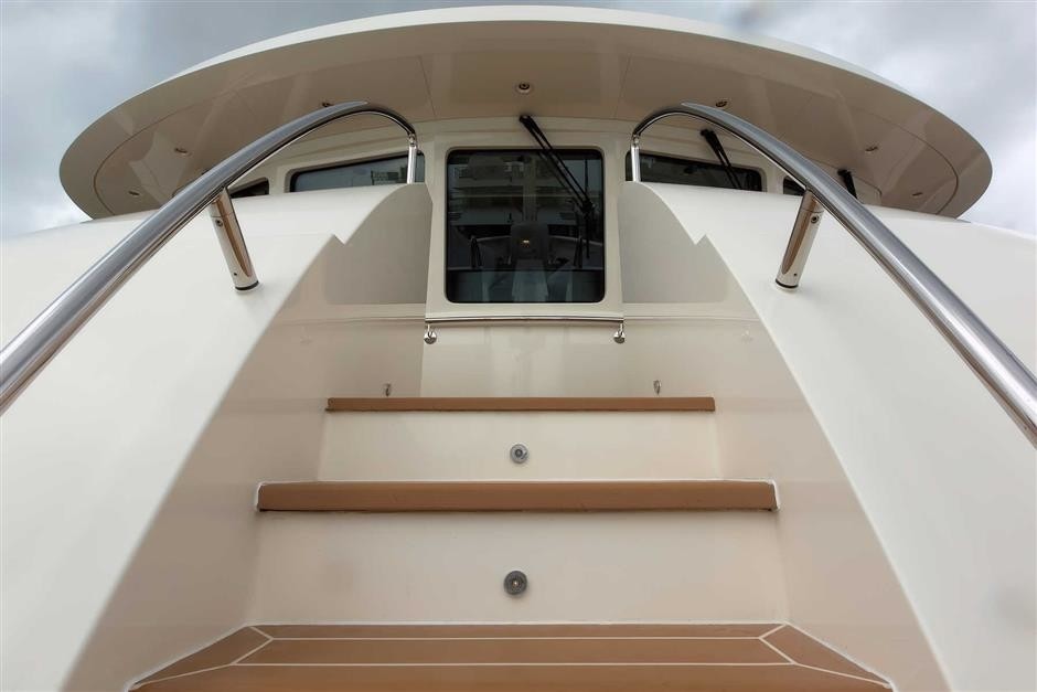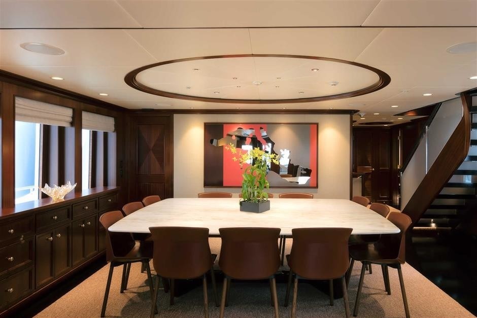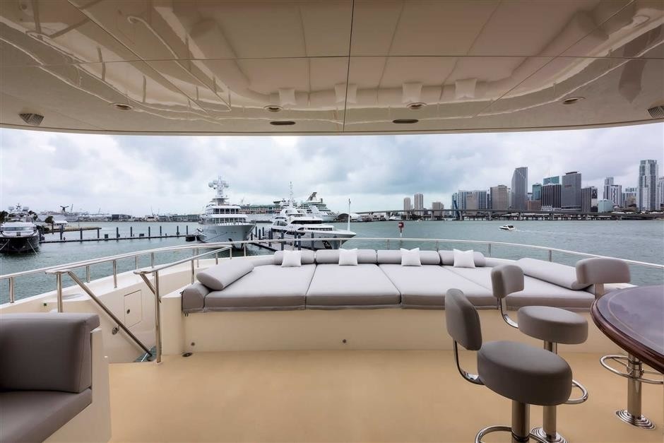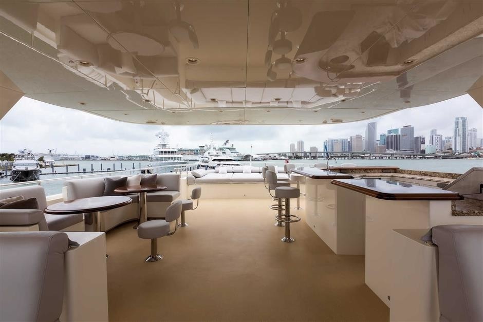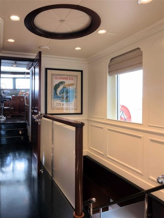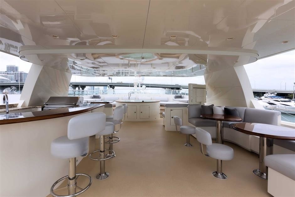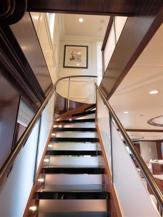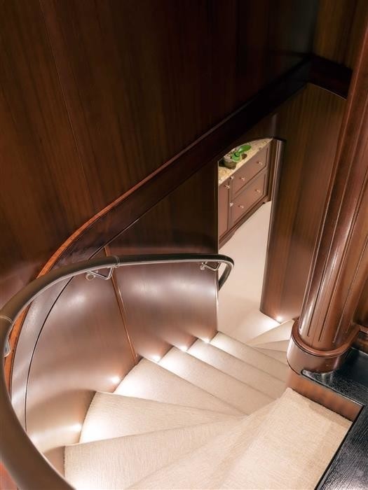 On the starboard side, an intricate sweeping stairway leads to the guest gym, pilot house and stylish sky lounge, complete with wet bar.