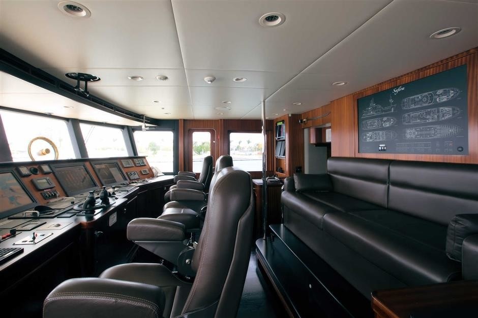 Boasting a steel hull and aluminium superstructure, the superyacht SAFIRA is run by twin Caterpillar 3516 diesel engines. She can reach a maximum speed of 13.5 knots and a cruising speed of 11.1 knots and has an impressive range of 8800nm. Her beam is of 8.55m (28.5ft)), while her maximum draft is of 2.5m (8.2ft). SAFIRA is ABS as well as MCA classed.