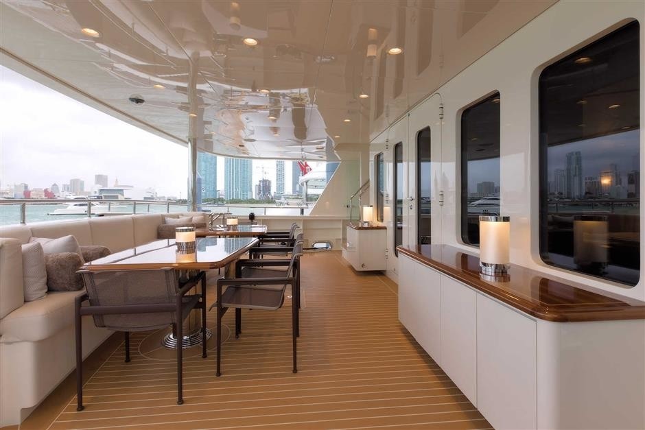 Exterior living aboard the M/Y SAFIRA is ample and continues to embrace the modern and sustainable approach. The main deck aft features partial shade, comfortable seating and an alfresco dining option, followed by an extended swim platform and fabulous assortment of water toys. The sky lounge offers direct access to the upper aft deck, with alfresco dining and additional seating.