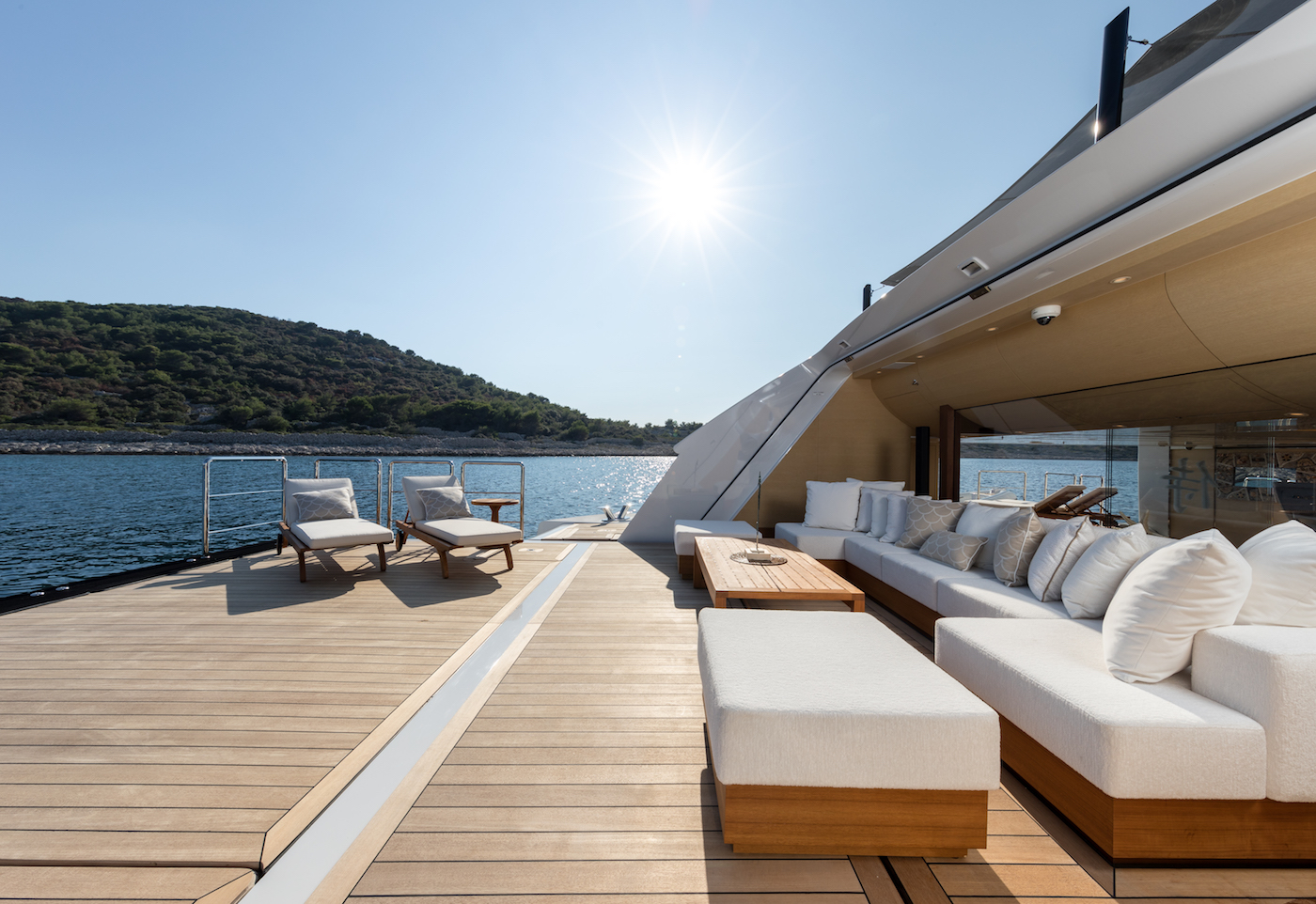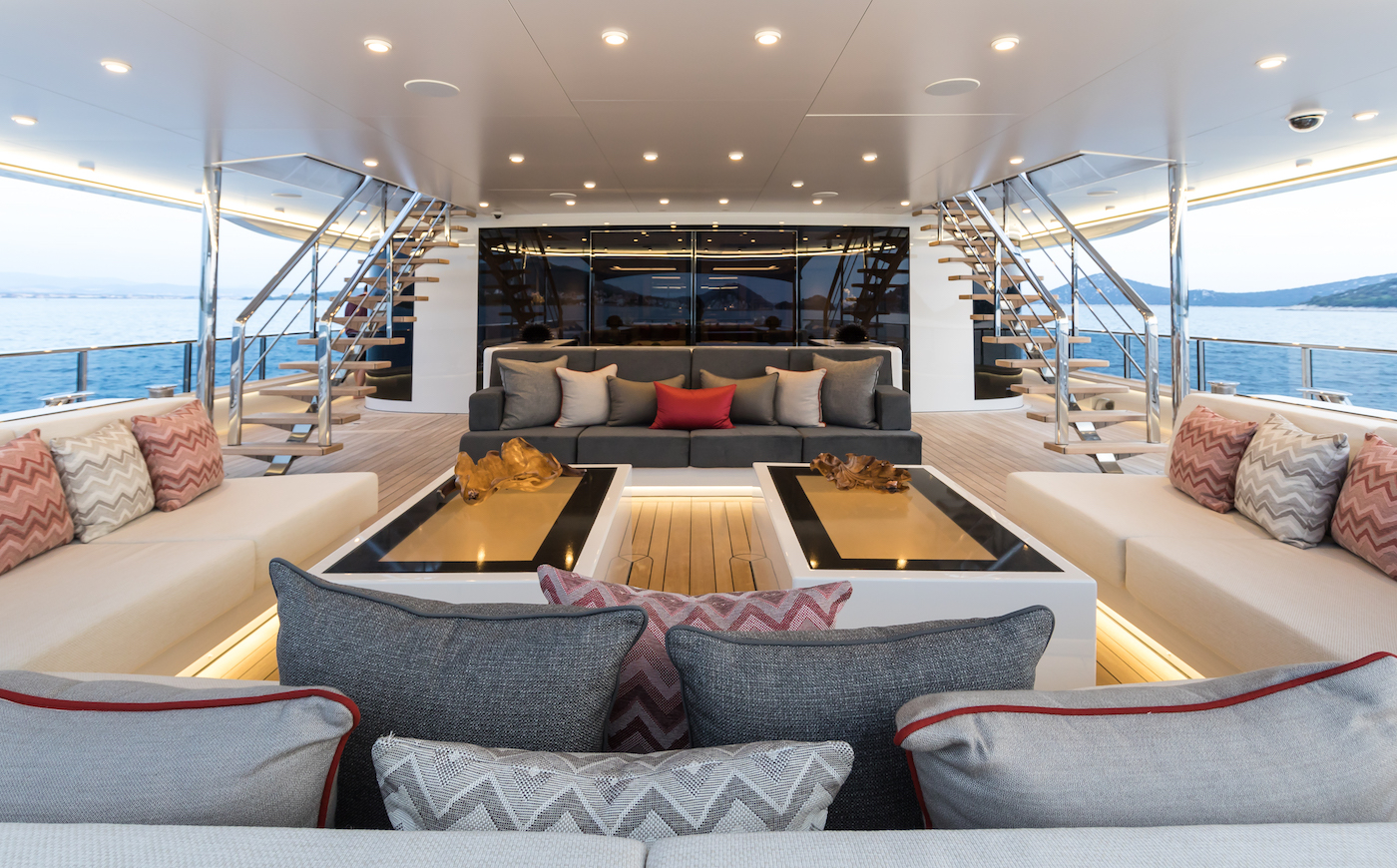 Samurai boasts high volume interior spaces, also characterised as functional and flexible at the same time. Airy ambience onboard is achieved by the fantastic indoor-outdoor flow. The innovative layout is another great feature of Samurai. Her master suite is located on the main deck, as well as the main saloon and dining area, which resembles a contemporary luxury residence. The main salon is wrapped in full-height panoramic windows, which provide amazing panoramic views.