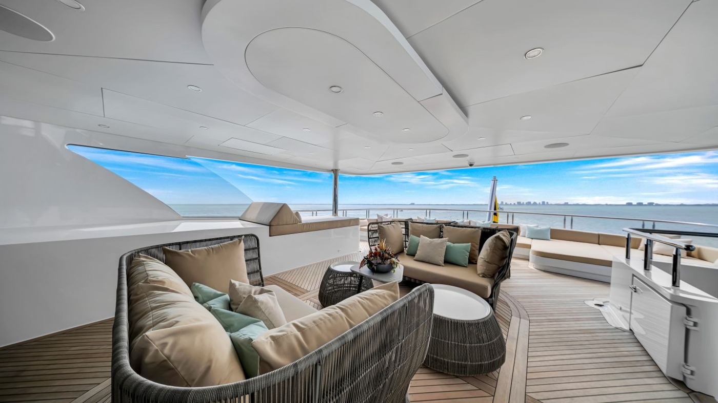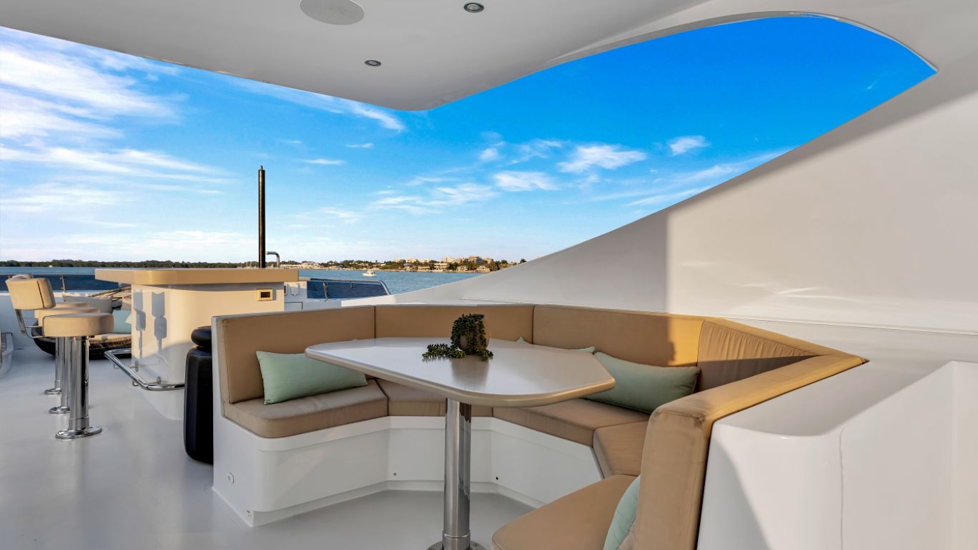 With three spacious decks, exterior living is ample. The main deck features a large aft shaded deck, adjacent to the salon and complete with comfortable lounge seating and coffee tables. Wide sliding glass doors lead into the salon, via the bar, making this space ideal for casual or formal entertaining. An upper deck offers an alfresco dining option aft, with direct access to the master cabin, plus additional lounge seating further aft. Forward, a seating area has a small table and chaise lounges, great for a quite escape. The top sun deck is well-appointed, boasting three alfresco tables, chaise lounges, wet bar with fitted stools, raised Spa Pool tub and partial shade.