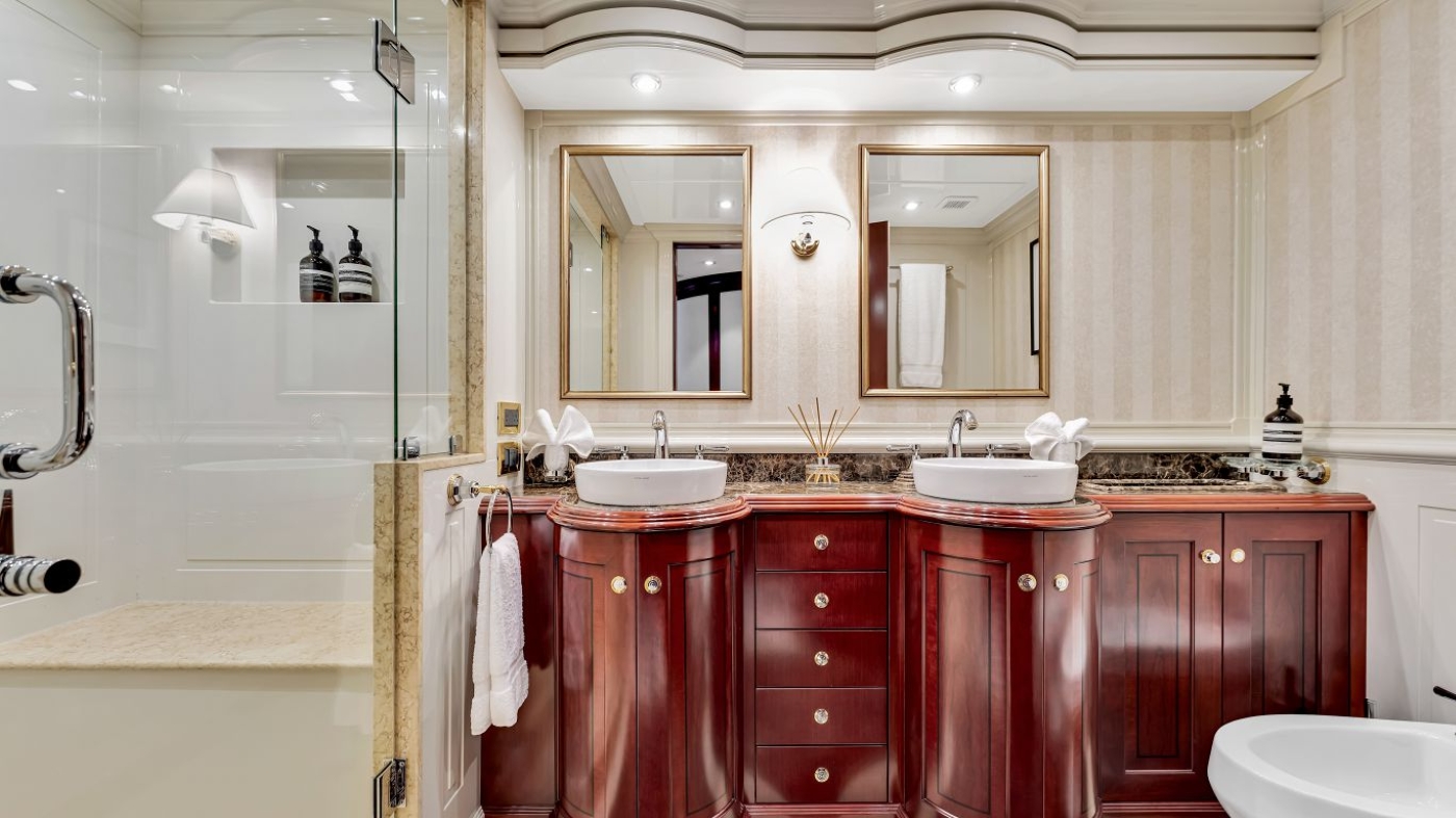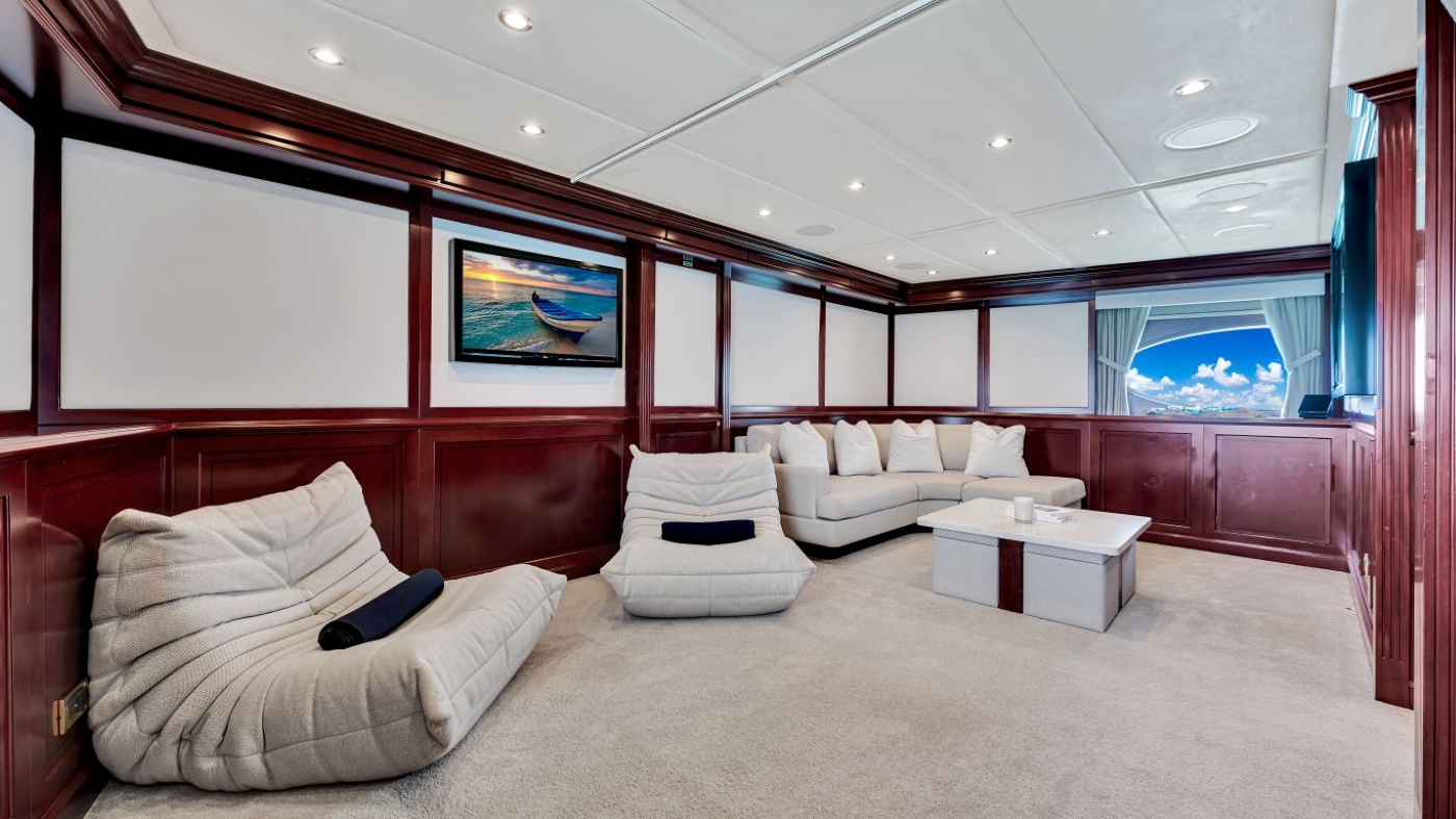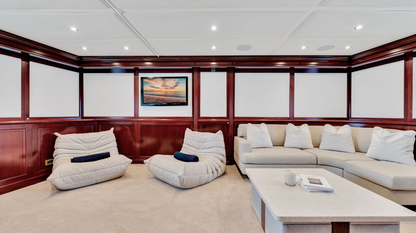 SWEET CAROLINE II has an elegant and spacious interior, boasting exquisite joinery, fine marbles, impressive fittings and plush soft furnishings. The salon and dining is an open plan, featuring a well-appointed lounge, offering ample seating and coffee tables and wet bar aft and full beam formal dining forward. Forward of the salon is the state of the art galley to port, with the foyer to starboard. A guest double and twin upper and lower bunk cabin are on port and starboard, while further forward, is a gym and lounge room, perfect for TV entertainment.
