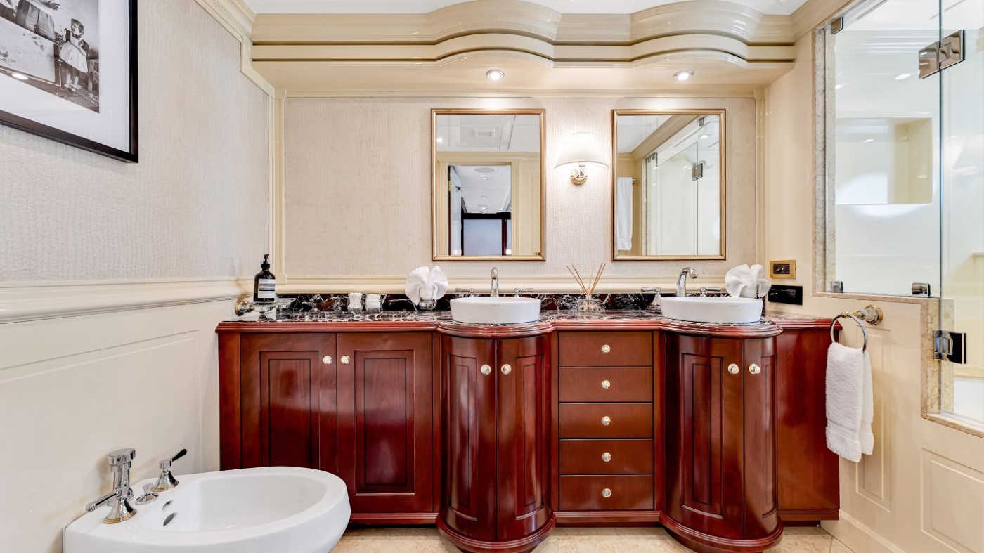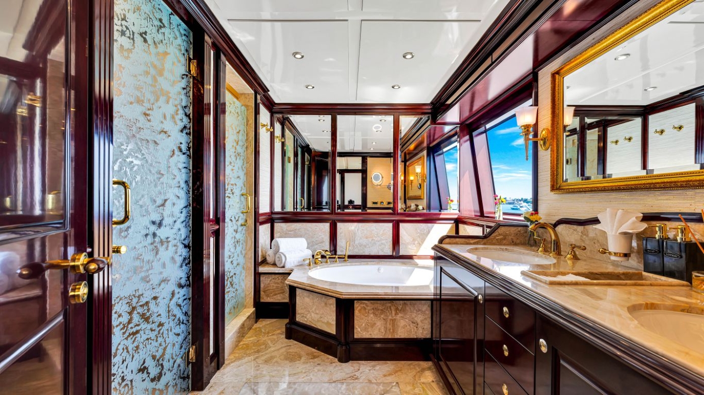 The upper deck features the master suite aft, with private access to the upper aft deck. The master suite offers a king size bed, sofa, lounge, walk-in wardrobe and massive en-suite, with deluxe Spa Pool tub. Forward of the master suite on the port side is a guest double, followed by the pilot house. Below decks, guest accommodation consists of two double cabins and 2 twin cabins. All the cabins are generous and light. Each cabin is equipped with full entertainment systems and offer a serene, relaxed ambience.