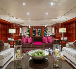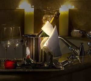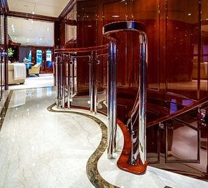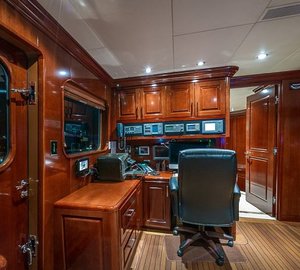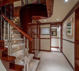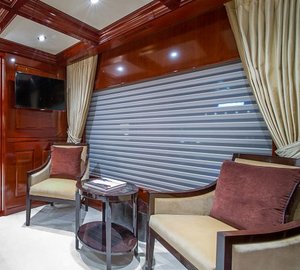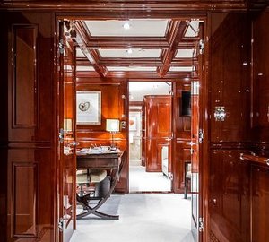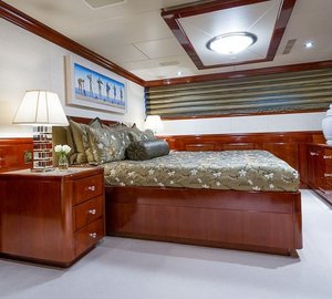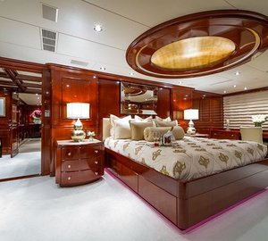 The master suite is on Main Deck and has a king, with an en-suite his/hers bathroom with tub and separate shower, comfortable sitting area, a walk-in closet from the bathroom or the stateroom and a private Owner's office. There is a VIP cabin Below Deck with a spacious bathroom with tub and shower. There are two double, and two twin cabins are below decks, each with an en-suite and A/V entertainment system.
