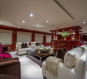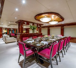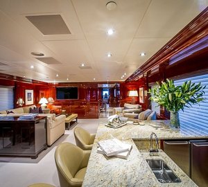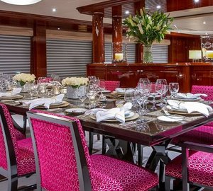 The main salon is spacious with plush seating and conversational area and a full entertainment center including a wide screen TV. NO COMMENT's dining area has a large table w/ seating for 12 guests. Providing semi-privacy between the salon and the dining area is a center credenza. Large windows extend along the dining area and the salon providing natural light and an excellent view.