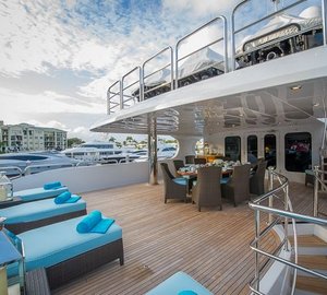 Spa Pool forward and large cushioned sun pad. Elevator service to all decks, BBQ grill, bar w/stools and adjacent banquette for casual dining for 12. Spacious aft deck carries water sports equipment. Design of the super structure provides shade at the bar and dining area.