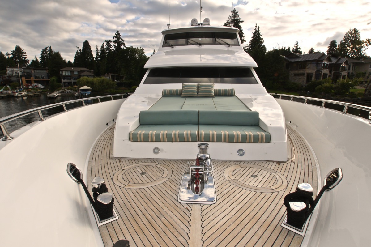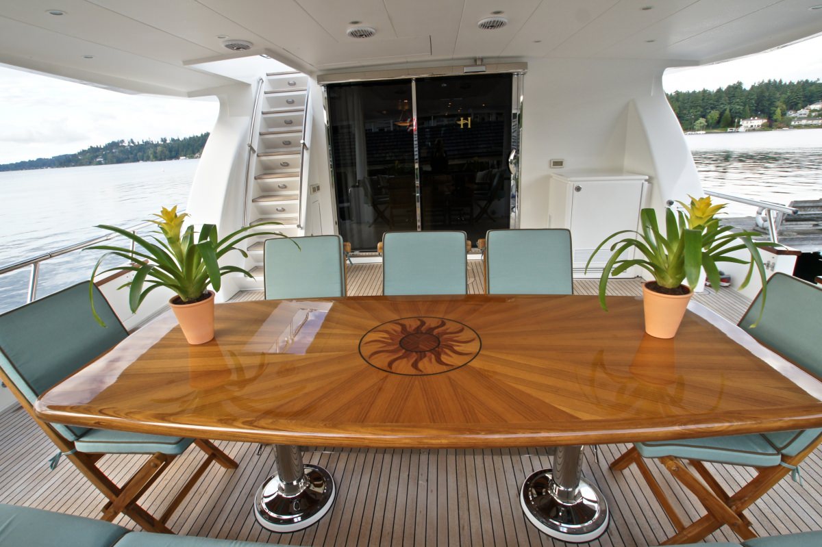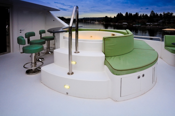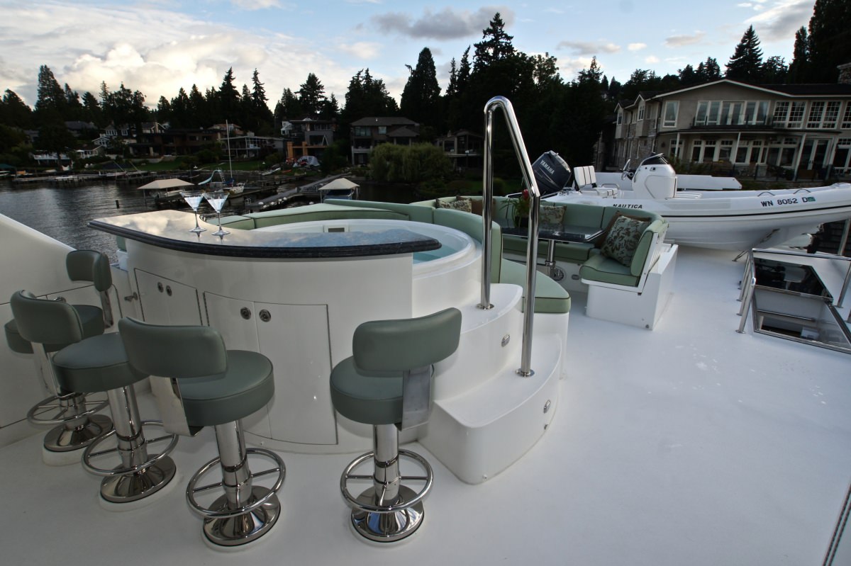 The exterior living is spread over 2 generous decks. Adjacent to the salon is the shaded aft deck, offering alfresco dining and plenty of seating. The yachts extended swim platform is easily accessed from the aft deck, and features stainless steel railings for added safety. On the foredeck is a large sunpad and comfortable built in seating area. Her sundeck is aft of the skylounge, with an additional alfresco dining table, sunpads, seating and deluxe Jacuzzi, with built in bar top and stools. Access to the upper deck is available from both the exterior aft deck and skylounge.
