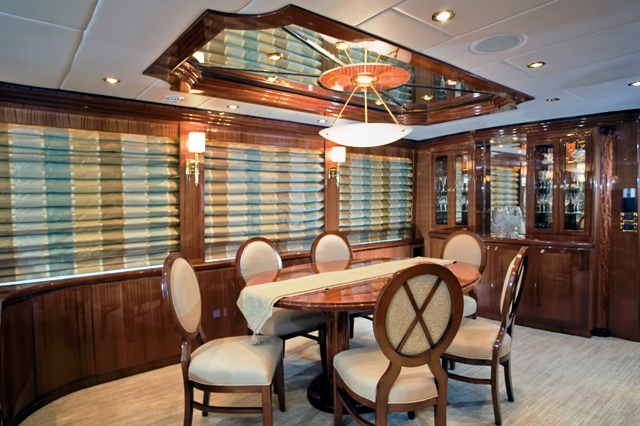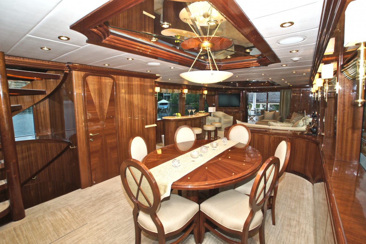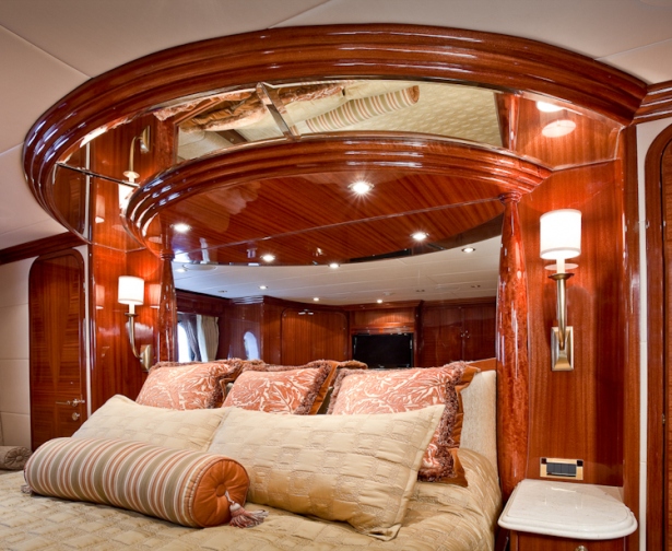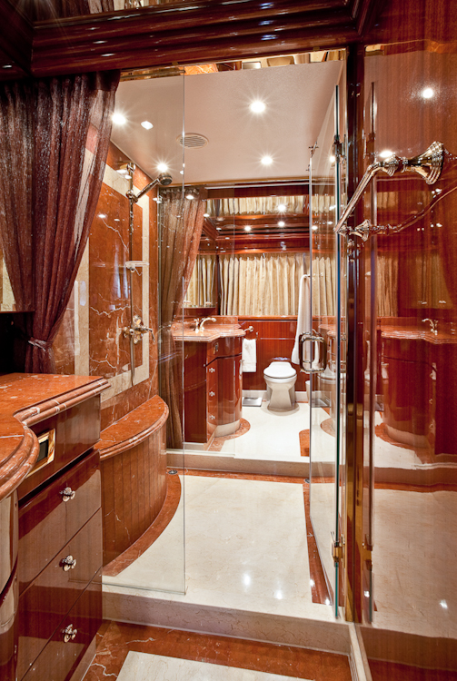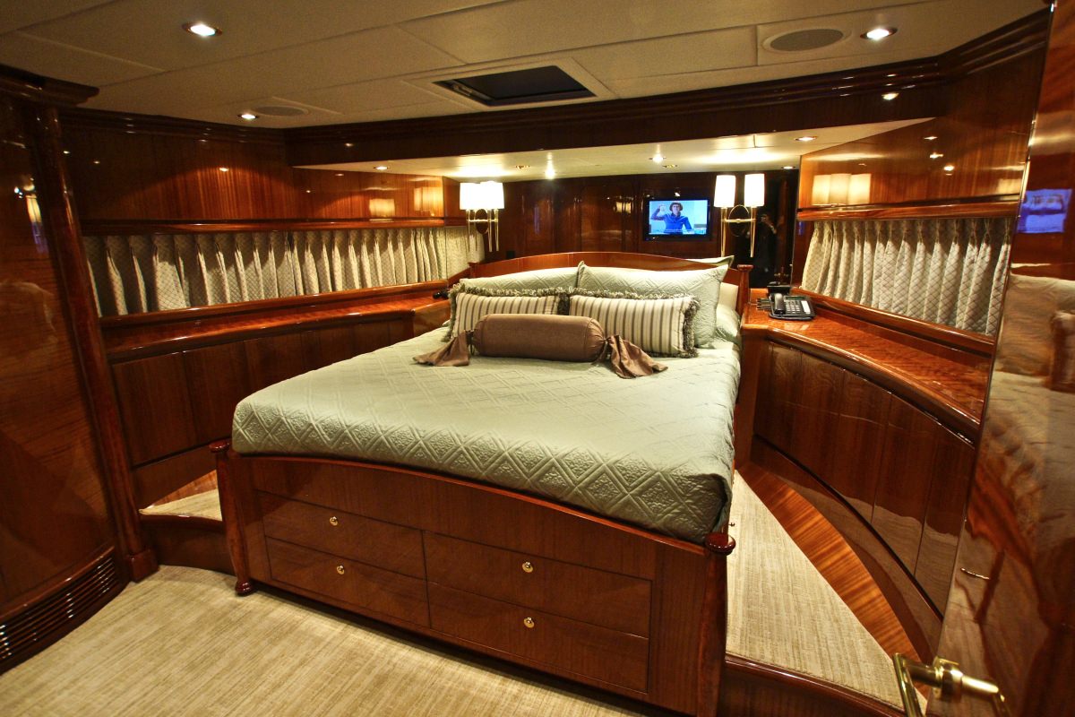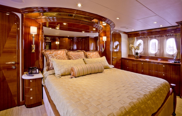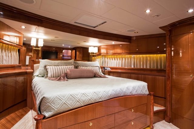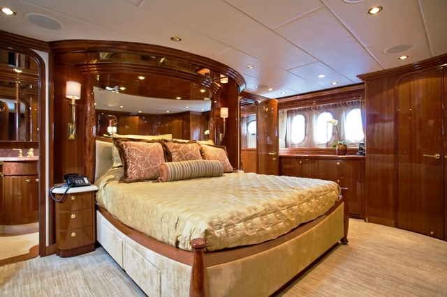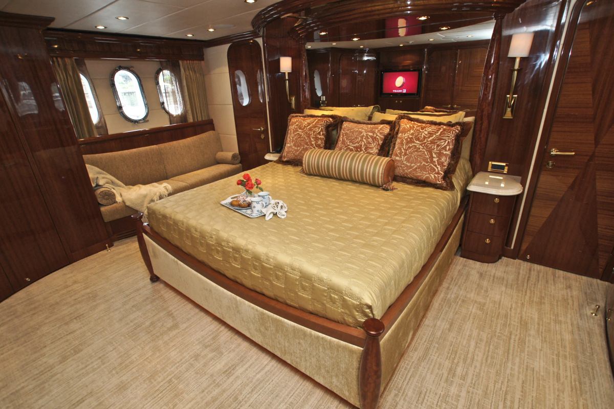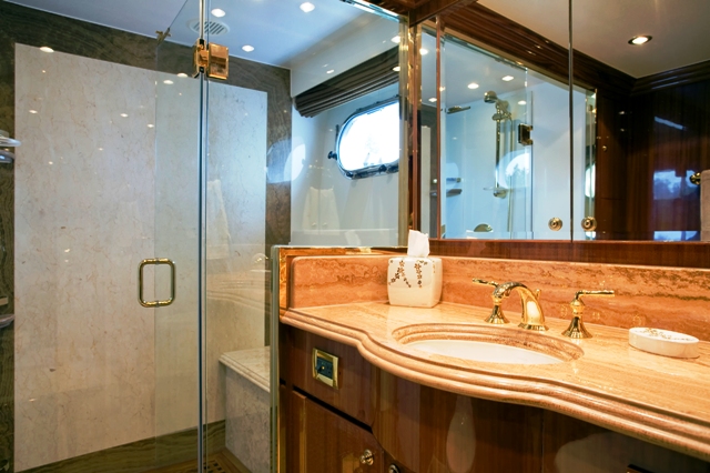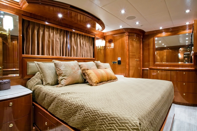 Accommodation is in 4 cabins, each with private en-suite facilities. The master stateroom is full beam of the yacht and amidships, with a king size bed, sofa, his and her facilities, which is joined by an oversized shower. The VIP cabin is full beam of the yacht forward with a queen size bed. A guest cabin offers a double bed, while a further guest cabin has side by side twin beds. All the cabins are meticulously finished with warm cherry woods, plush soft goods and marble fitted en-suites.
