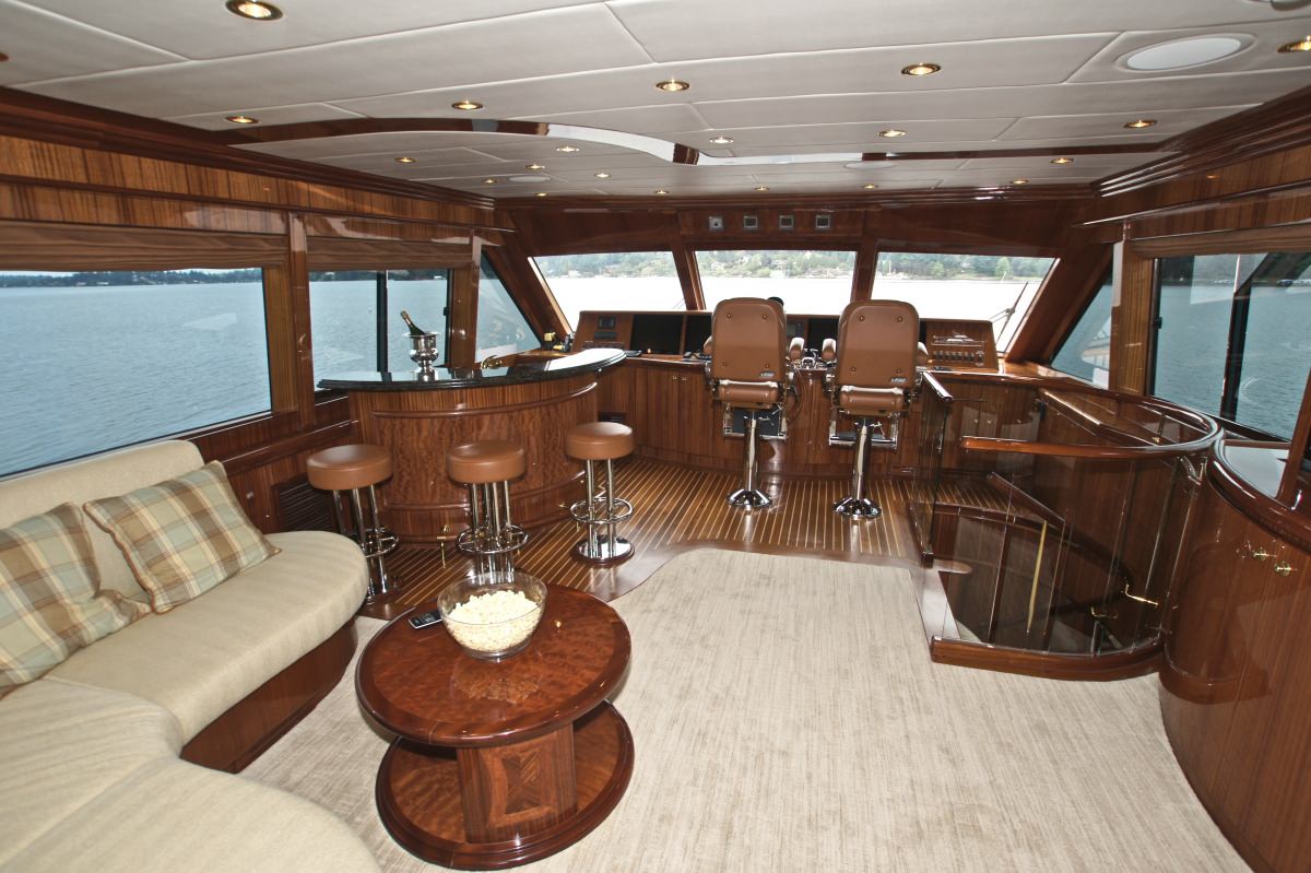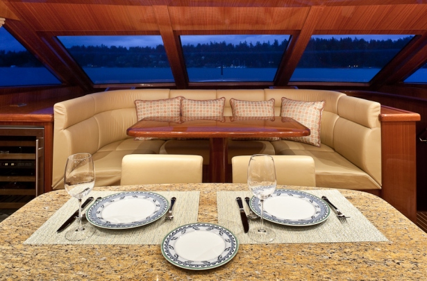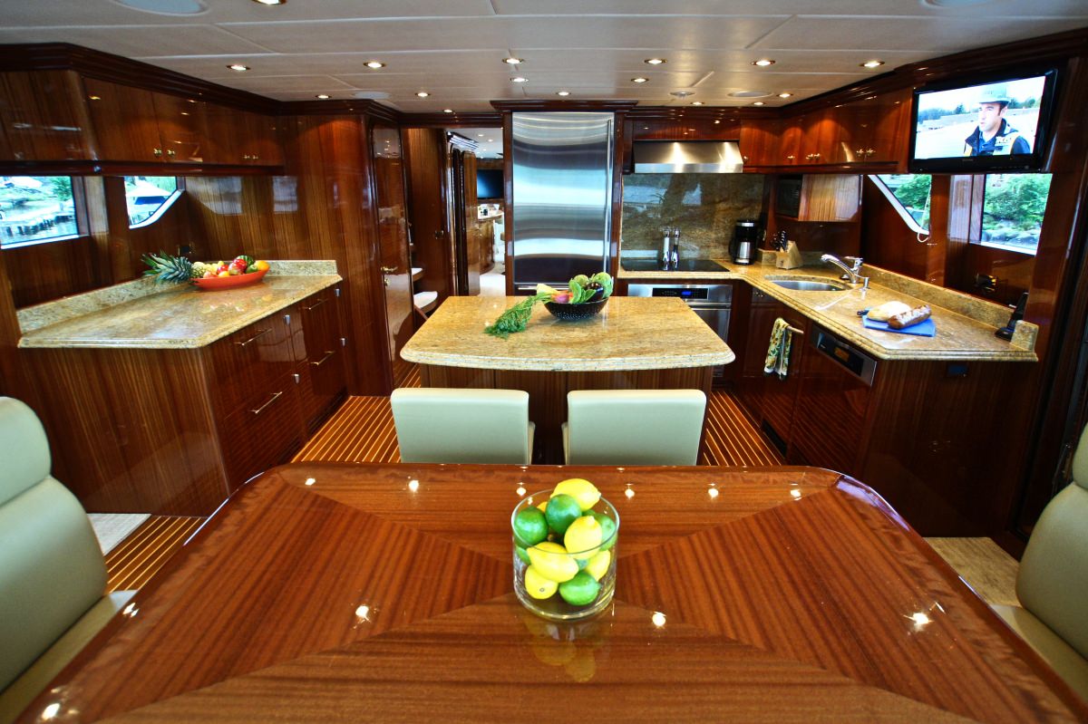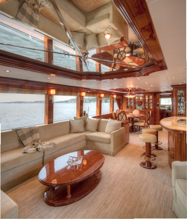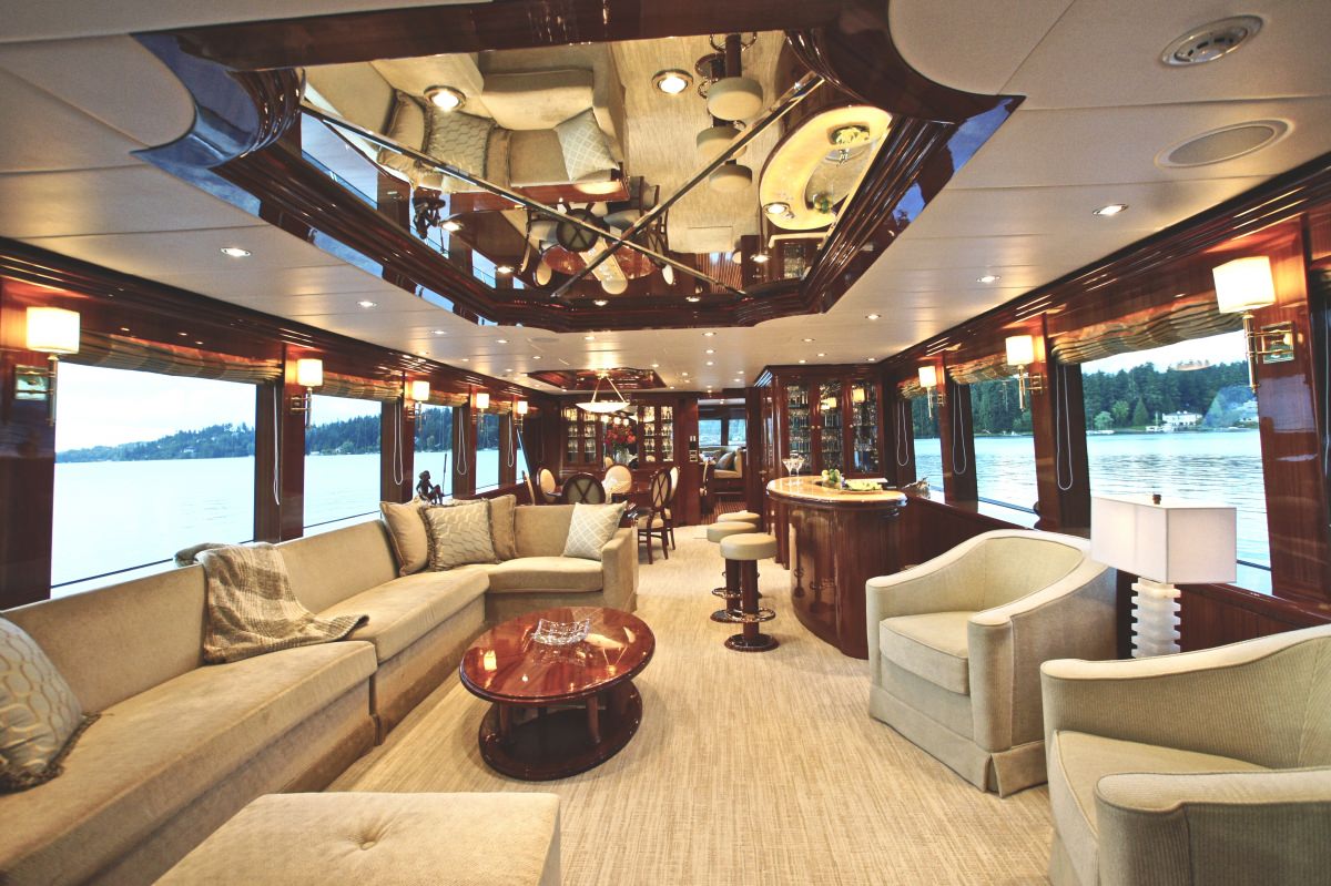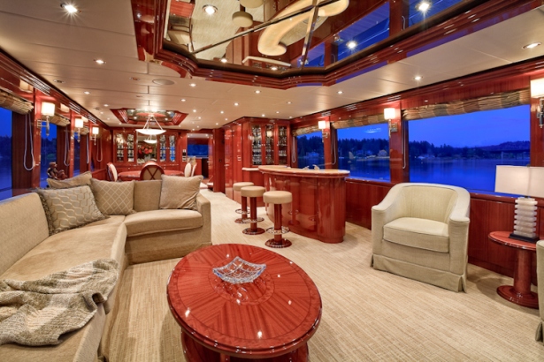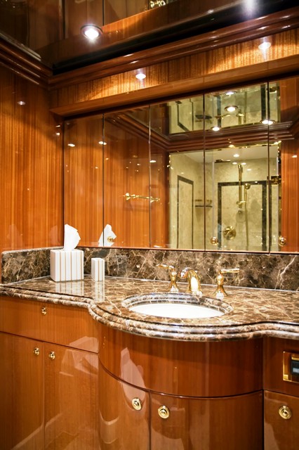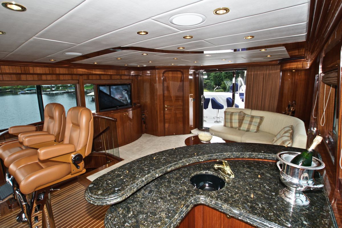 Accommodation is in 4 cabins, each with private en-suite facilities. The master stateroom is full beam of the yacht and amidships, with a king size bed, sofa, his and her facilities, which is joined by an oversized shower. The VIP cabin is full beam of the yacht forward with a queen size bed. A guest cabin offers a double bed, while a further guest cabin has side by side twin beds. All the cabins are meticulously finished with warm cherry woods, plush soft goods and marble fitted en-suites.