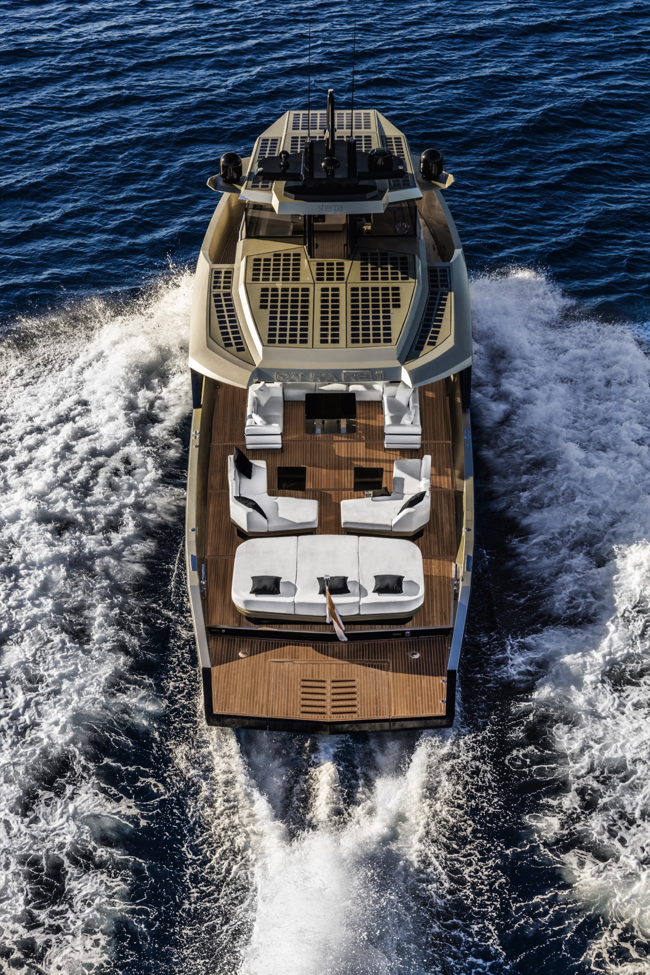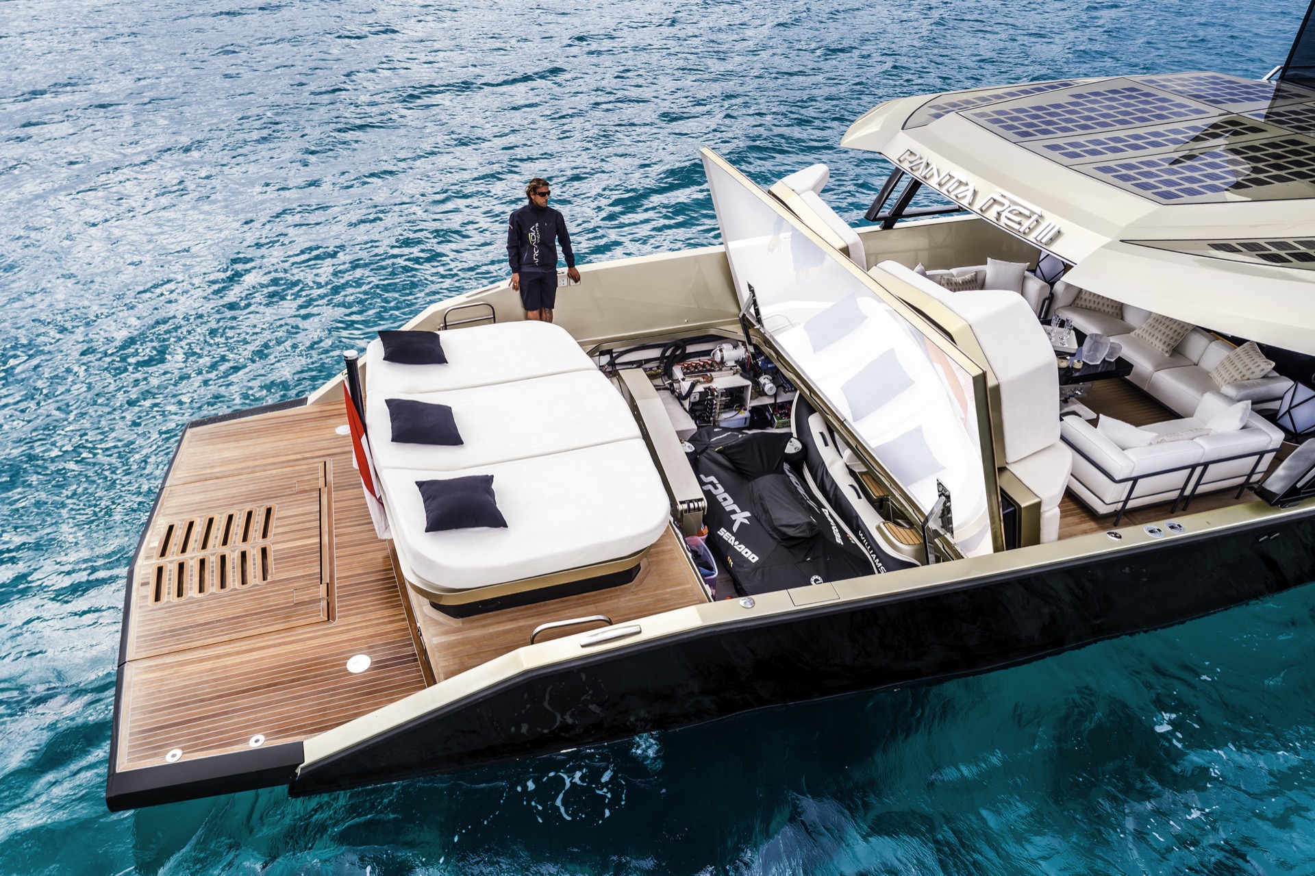 From the swim platform at the stern, guests can access the main deck aft where there is a broad sunpad, two L-shaped seating areas with drinks tables and an aft-facing sofa wrapping around a table for alfresco meals in the shade.