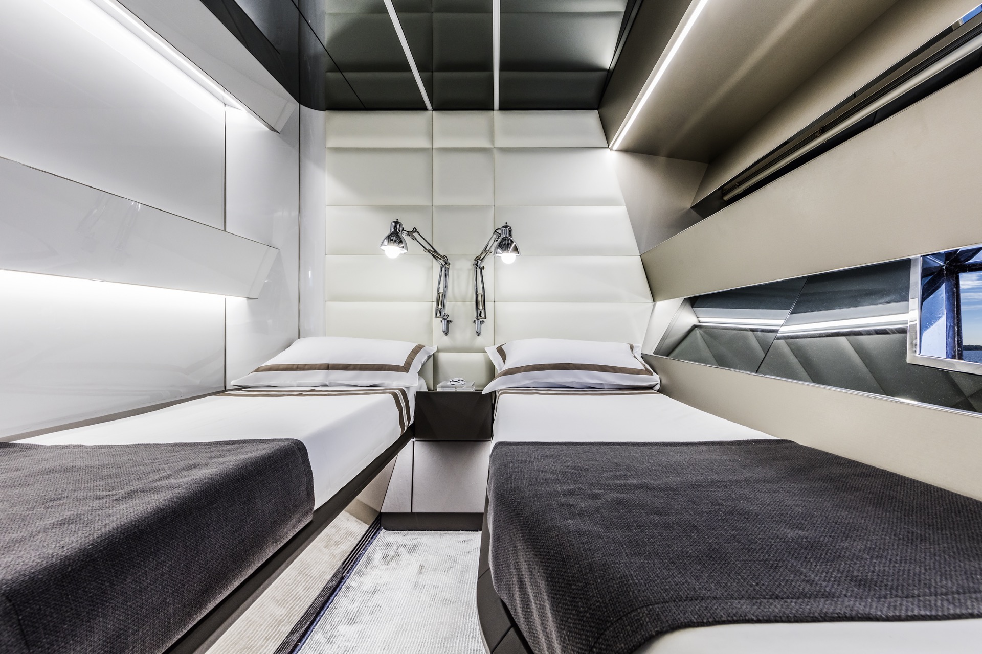 The accommodation is designed to sleep 2-4 guests depending on which layout the Owner chooses. The 4-person layout contains a Master suite and a twin cabin, both with en-suite facilities and located on the lower deck.