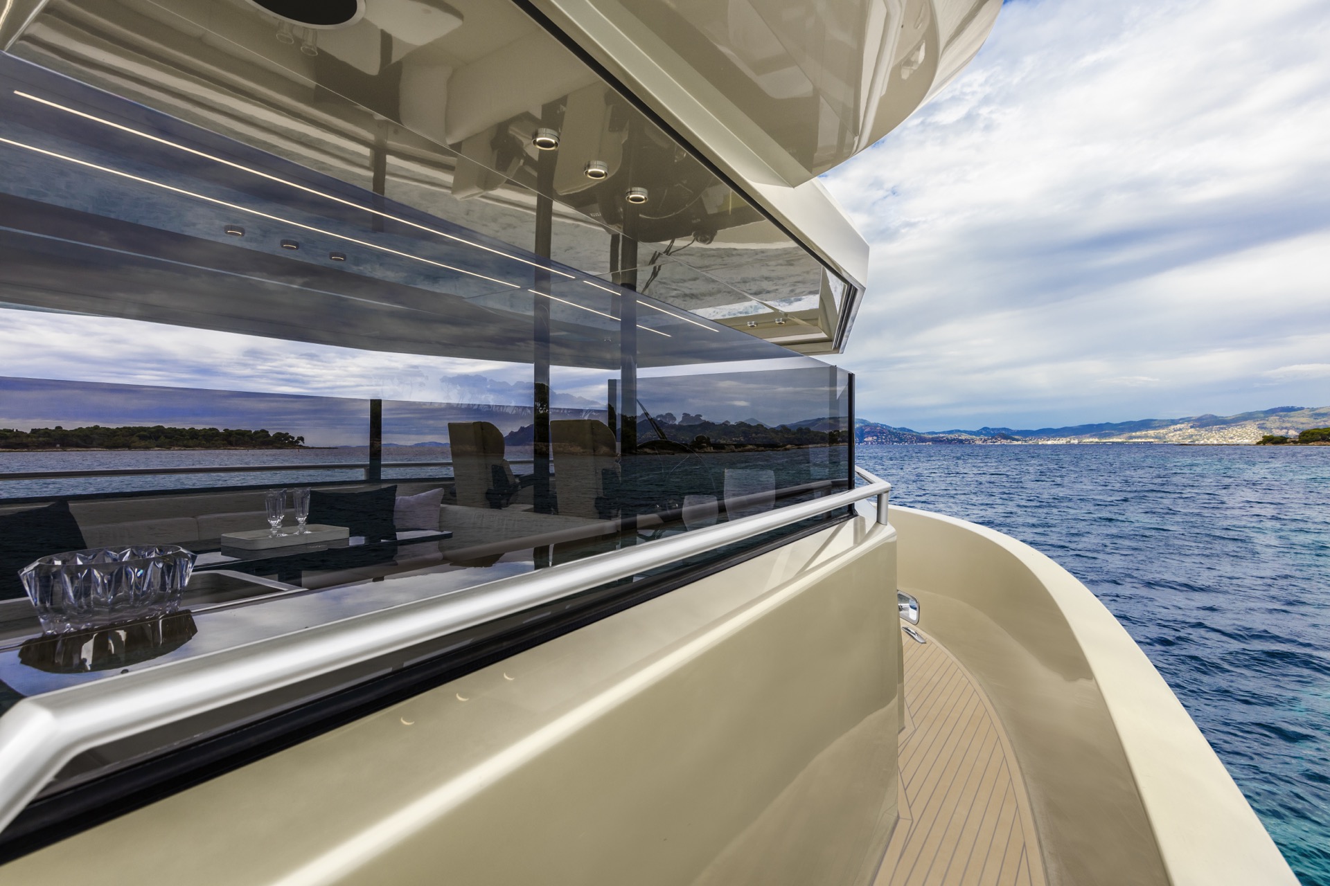 Guests can access the flybridge via a staircase on the starboard side, which leads up to a shaded lounge with drinks tables, and glazing surrounds the perimeter for outdoor relaxation in any weather.