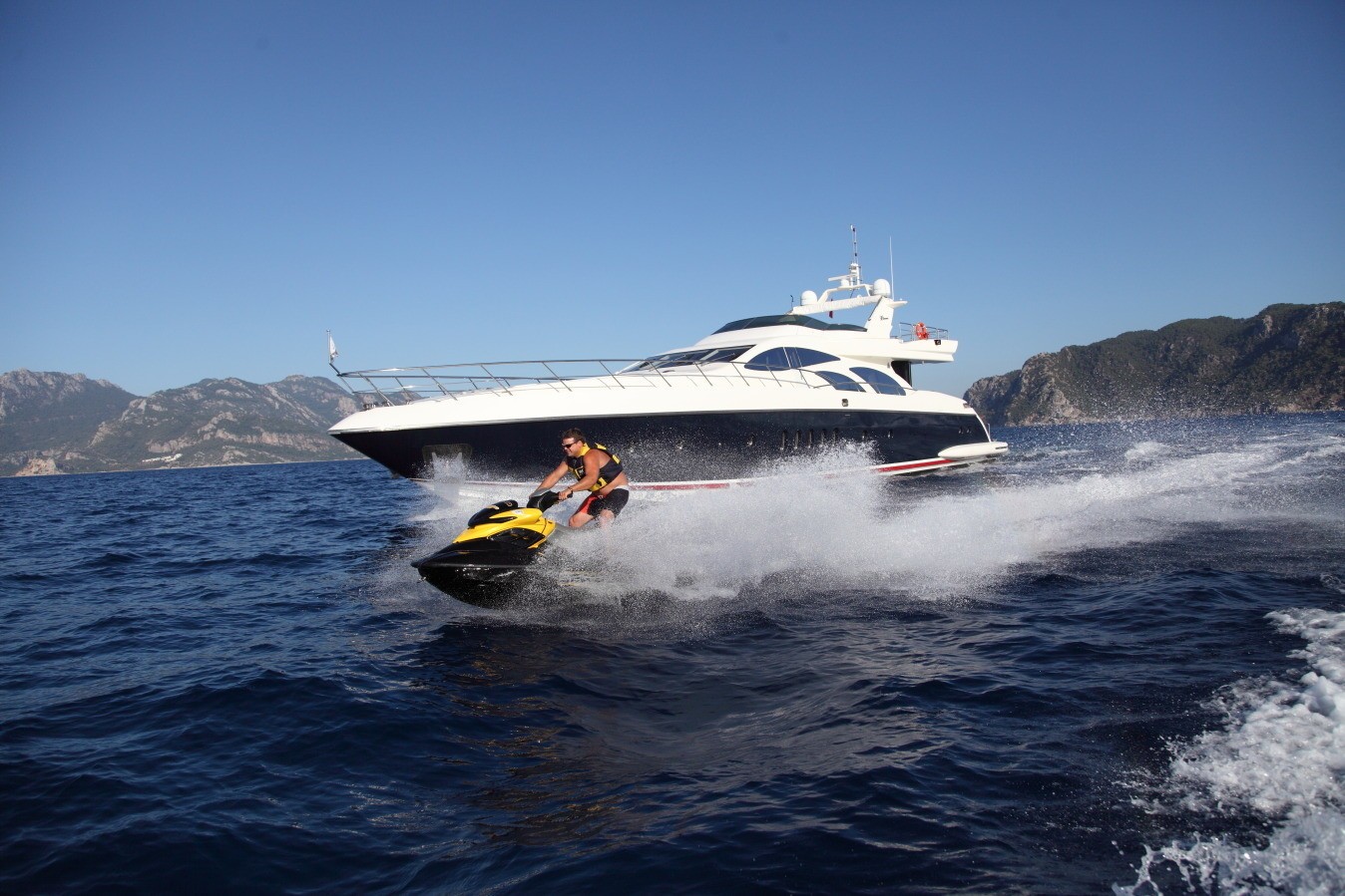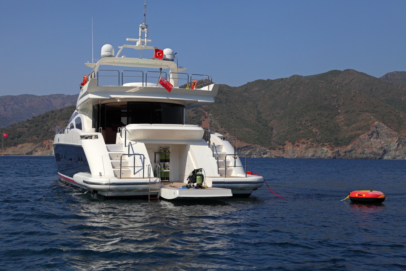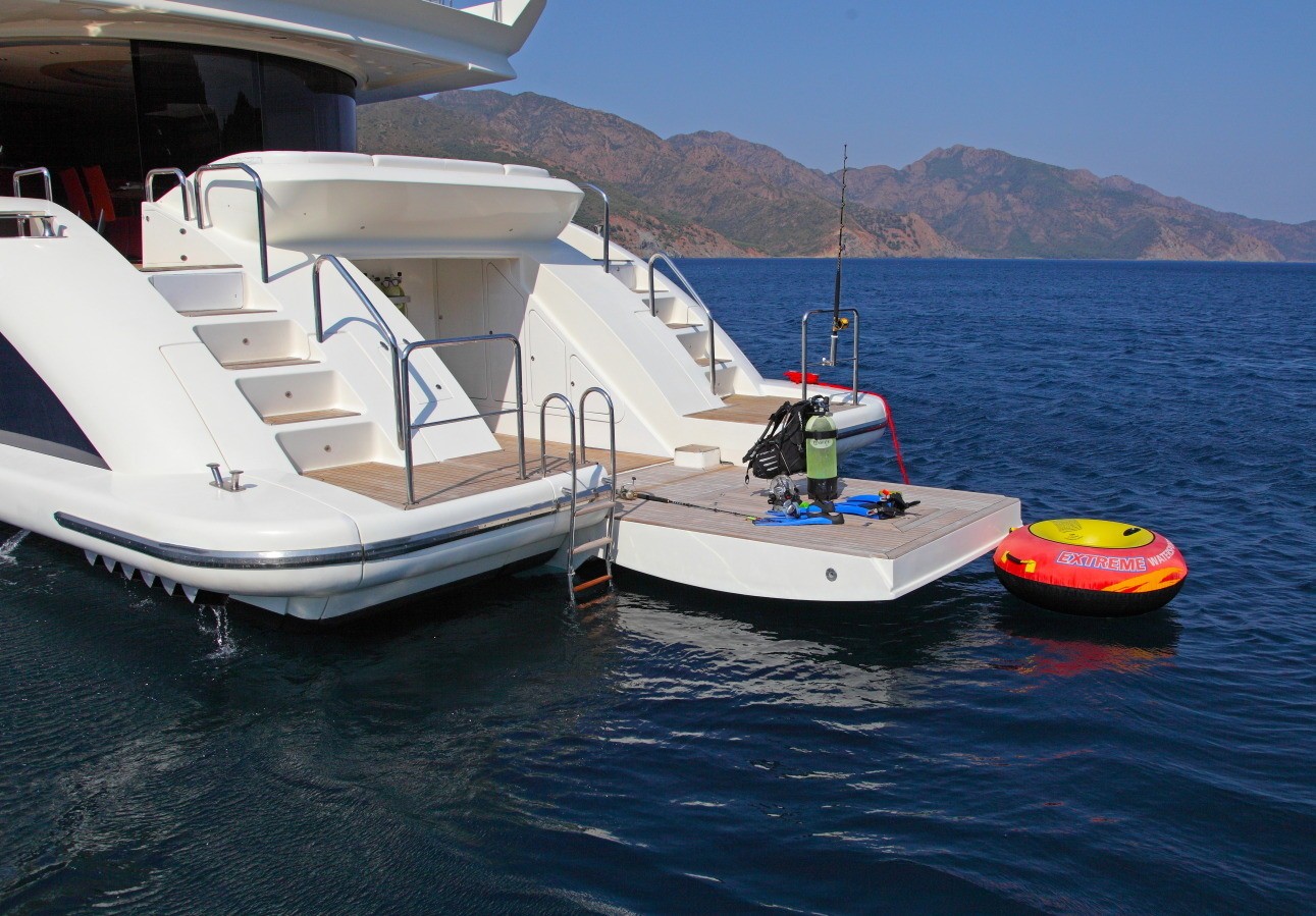 Water toys aboard the SKAZKA motor yacht include a Zodiac tender, jet ski, water skis and diving equipment. The Azimut yacht SKAZKA has a beam of 6.8m (22ft) and a draft of 2.5m (8.2ft).