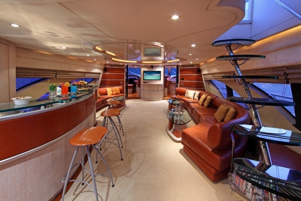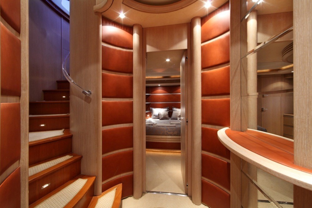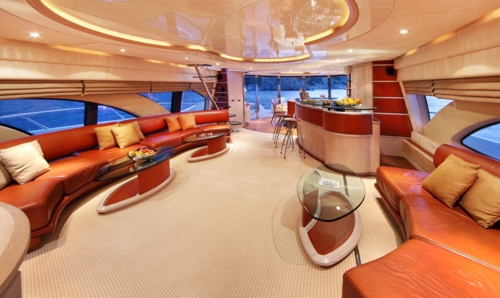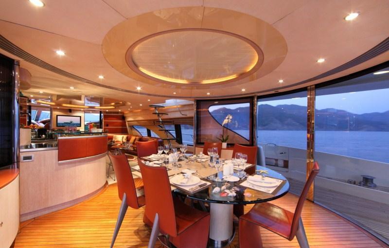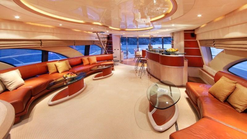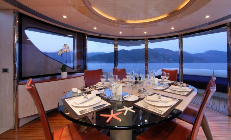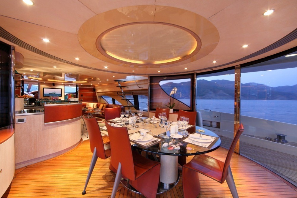 Yacht SKAZKA boasts a deluxe interior combining modern and retro styles seamlessly. The salon has an open airy ambiance with long windows, 2 amber toned leather sofas sit on the port and starboard side flanked by unique glass coffee tables. On the port side and aft of the salon lounge, a full wet bar is perfect for entertaining. Further aft guests will be impressed by the innovative dining experience; the formal dining table can be set indoors or opened up with circular glass doors to create a semi alfresco dining option.