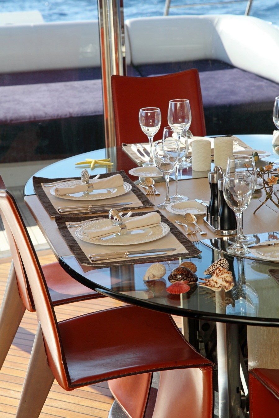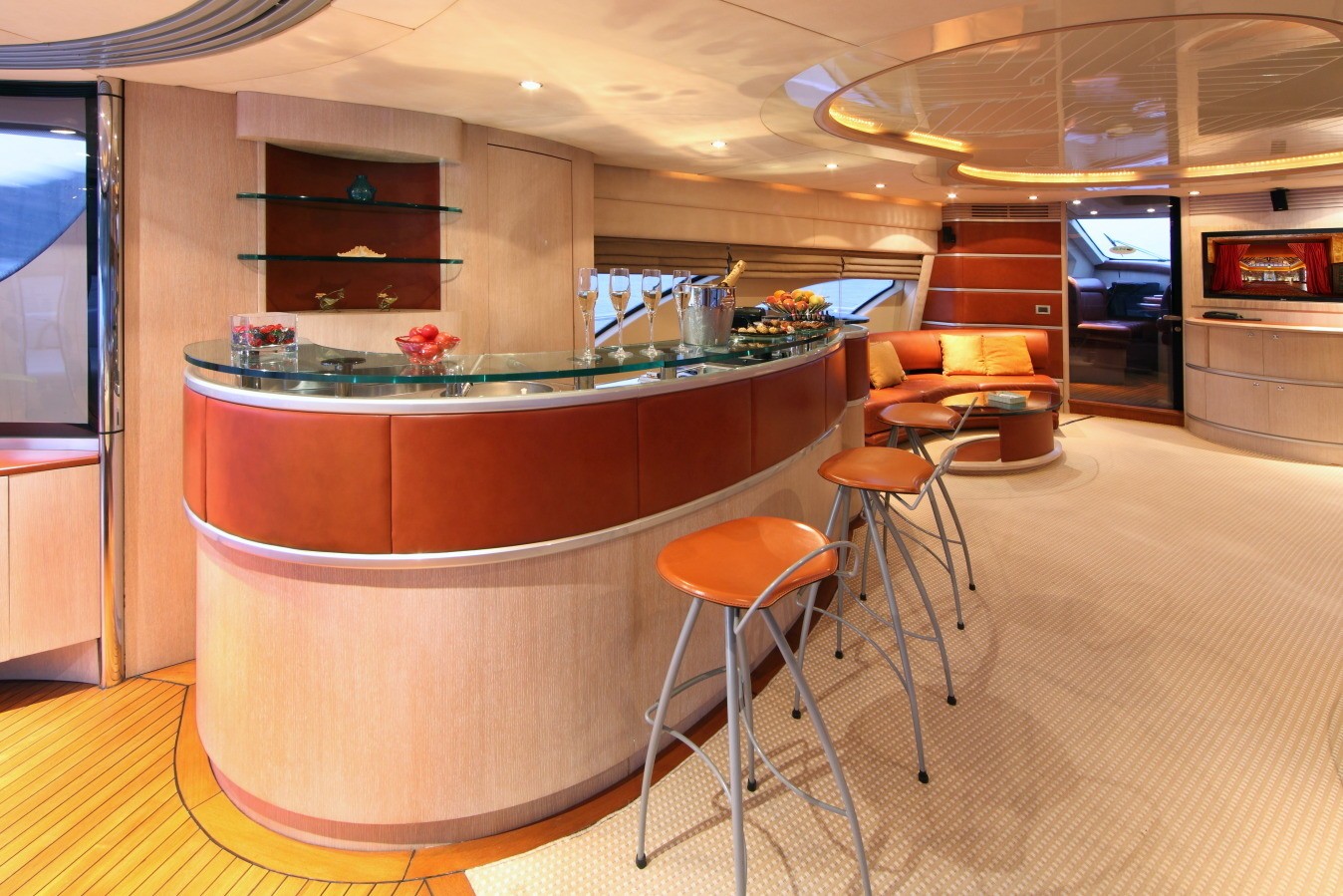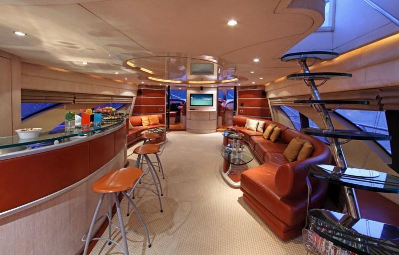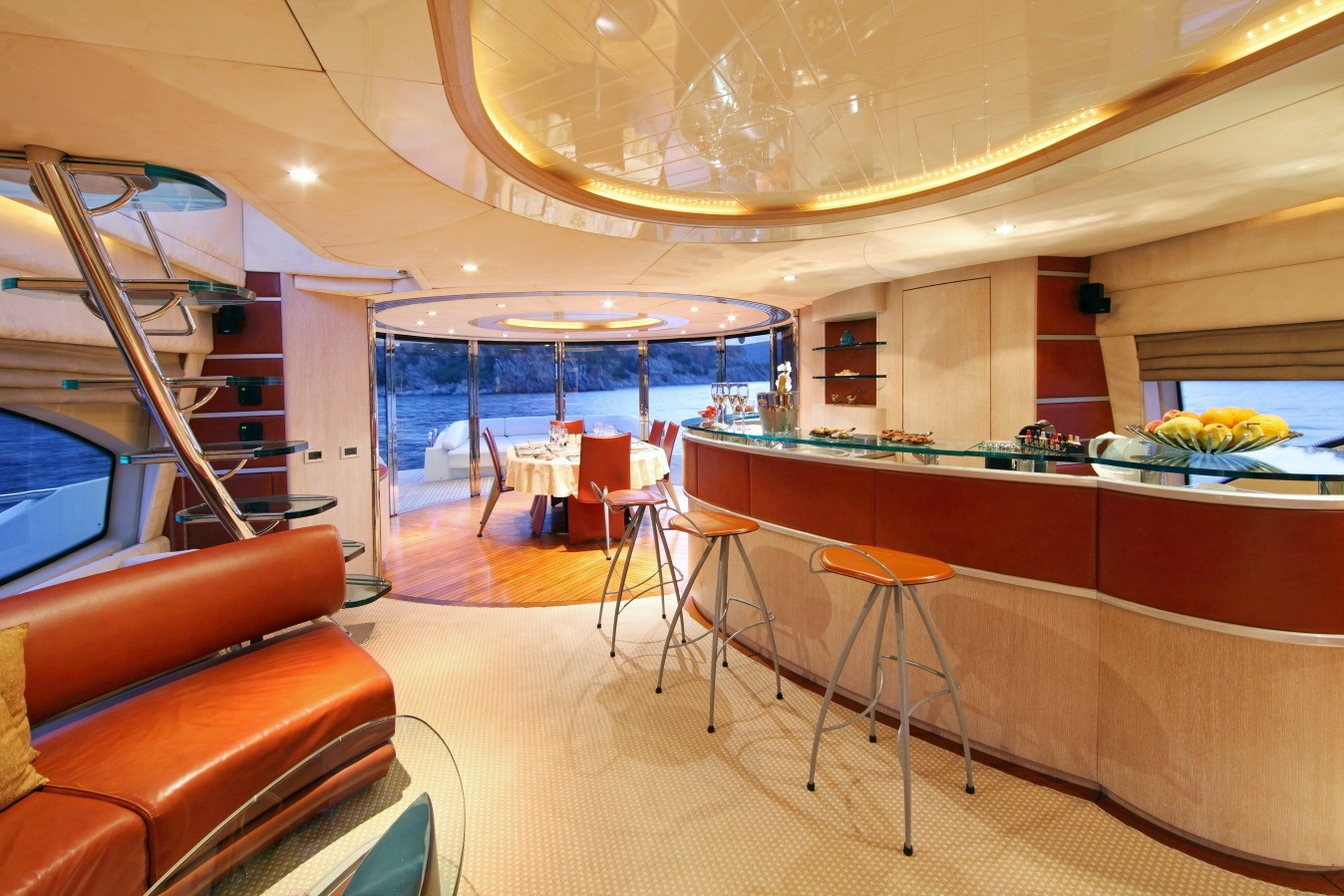 Yacht SKAZKA boasts a deluxe interior combining modern and retro styles seamlessly. The salon has an open airy ambiance with long windows, 2 amber toned leather sofas sit on the port and starboard side flanked by unique glass coffee tables. On the port side and aft of the salon lounge, a full wet bar is perfect for entertaining. Further aft guests will be impressed by the innovative dining experience; the formal dining table can be set indoors or opened up with circular glass doors to create a semi alfresco dining option.