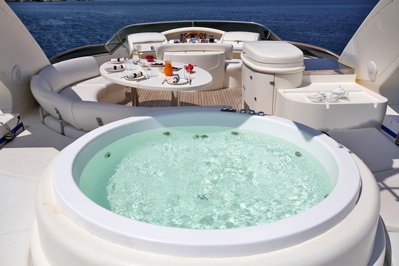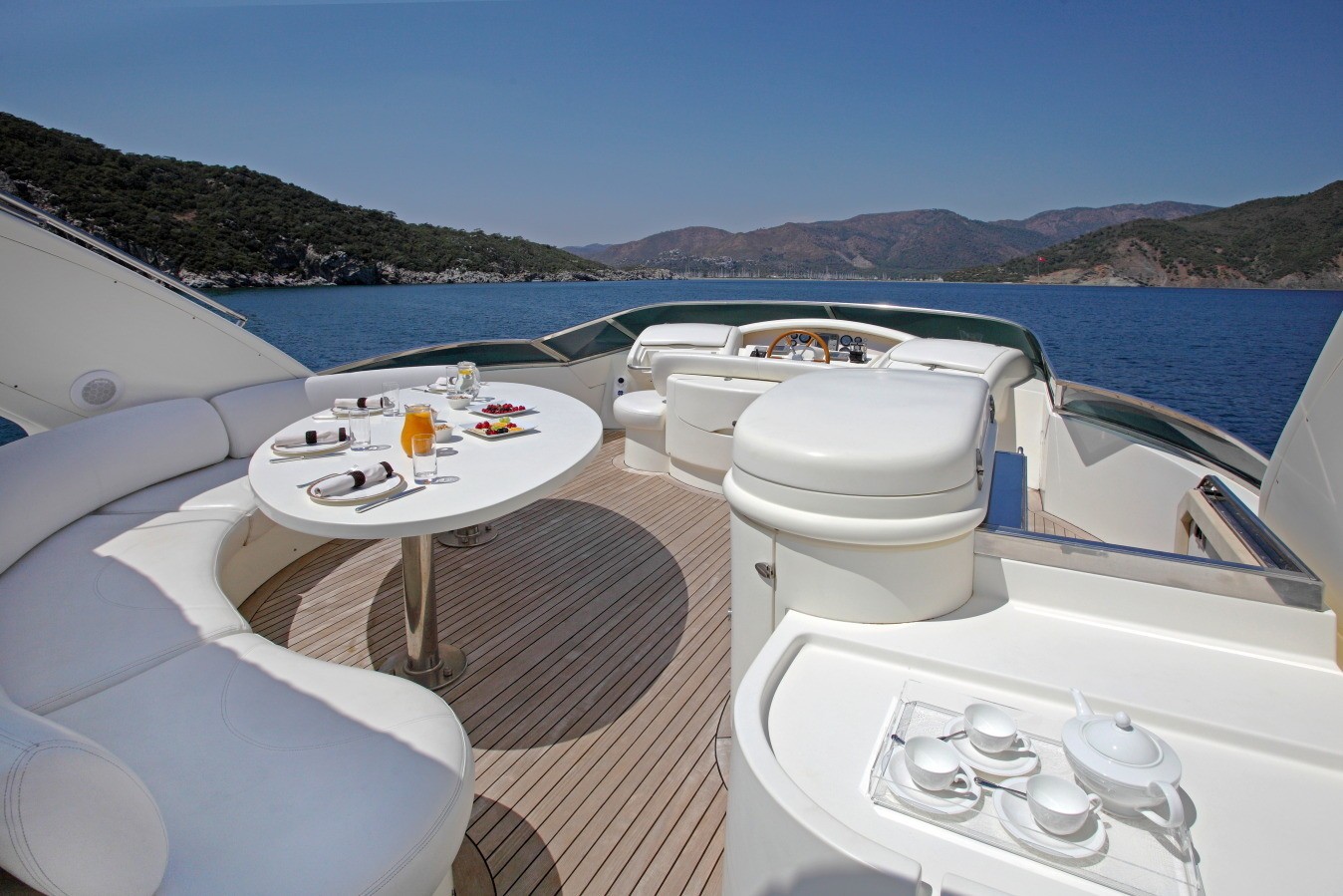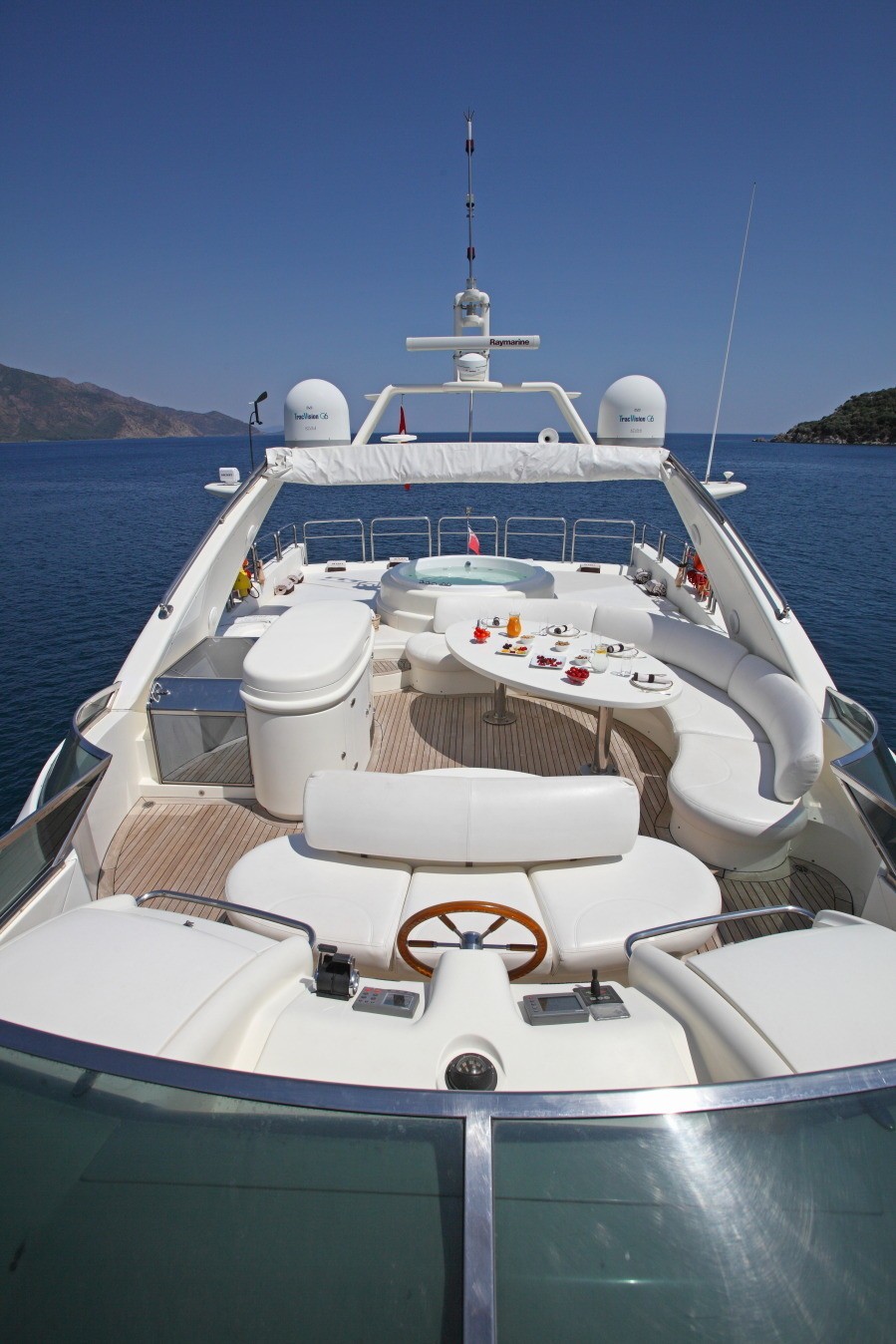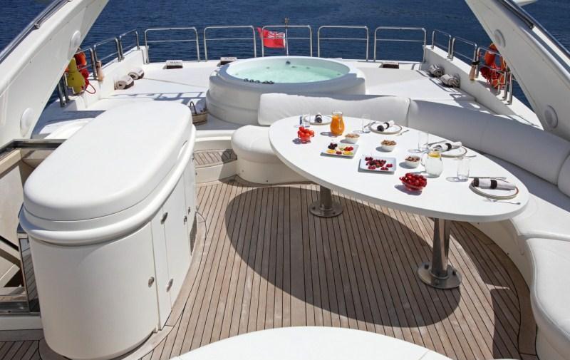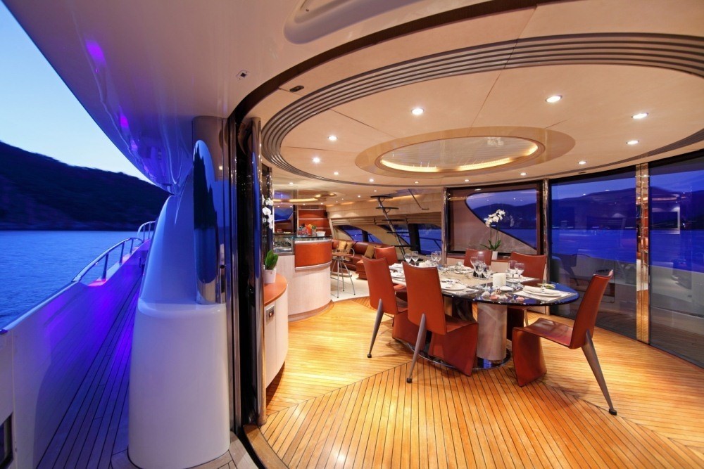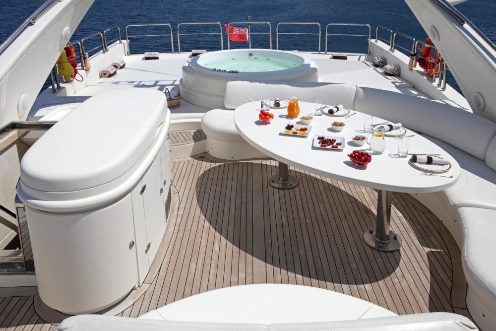 M/Y SKAZKA offers ample deck areas to enjoy. The aft deck has a large seating area to relax and sun, steps on port and starboard give easy access to the extended full beam swim platform. Motor Yacht SKAZKA boasts a generous flybridge complete with alfresco dining table, ample sunpads and luxurious Spa Pool tub.