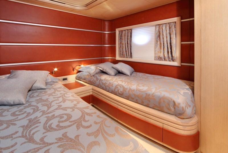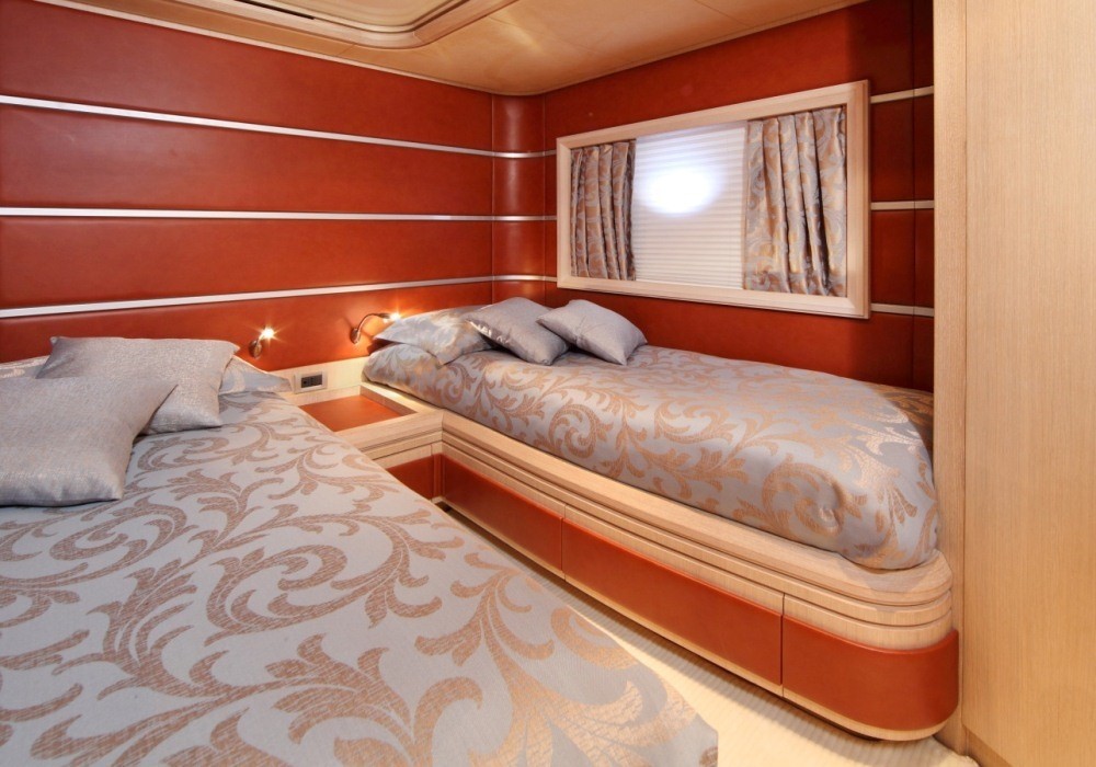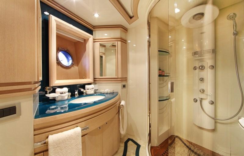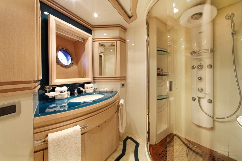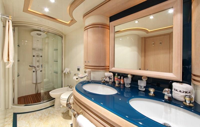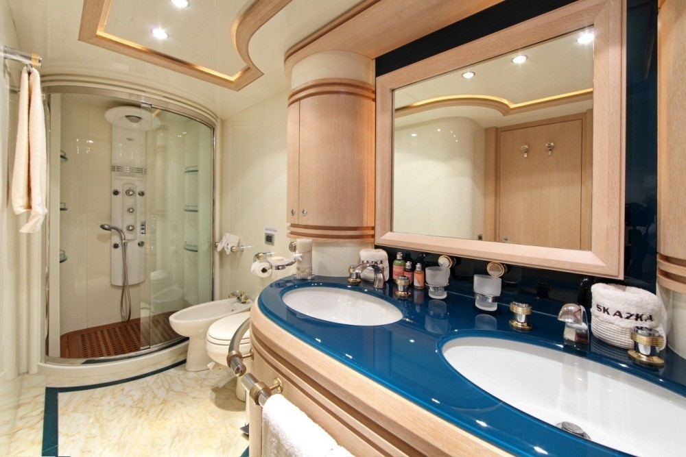 Luxury charter yacht SKAZKA accommodates 7 guests in one Master, one VIP and one twin cabin with a Pullman berth. The Master cabin is amidships and full beam of the yacht with a king size center lined bed. A VIP cabin is forward and full beam of the yacht with a king size bed. The twin cabin is on the port side with 2 single beds and a Pullman berth. All cabins have a tasteful neutral décor and offer en-suite facilities with fine marble and fabulous rain showers. SKAZKA is fully air conditioned throughout. SKAZKA´s crew has a separate companionway, heads and shower.