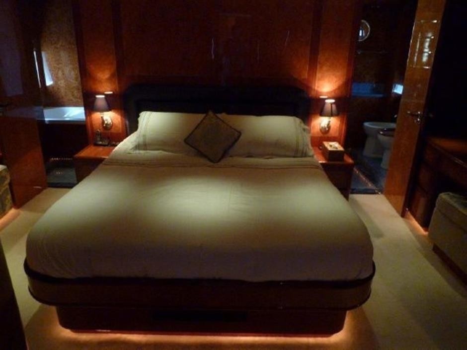 SVEA has an open feel salon which leads seamlessly to her teak decks from the aft deck through wide sliding glass doors. Two large sofas in an off white tone are both on port and starboard, an optional dining table is also available on the port side. Further forward a smaller cocktail table is directly behind the 4 helm chairs where guests can enjoy a front row seat to a captains view. Surrounding windows allow ample natural light and optimum sightseeing. Below decks a further cozier salon is amidships with comfortable seating, custom Leopard windows receive plenty of natural light.