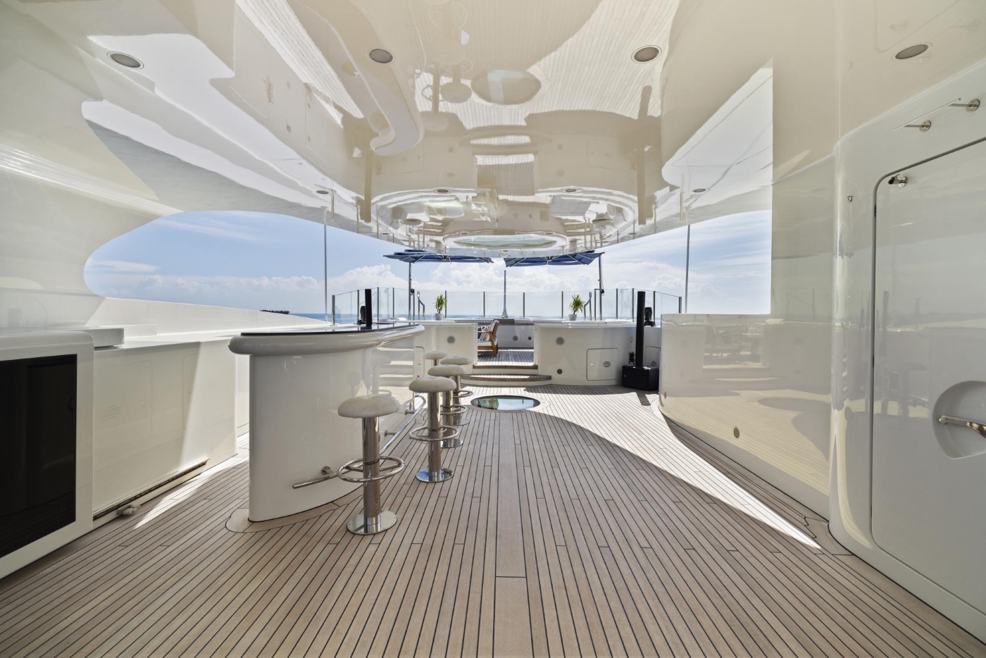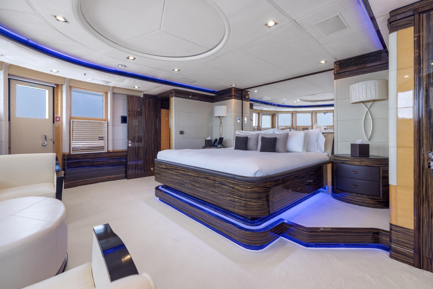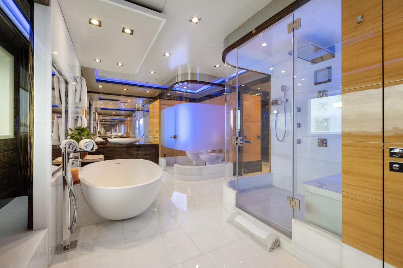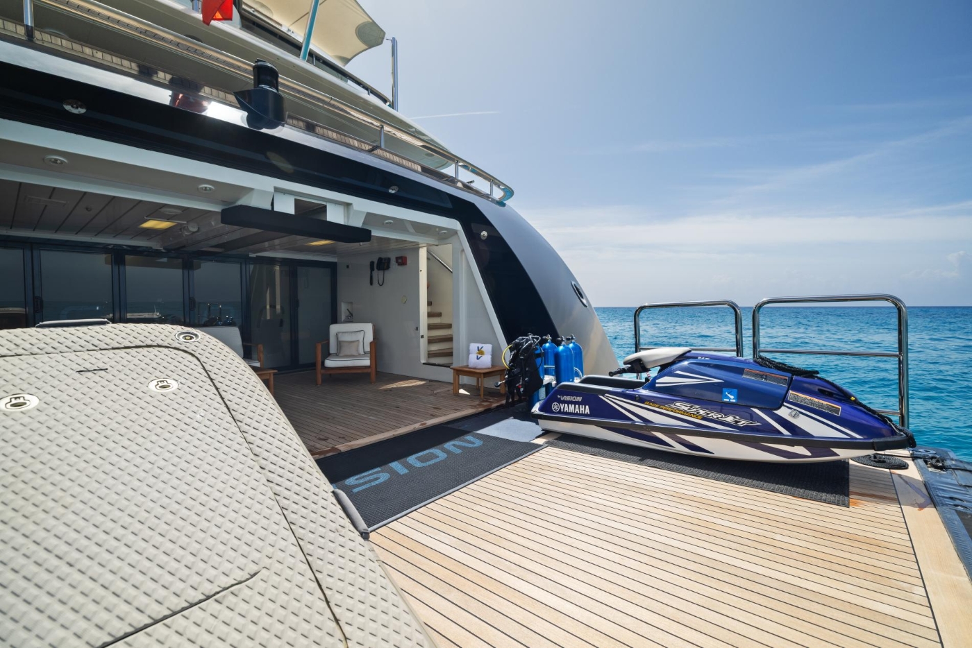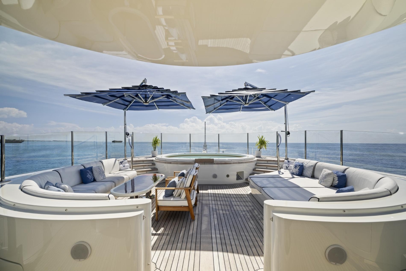 NOTABLE FEATURES: fab sun deck with 8 pax Jacuzzi ~ plenty of sun loungers ~ alfresco dining options ~ large main saloon with plenty of seating ~ full-beam master suite ~ VIP stateroom with sauna ~ disco area ~ Big screen on the main deck ~ amazing water toys selection including a water slide