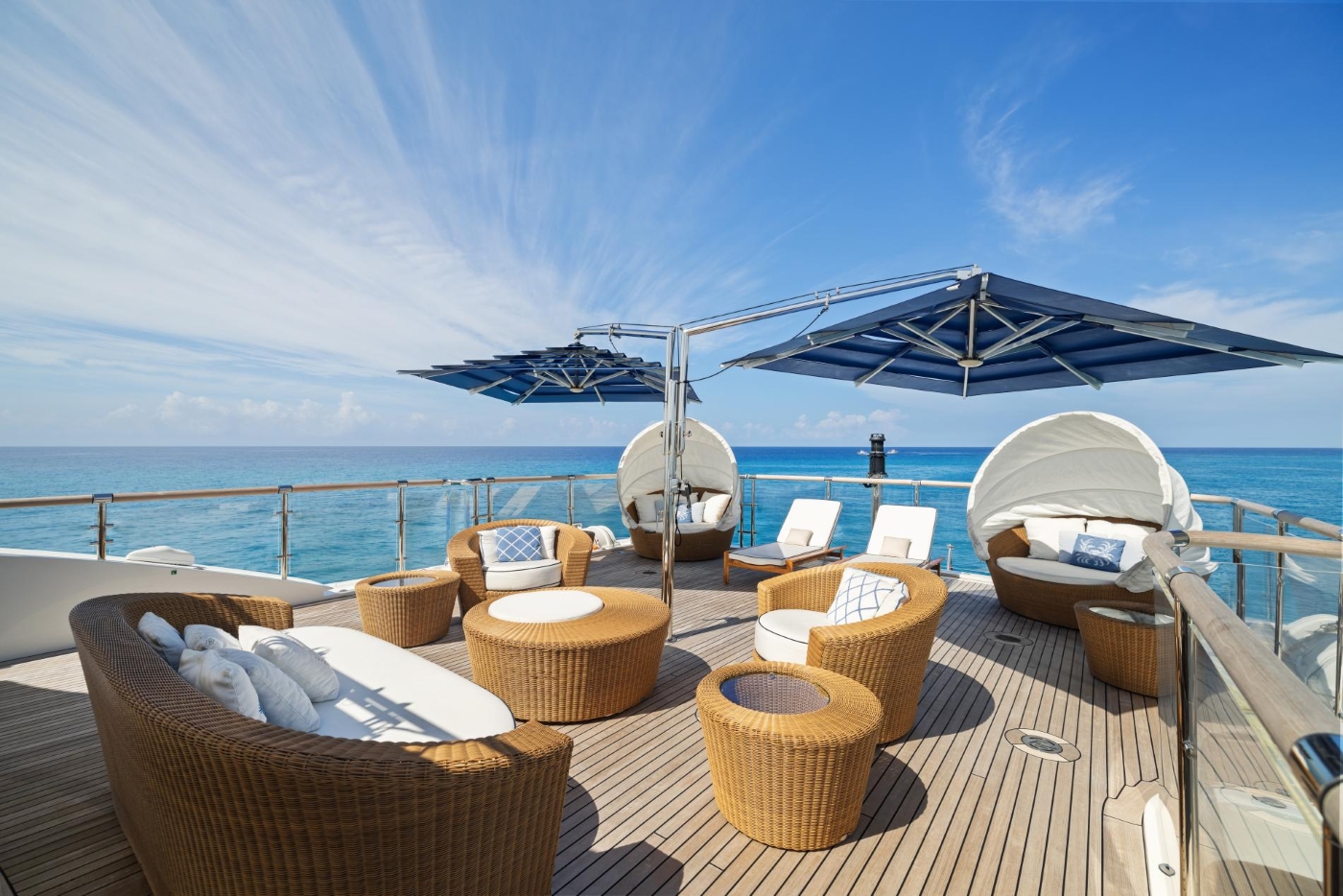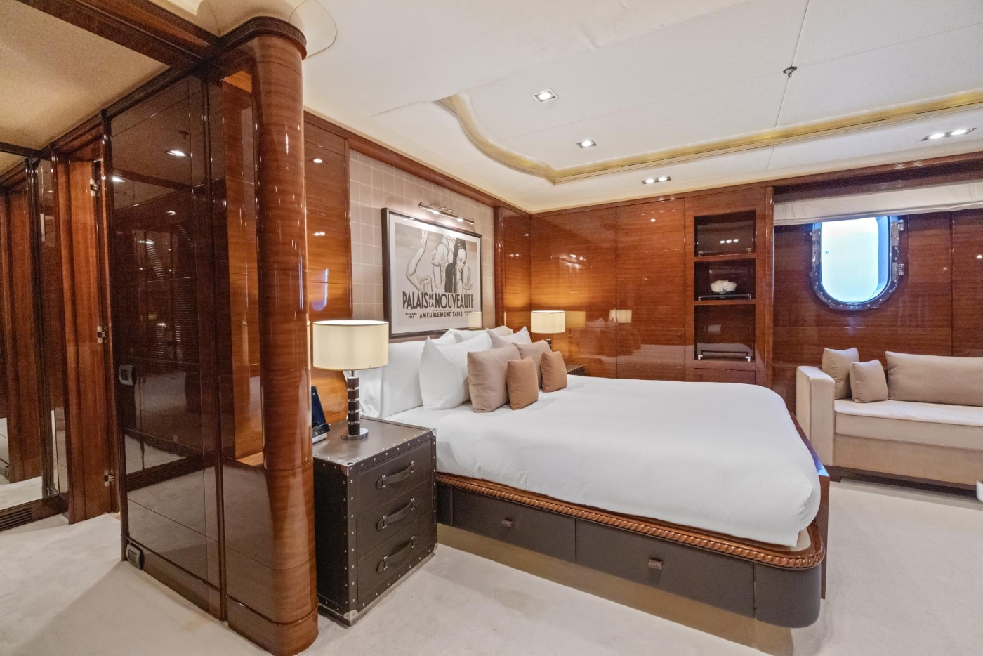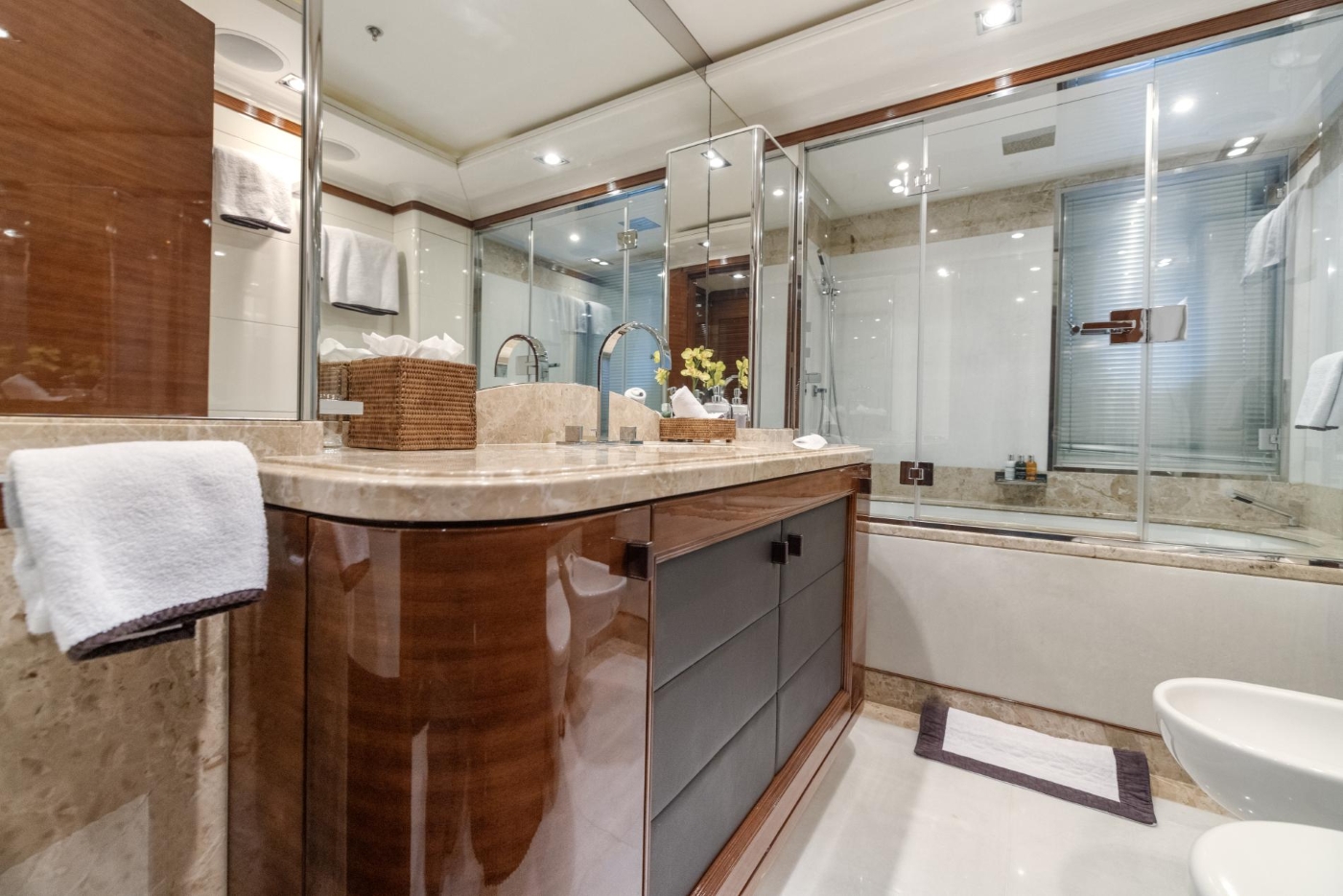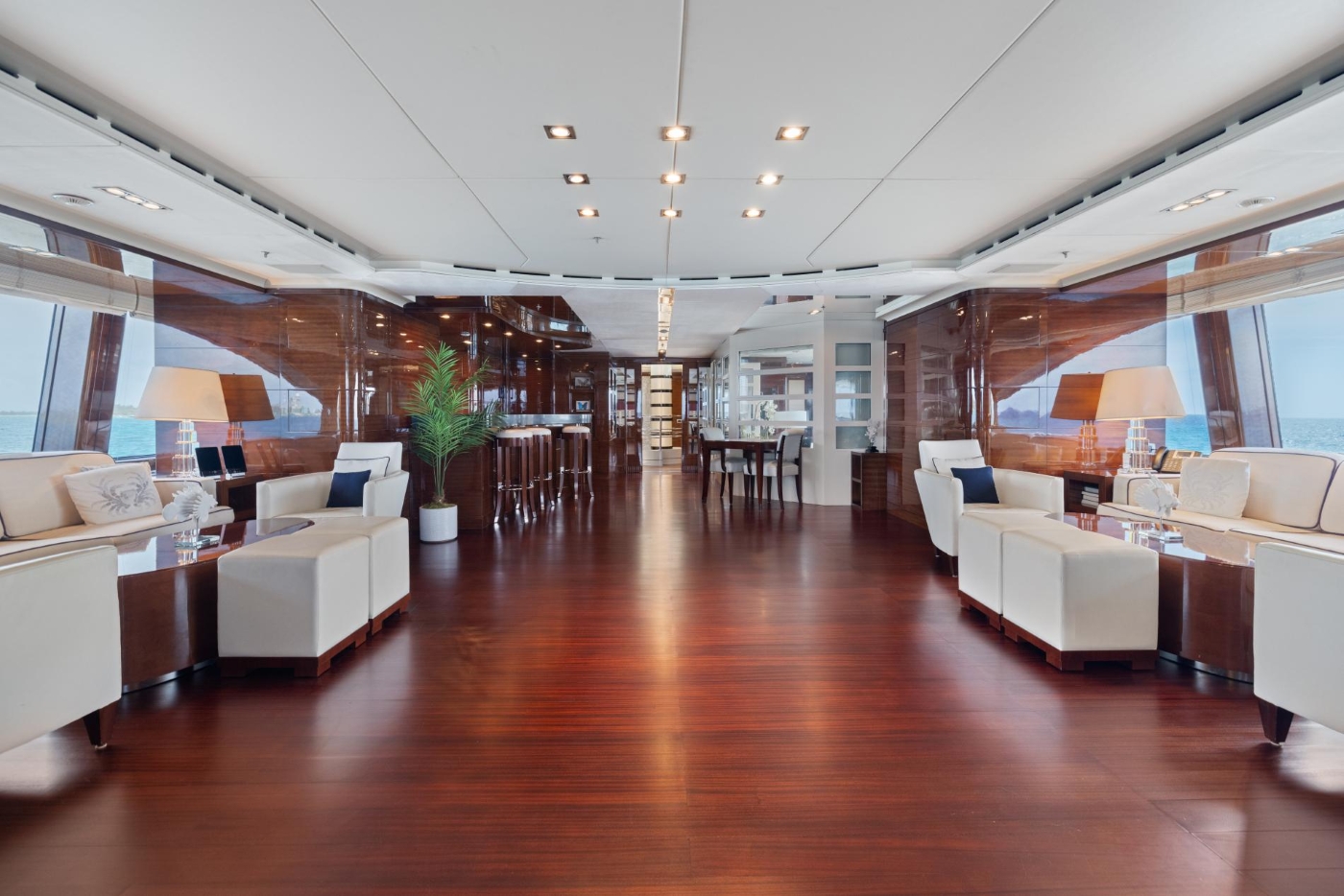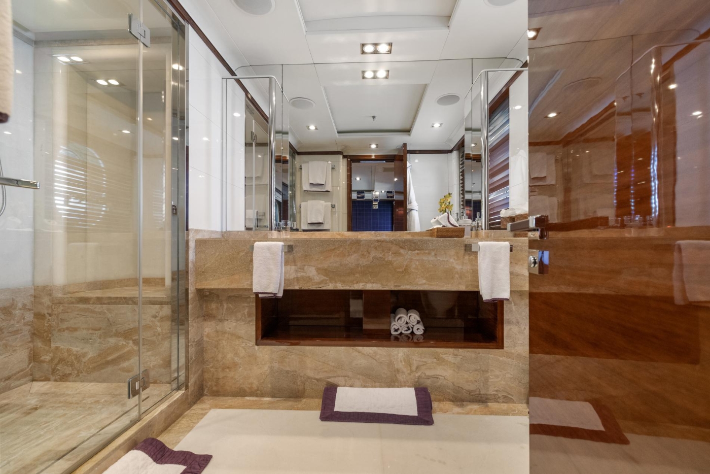 NOTABLE FEATURES: fab sun deck with 8 pax Jacuzzi ~ plenty of sun loungers ~ alfresco dining options ~ large main saloon with plenty of seating ~ full-beam master suite ~ VIP stateroom with sauna ~ disco area ~ Big screen on the main deck ~ amazing water toys selection including a water slide