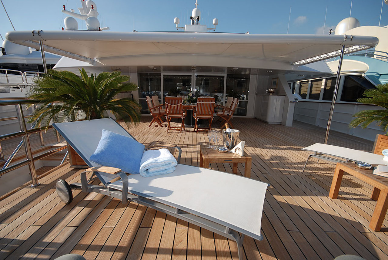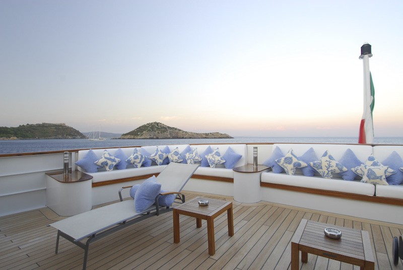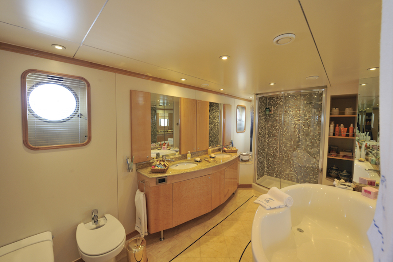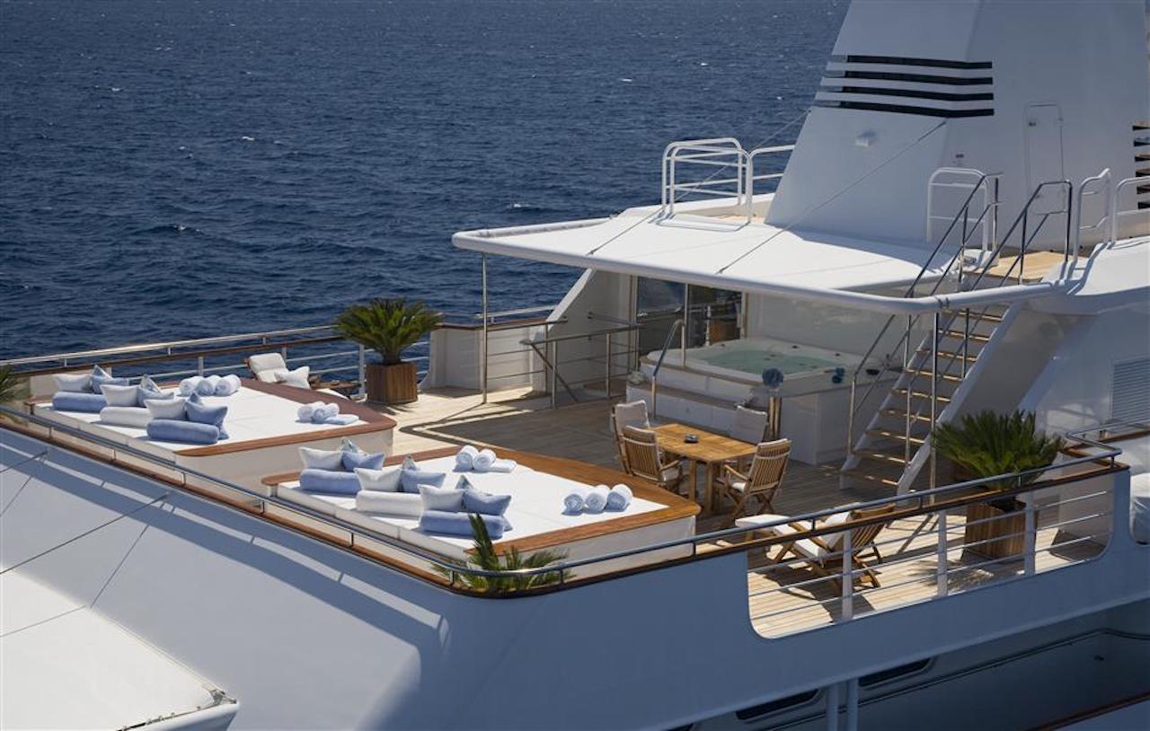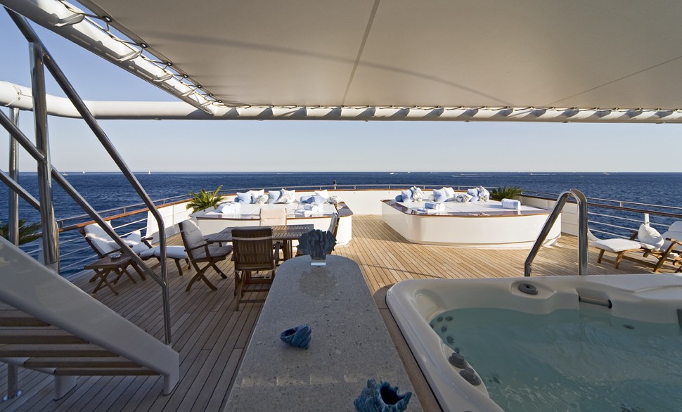 Luxury yacht TITAN went through a major exterior refit in 07/08. The hull was repainted blue Boero (opac finish/semilucida), and the exterior is being retouched in white. An additional sun deck was added with a bar and a barbeque. The interior was refitted in 2004 by the Owner; new fabric, new furniture…etc. This new interior has a very welcoming and luxurious touch with an Italian twist. The Owner took special care in choosing the fabrics and the decorative elements. SUN DECK: New tables 2m long. New cushions for the sun beds New bar New 3 x square parasols New Spa Pool Working on creating an indoor small spa area with gym.