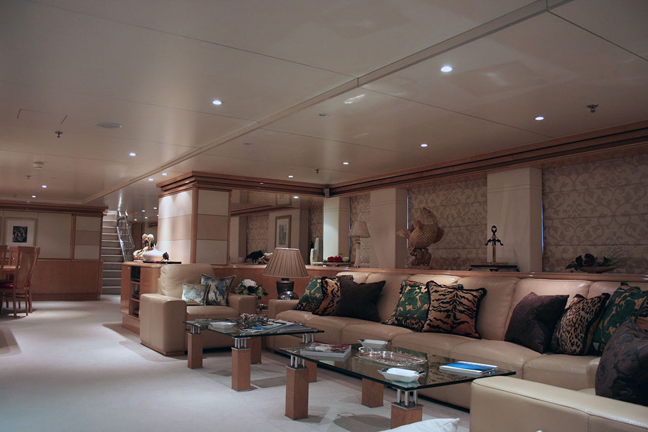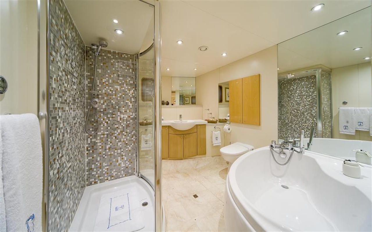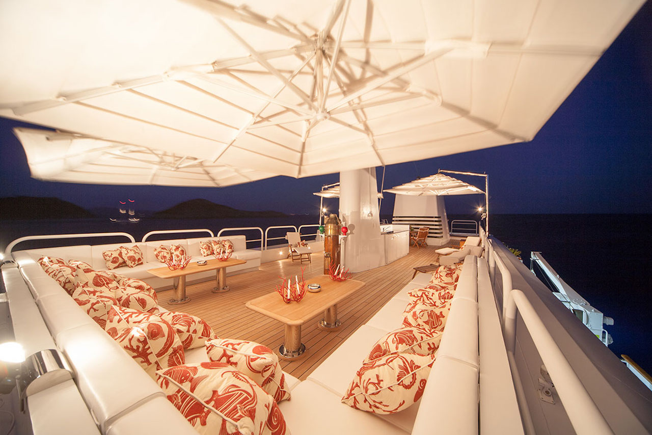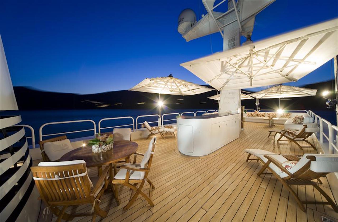 Luxury yacht TITAN went through a major exterior refit in 07/08. The hull was repainted blue Boero (opac finish/semilucida), and the exterior is being retouched in white. An additional sun deck was added with a bar and a barbeque. The interior was refitted in 2004 by the Owner; new fabric, new furniture…etc. This new interior has a very welcoming and luxurious touch with an Italian twist. The Owner took special care in choosing the fabrics and the decorative elements. SUN DECK: New tables 2m long. New cushions for the sun beds New bar New 3 x square parasols New Spa Pool Working on creating an indoor small spa area with gym.