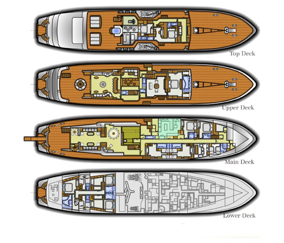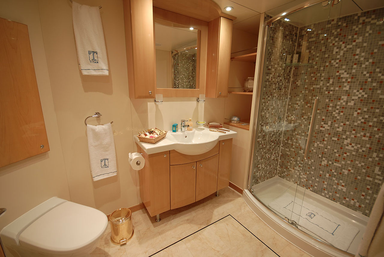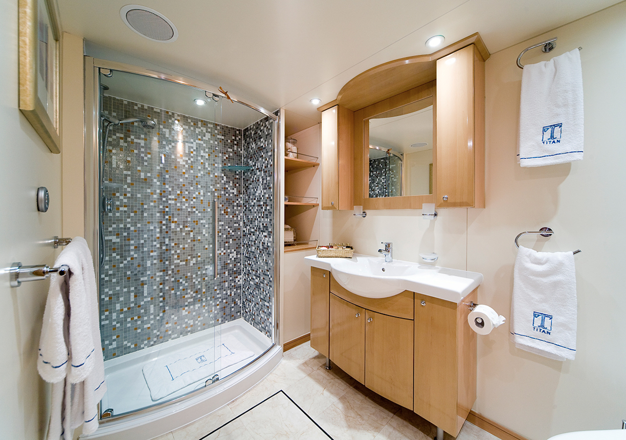 Mediterranean luxury yacht Titan accommodates 22 charter guests comfortably in six double and five twin large and light staterooms. Guest Accommodation -Master cabin: Upper deck. King size +. Private salon and his & hers bathroom. Shower + tub with hydromassage. -5 double cabins: 2 main deck and 3 lower deck. (VIP - tub) -5 twin cabins: 3 main deck and 2 lower deck. Showers. All cabins are equipped with phones for interior and exterior calls. MAIN DECK Main salon with ample seating area on both sides. Home cinema with a sliding down screen a projector (connected to a DVD player and SKY). Dining table for up to 14/16 guests. 2 double cabins and 3 twin cabins forward. Galley & pentry. LOWER DECK 2 double cabins, 1 VIP with tub and 2 twins. The cabins are connected through 2 stairsways, one at the aft entrance, and another by the dining table. UPPER DECK Upper deck salon with large bar. Private salon in the back. Alfresco dining for up to 16?18. 1 side table for 4. Seated area. Master cabin forward with Owner salon. SUNDECK Large sun beds (fixed). 1 table for 4. One Spa Pool. Gym with a treadmill, bicycle, elliptical machine, power plate, weights, mats, massage table (all tecnogym). UPPER SUNDECK Brand new addition. Bar with a barbecue, ice maker and fridge. Comfortable seating area forward with large parasols. 2 sun chairs.