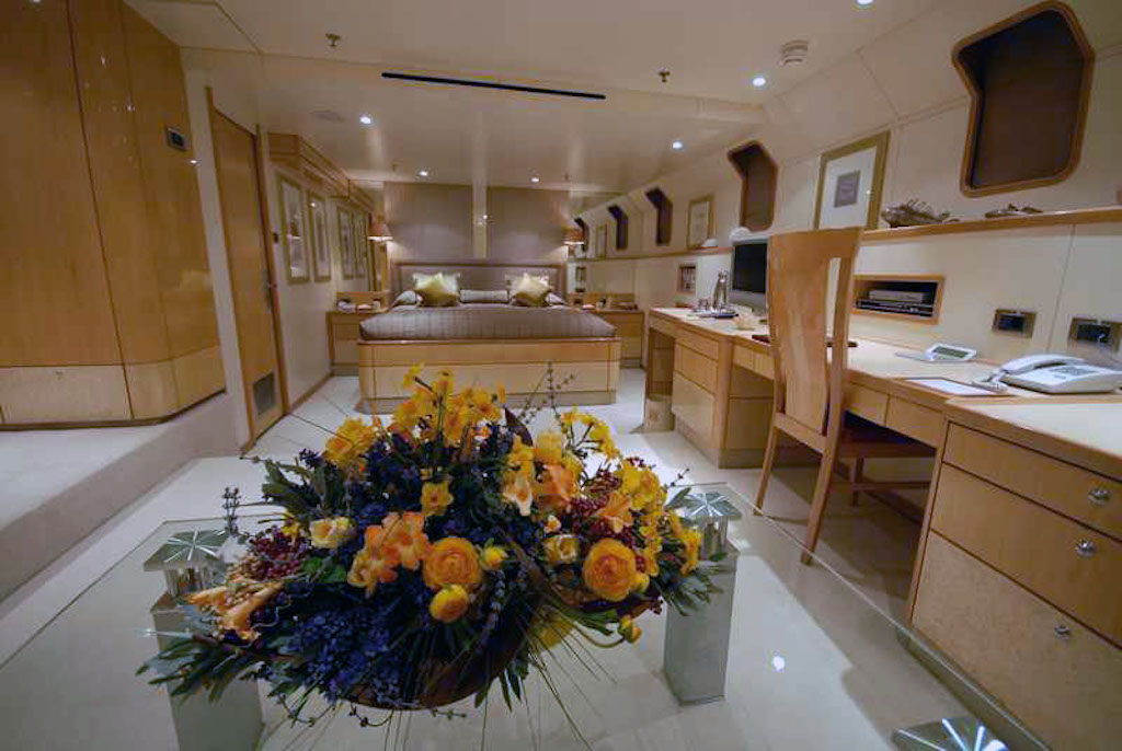 The luxury yacht’s interior is finished in a contemporary English style with beech wood and bird’s eye maple. Her generous internal dimensions create an open, airy and light atmosphere. Titan’s main saloon is a large space for entertaining and linking up with the saloon and includes a cinema screen ideal for the entertainment of small groups. Her upper deck provides a library, gymnasium and bar with a fantastic sky lounge which opens out, via automatic doors, to a lovely shady terrace. Her main deck can seat 18 guests comfortably for external dining.