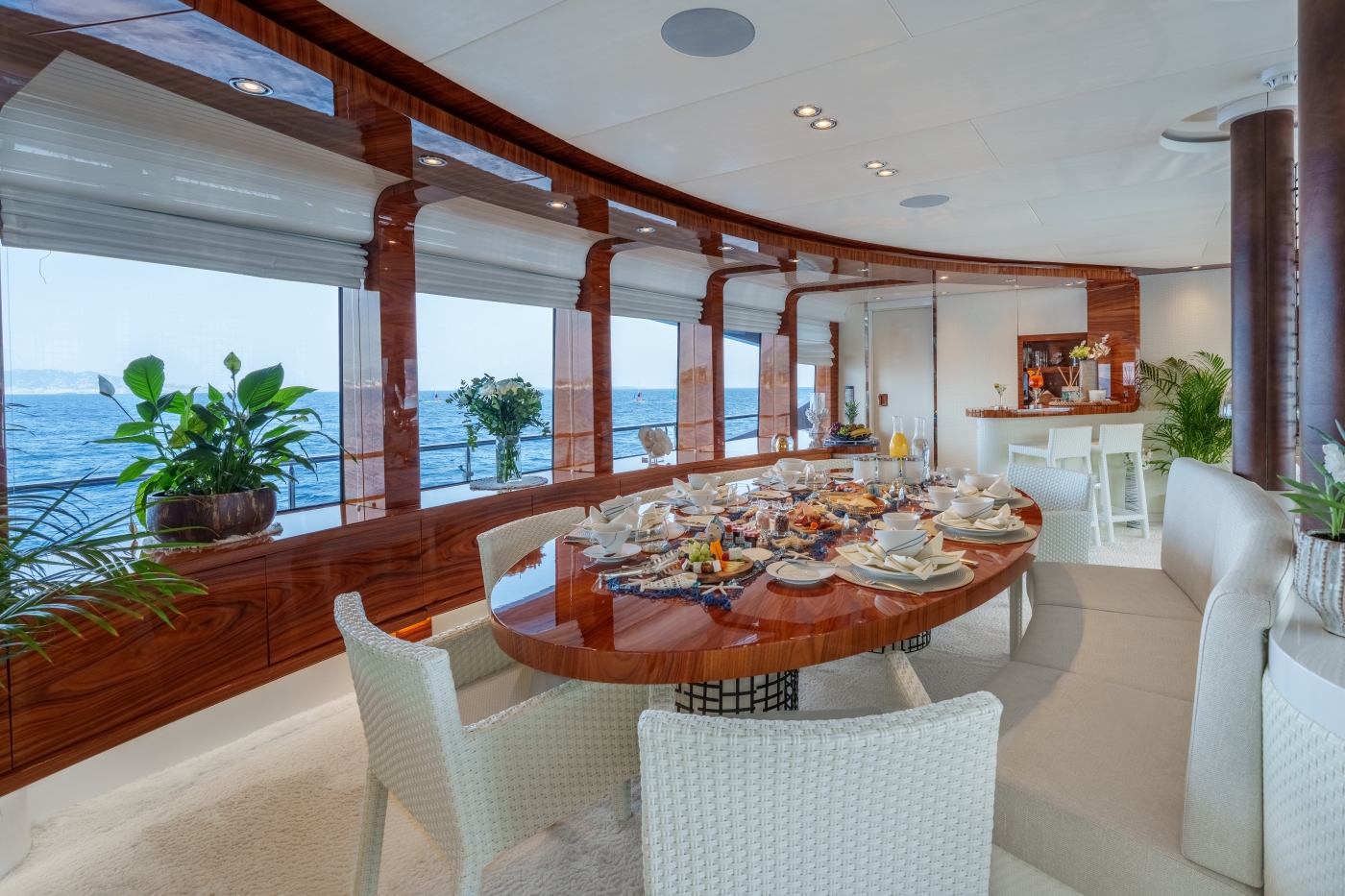 Her interior is bright and airy, with the use of wood and cream-coloured furniture and carpets throughout. The spacious and airy main saloon is equipped with a bar, a comfortable sofa, chaise lounges and an elegant dining area. The skylounge has a large U-shaped couch with further seating options that allow guests to relax comfortably around two small coffee tables. There is also a bar with bar stools and a DJ mixing station for unlimited entertainment and fun on board.