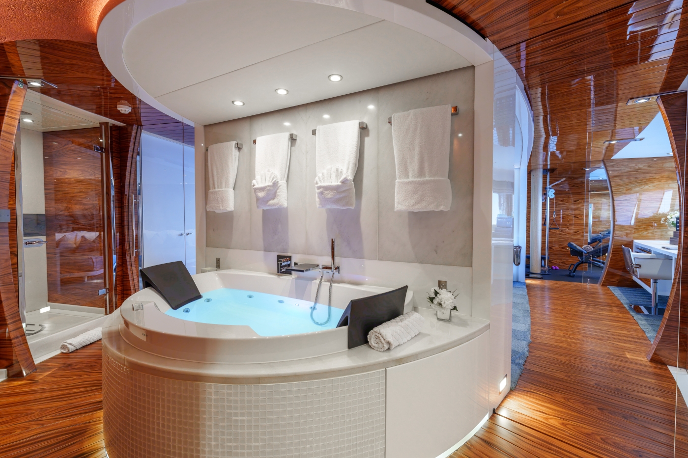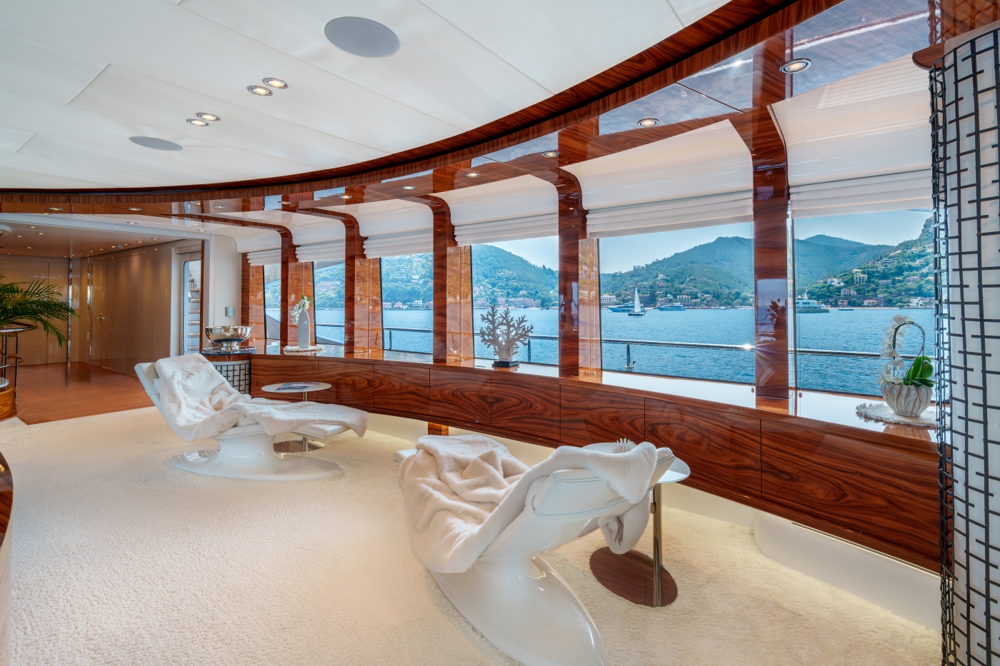 One of the main stand-out features of the yachts includes an open atrium design that provides 45 feet of unbroken natural lighting, from the very top of the sundeck all the way down to the lower deck.