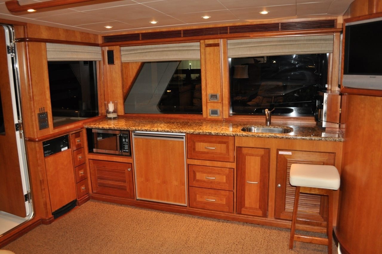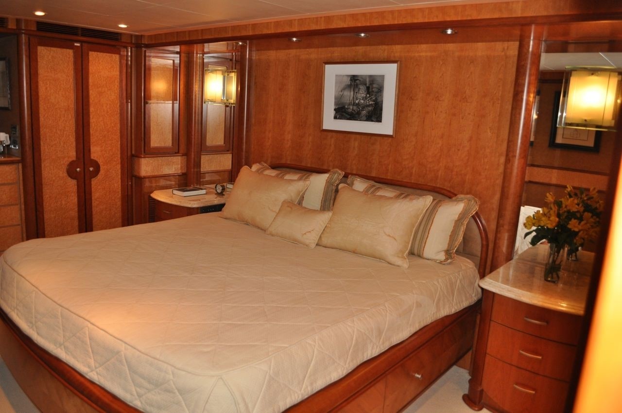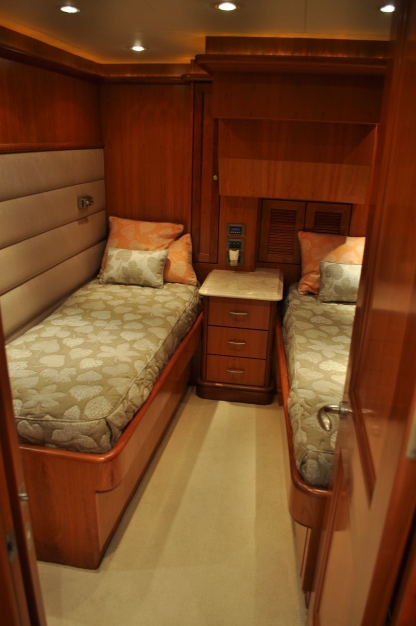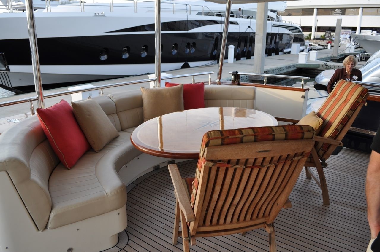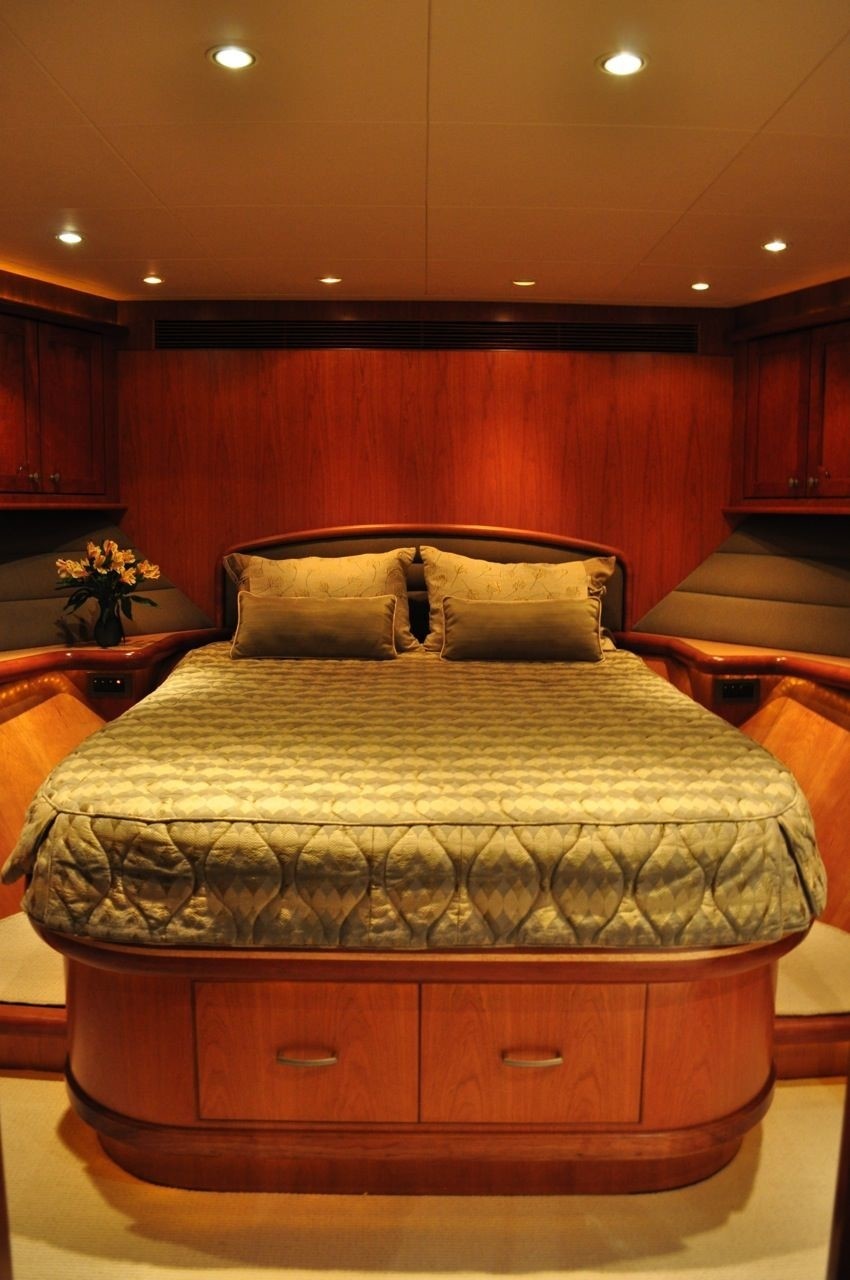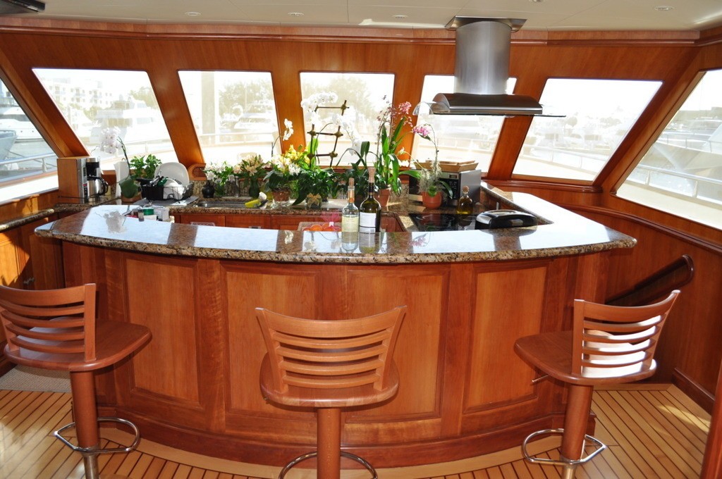 A short stairway leads to her plush and comfortable sky lounge, with a built-in wet bar with individual seating and mini-kitchen, comfortable leather recliners, TV/Stereo entertainment system and wrap-around windows for spectacular 360’ views. Or head out to the upper aft deck, and work on your tan on the plushly upholstered built-in sunbeds. It’s the perfect place to get away from it all and relax with a good book, gather for cocktail hour with a view, or plot your next course with the Captain in the adjacent flybridge.