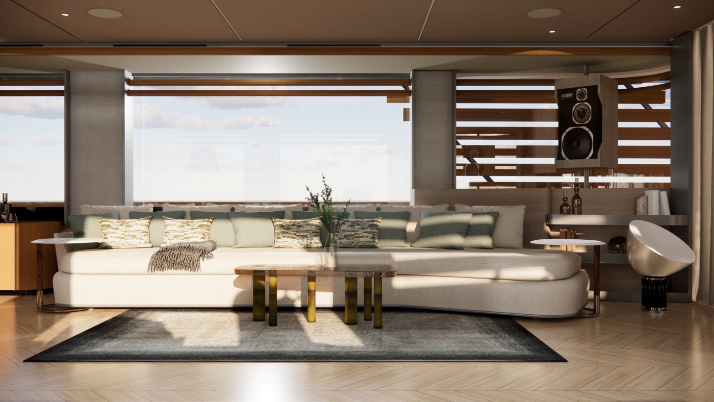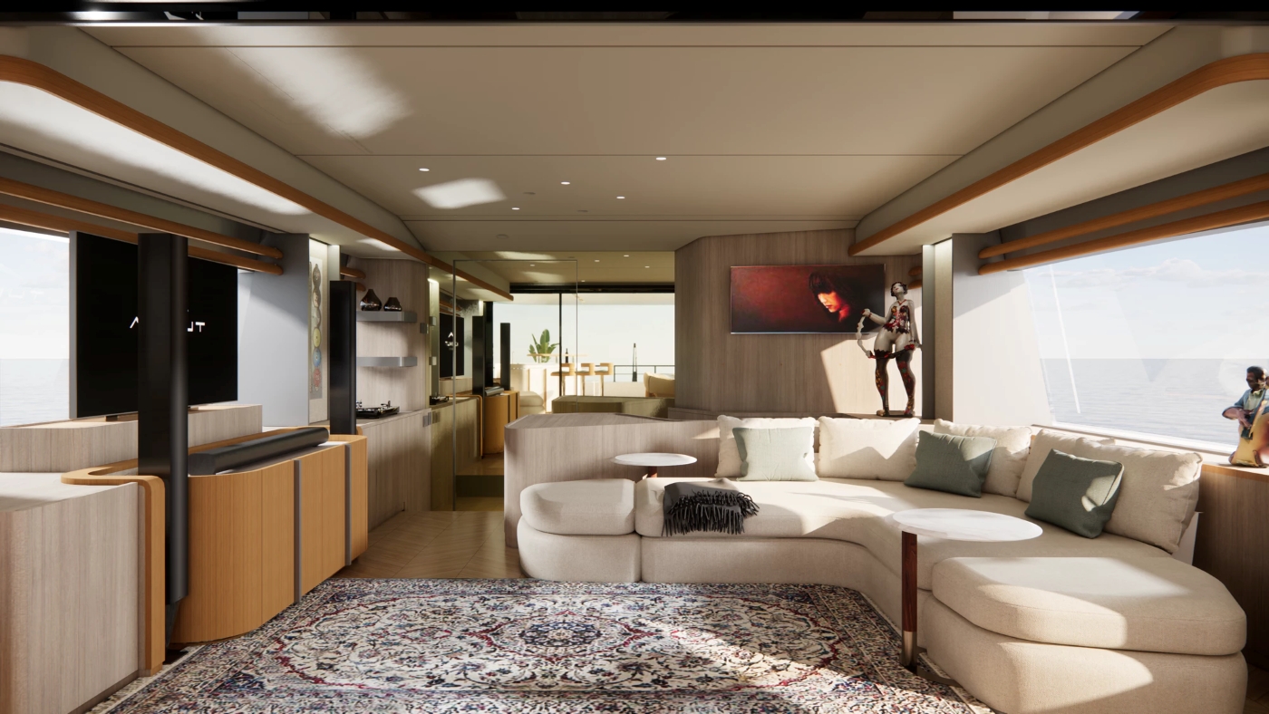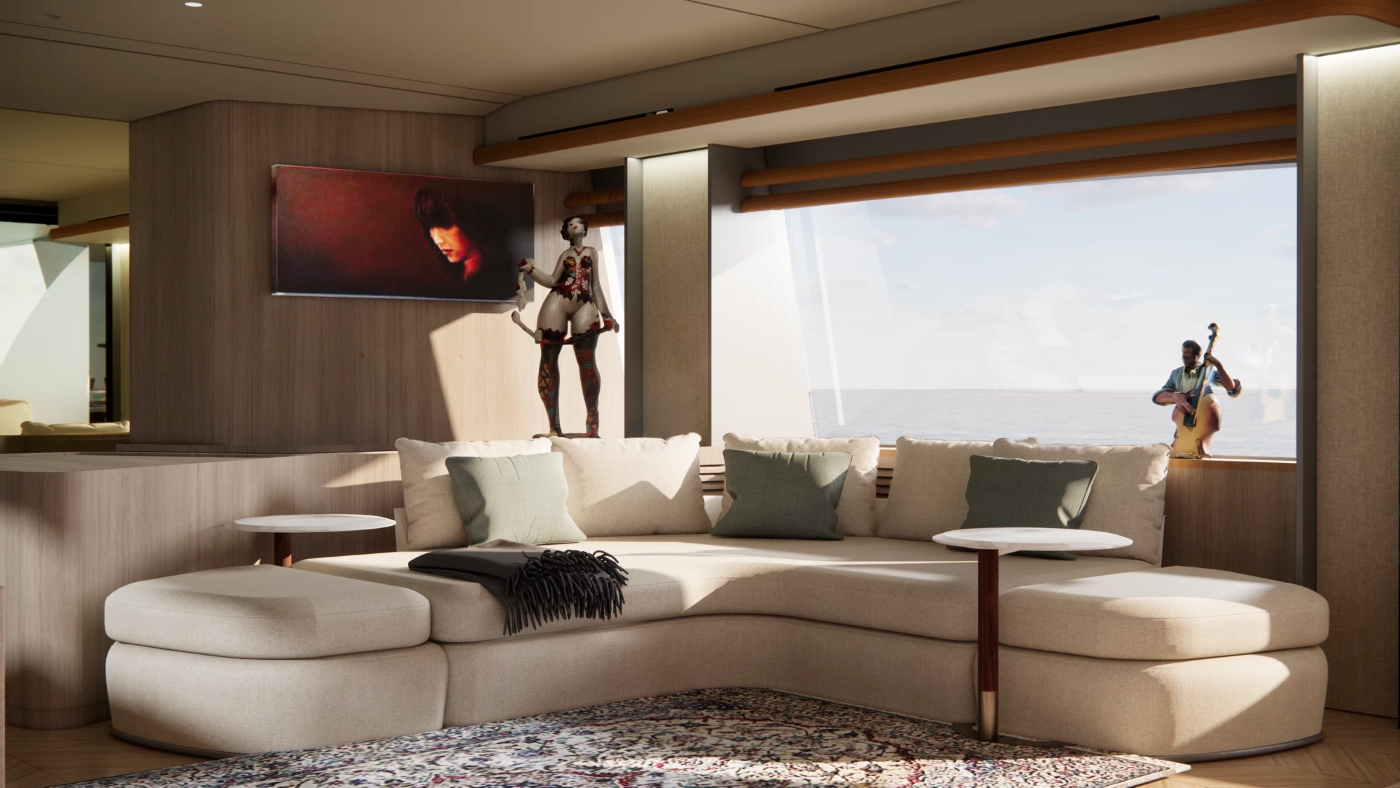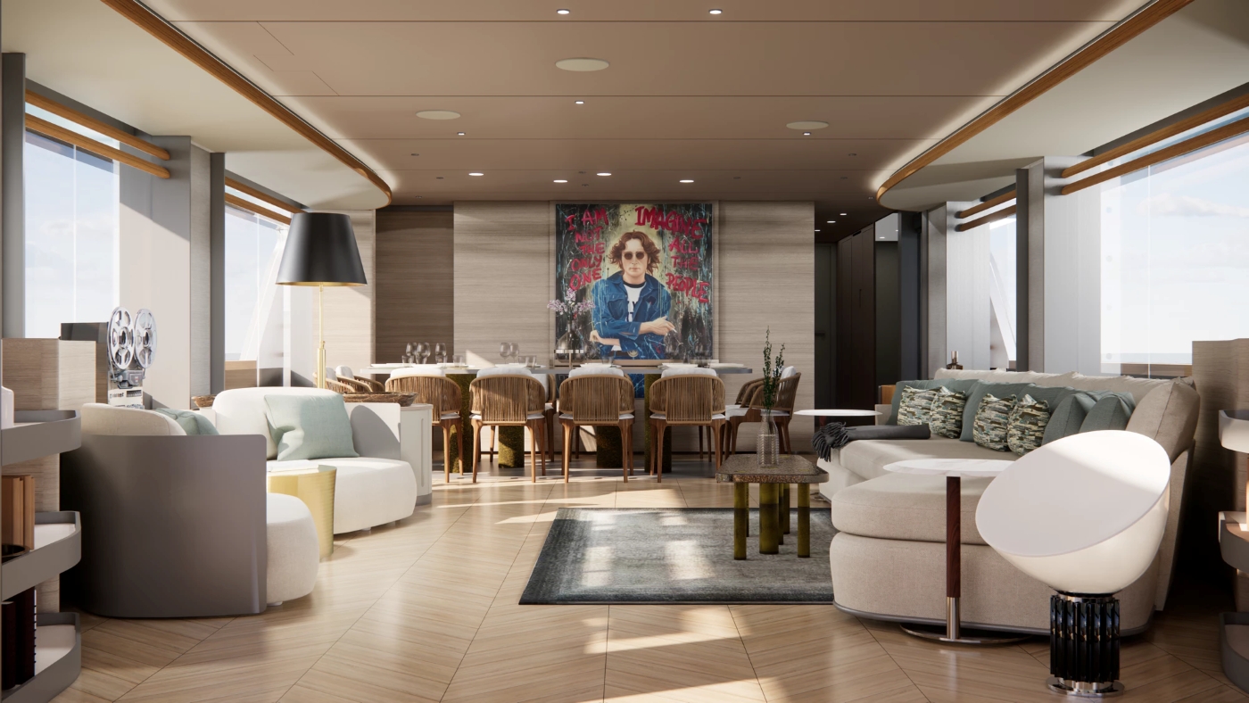 The main salon flows from a stylish lounge aft to a formal dining setting forward, framed by expansive windows that fill the space with natural light. Custom artworks and sculptural lighting create a setting that’s both cultured and inviting.