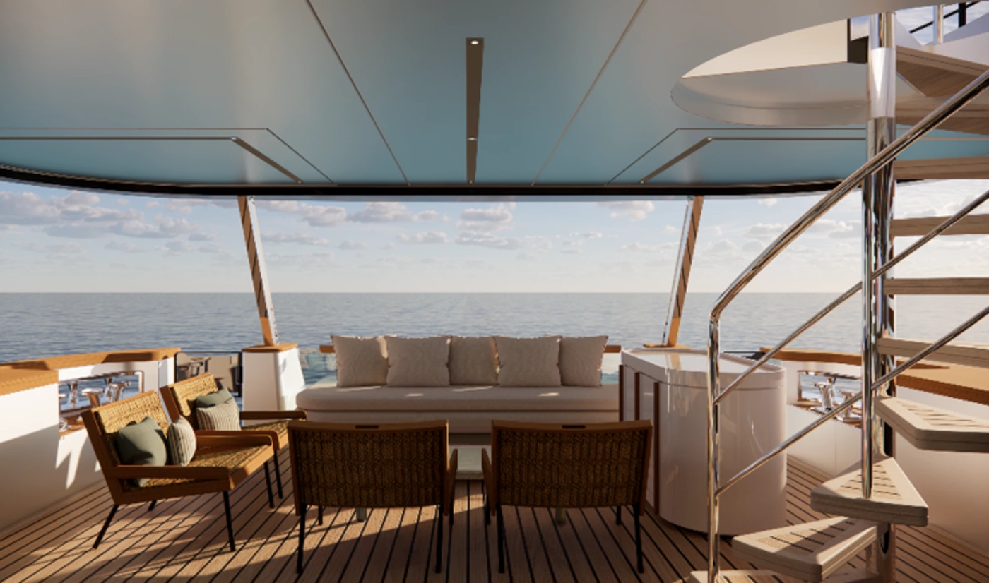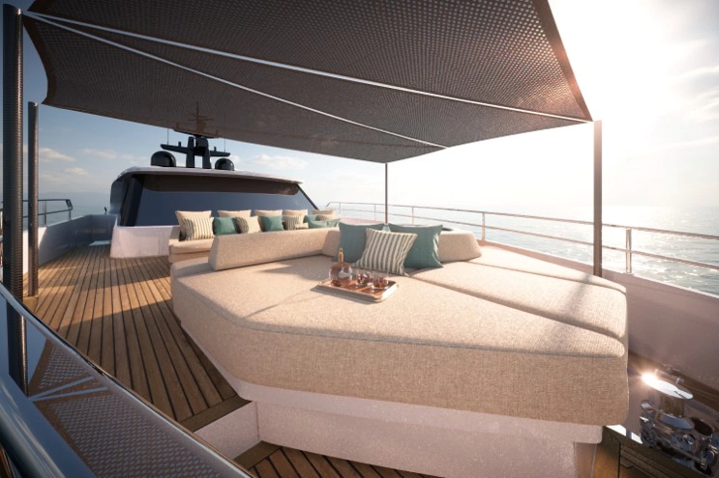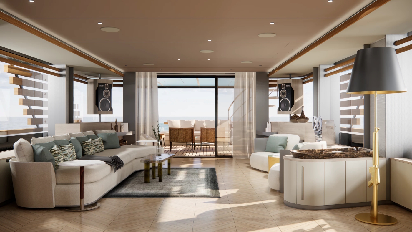 MR.K offers a compelling range of open-air living areas designed for seamless flow and relaxation. The Aft Infinity Lounge is framed by glass balustrades, creating an elegant waterfront terrace with plush, low-profile sofas - ideal for sundowners and panoramic views. Steps lead down to the fold-out beach club, which spans over 10m² and provides shaded lounging directly above the sea, adjacent to the toy garage for easy access to watersports.