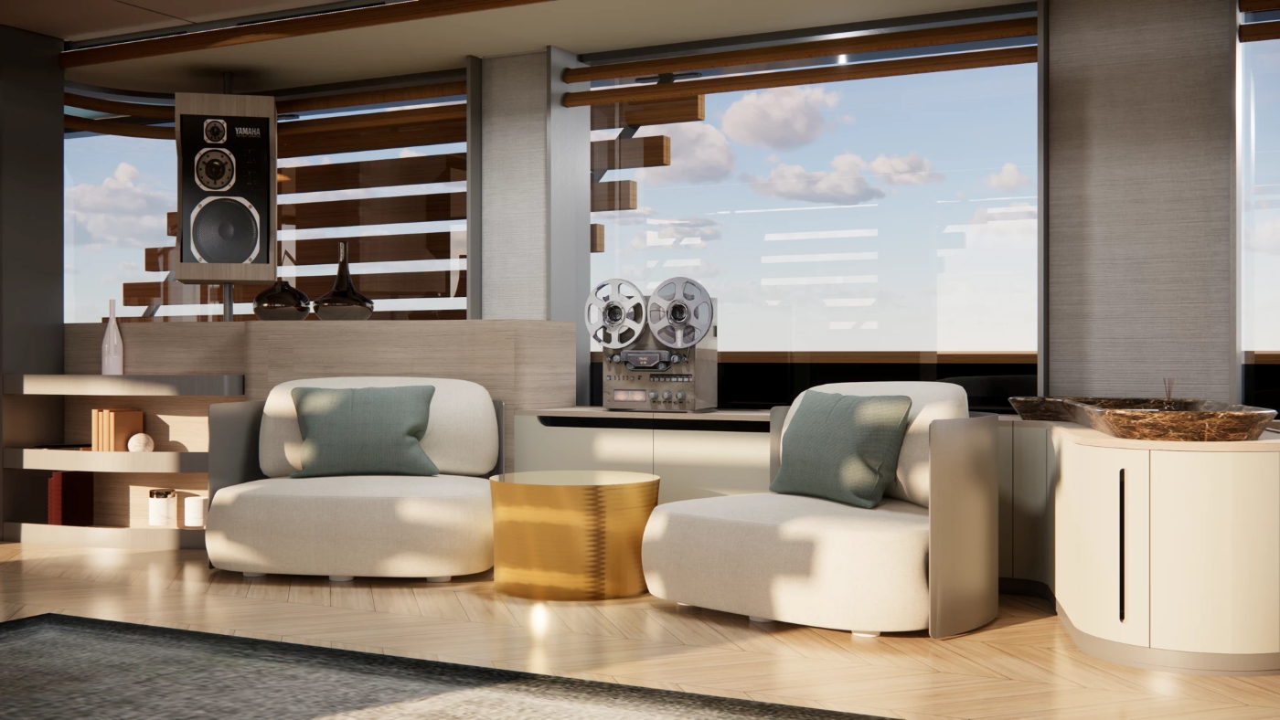 The interior of MR.K is nothing short of unique. Yachtique has curated a truly bespoke atmosphere centred around high-end audio and analogue elegance. Expect rich materials, clean lines, and artfully placed vintage speakers, turntables and sound elements - each an homage to musical heritage.