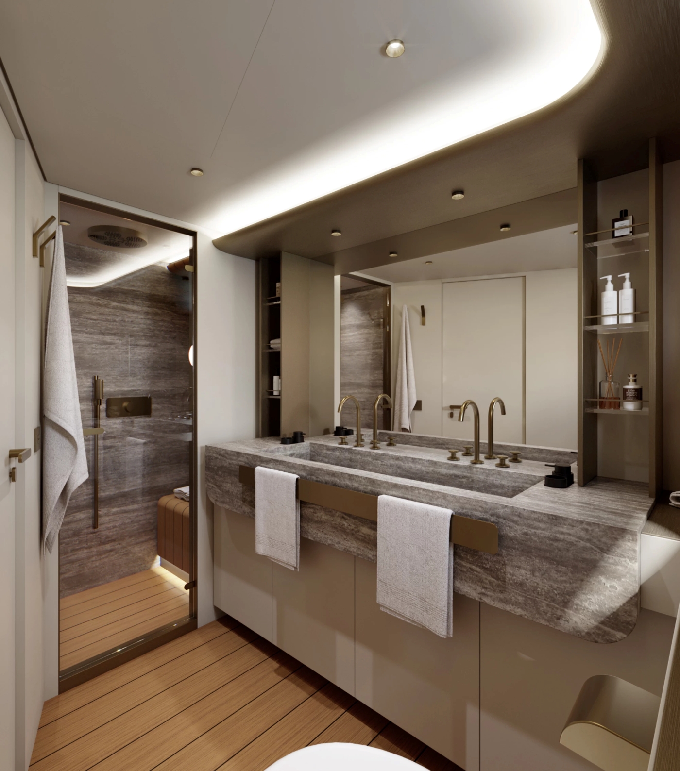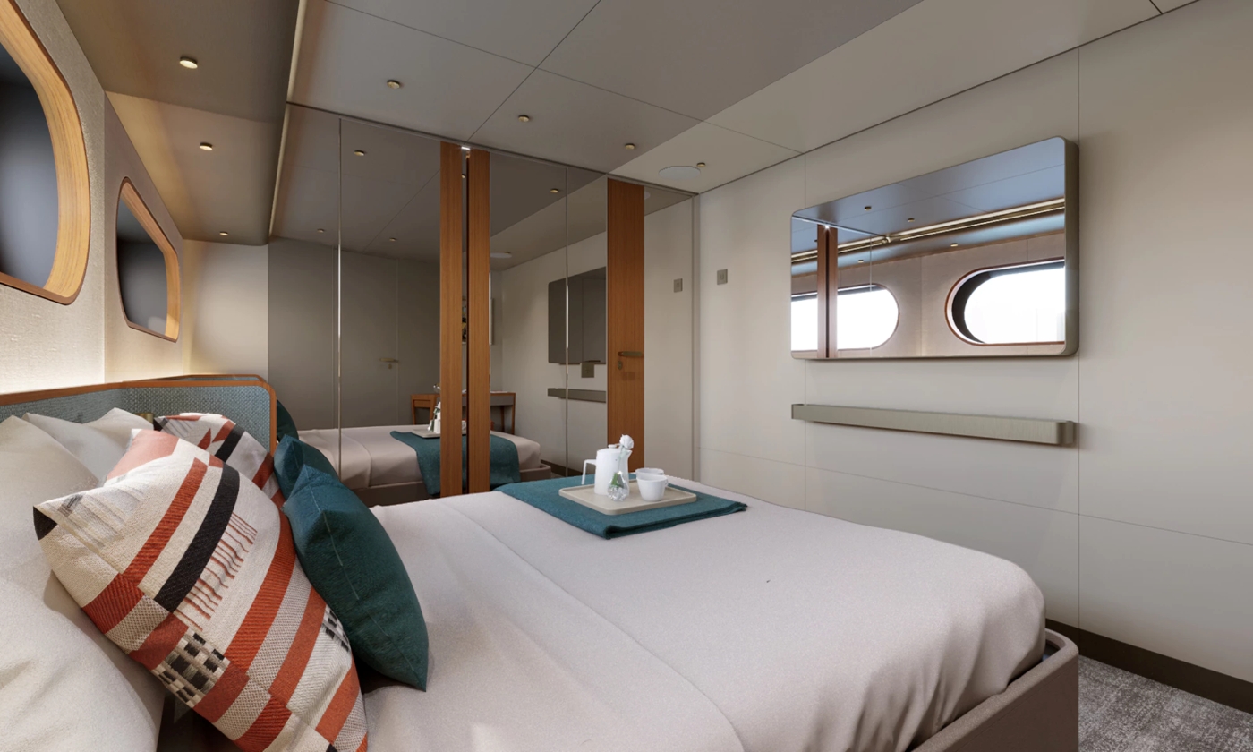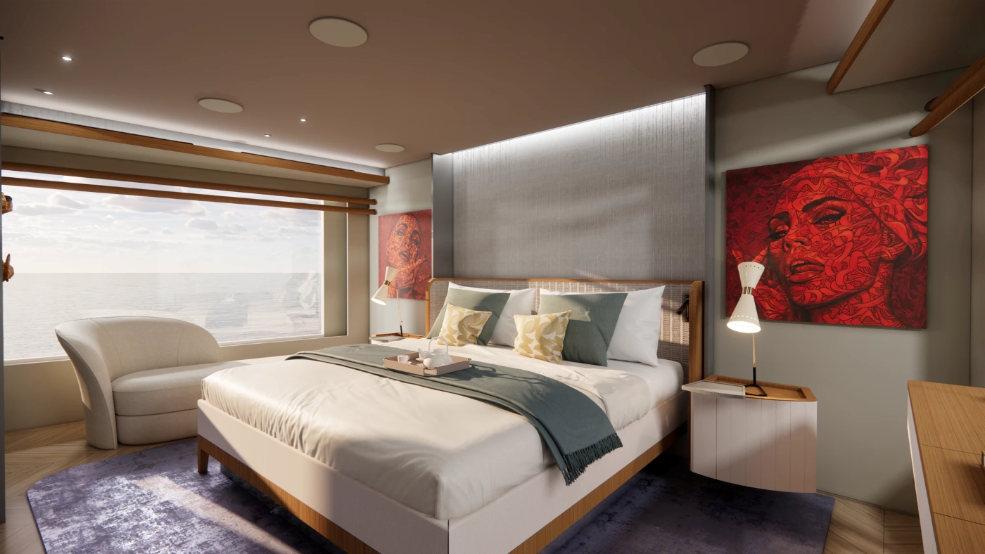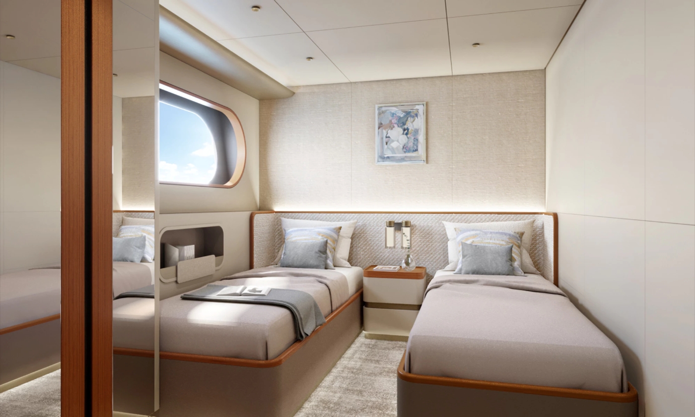 Accommodation for 12 guests in five en-suite staterooms: ~Main deck Master Suite: full-beam with panoramic glazing, bespoke décor and private lounge area ~2 VIP Staterooms: queen-sized beds and modern en-suites ~2 Twin Staterooms: each with 2 single beds and 1 Pullman, ideal for families or groups ~All cabins include ambient lighting, contemporary styling, and refined en-suite bathrooms