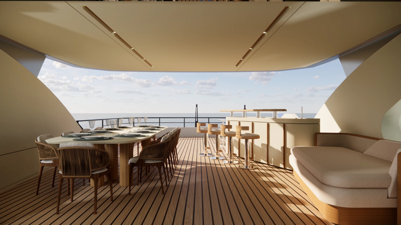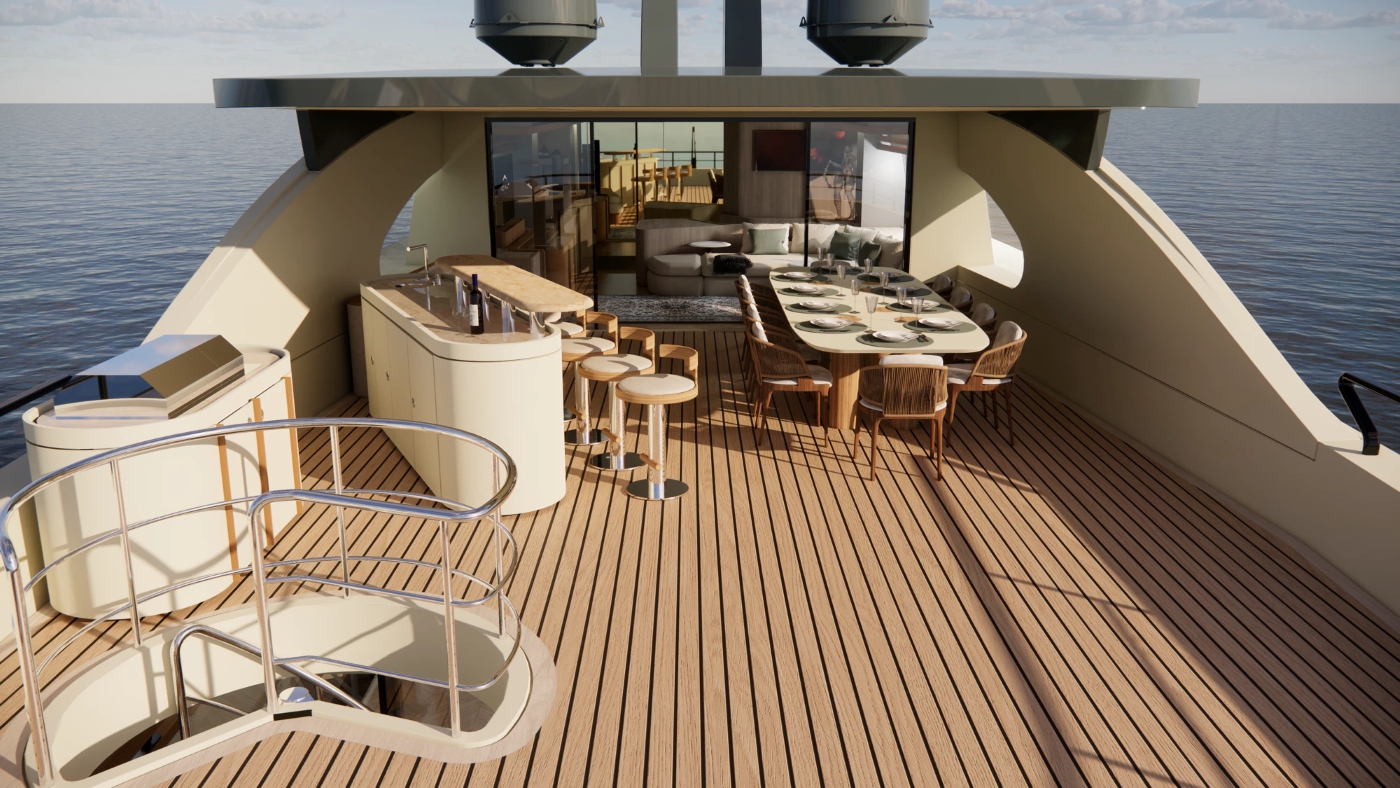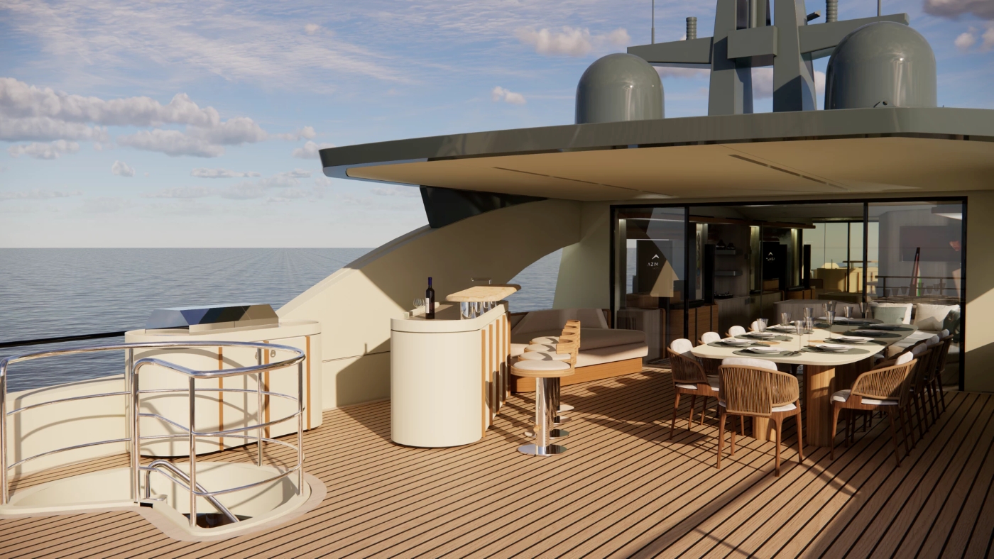 Above, the sun deck features an alfresco dining space, fully equipped bar, and a relaxed lounge area beneath a sleek overhang, offering all-day enjoyment in both sun and shade.