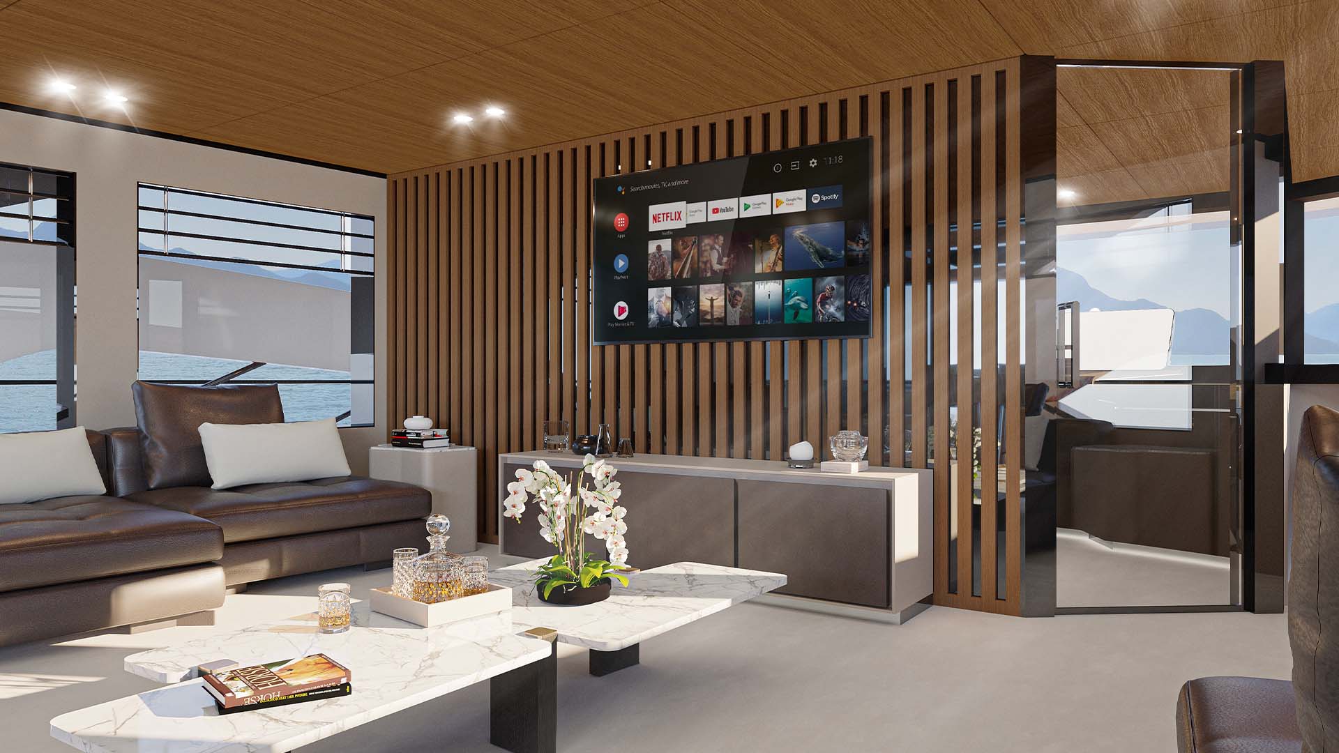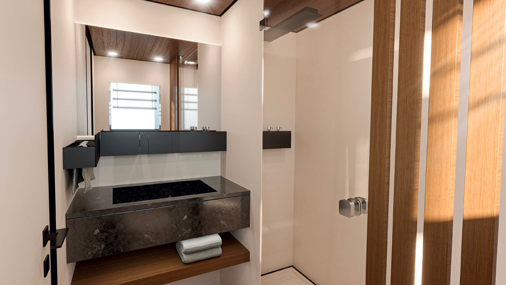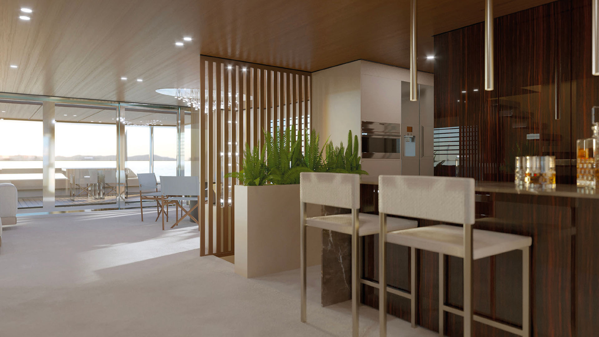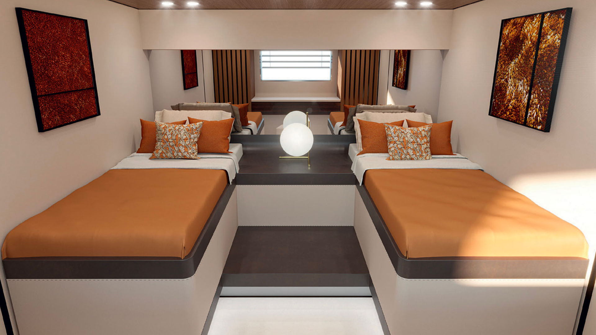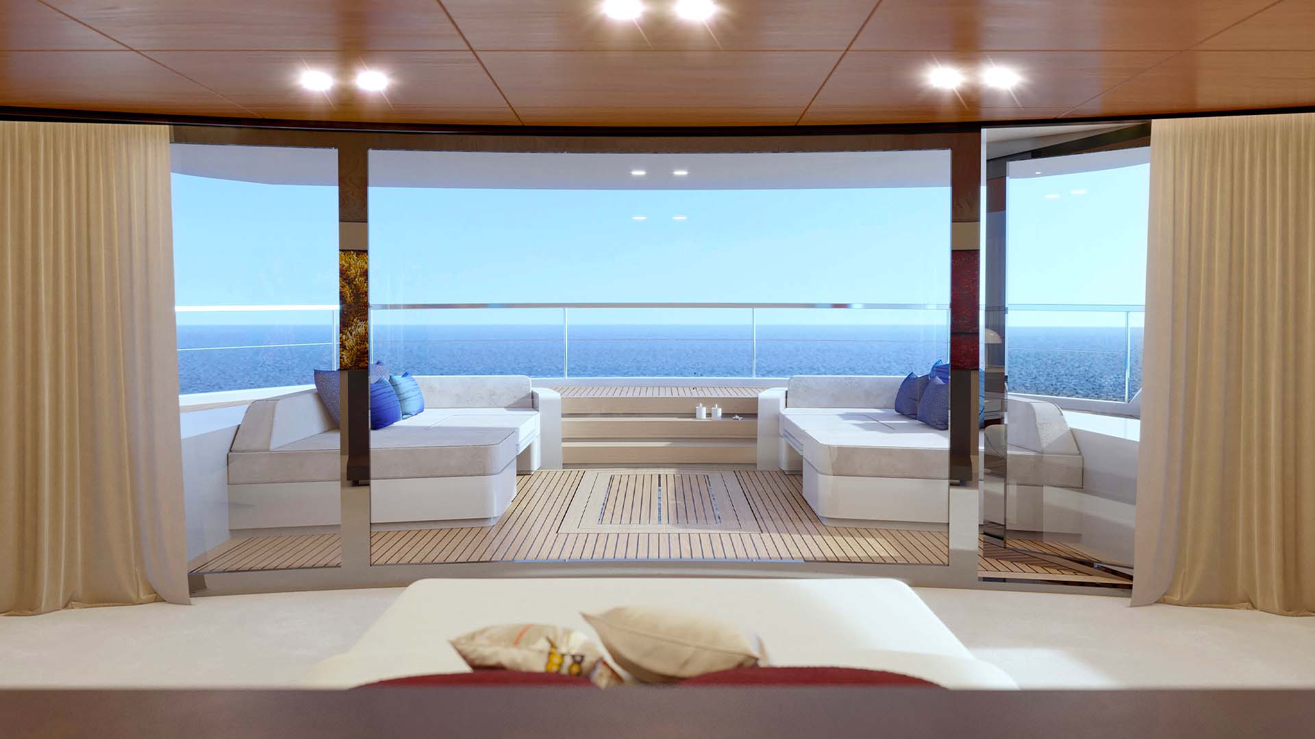 She features a four-stateroom configuration, consisting of a spacious owner’s suite on the main deck, two generous VIP suites and a twin guest stateroom located on the lower deck. The VIP suites have direct access onto the fold-out balconies. Her main owner’s suite includes a private foredeck lounge, occupying nearly half of the total space, with a forward-facing bed and ensuite bathroom.