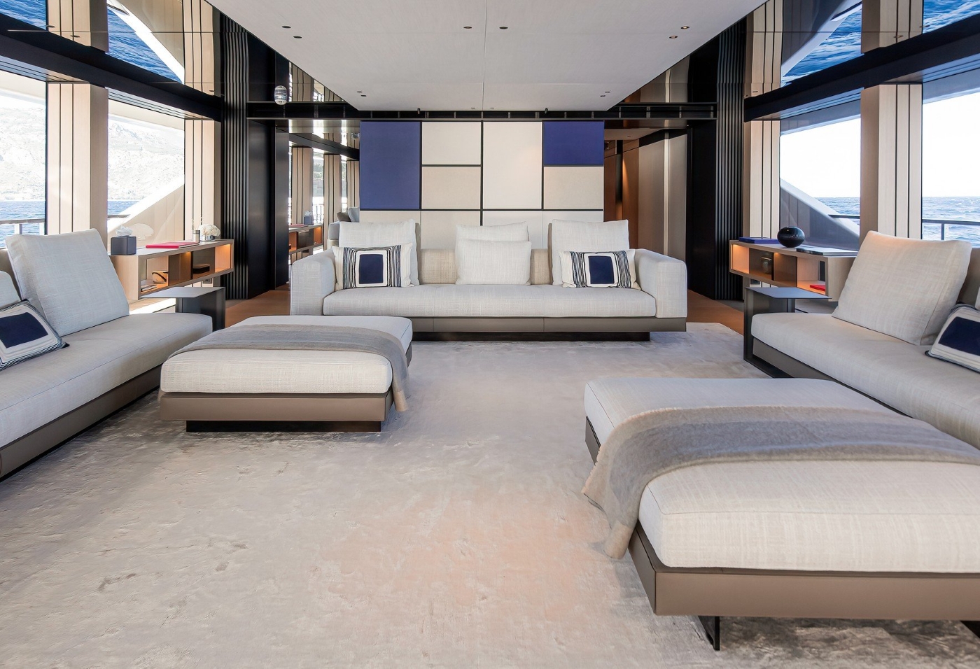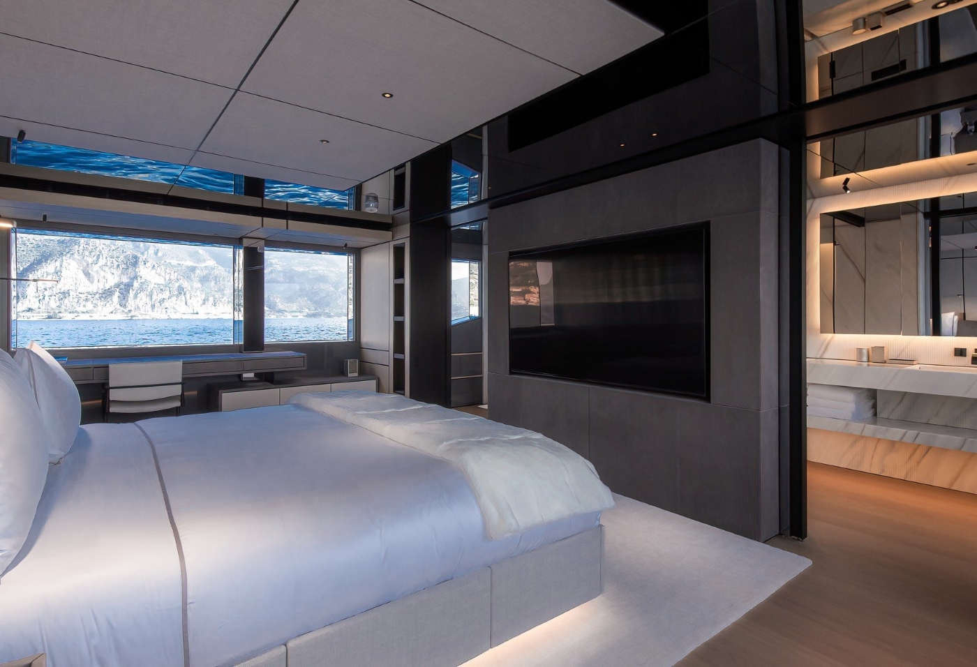 Her interior layouts are what you would expect on a larger yacht thanks to some simple design tricks including mirrored window mullions, fluid free standing furniture and simplicity rather than minimalist. Her look and feel centre around a few carefully chosen materials and textures, with light oak, marble, soft leather, light coloured fabric and dark metal blended together and bathed in natural light.