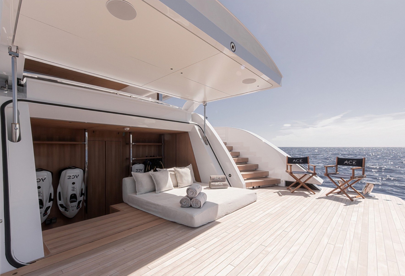 NOTABLE FEATURES OF ACE: ~ 145-Foot Steel Hull ~ Master Suite on Main Deck ~ Beach Club with Aft Platform ~ Comprehensive Water Sports Arsenal ~ Cinema-Quality Entertainment ~ RYA Approved Water Sports Centre ~ Advanced Stabilisation System ~ Dual High-Speed Internet ~ Deck Jacuzzi with Flybridge Design ~ Air-conditioning ~ WiFi