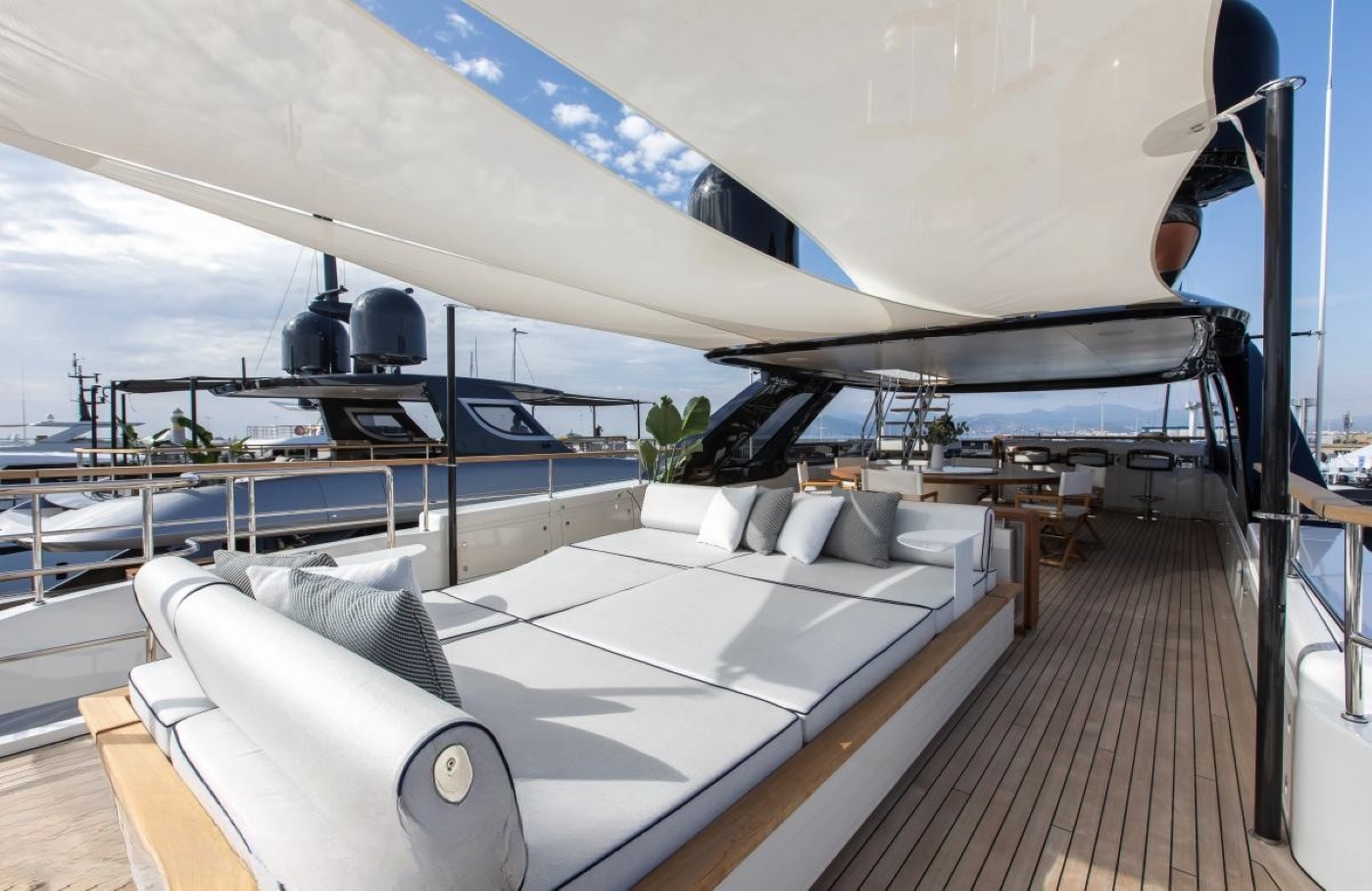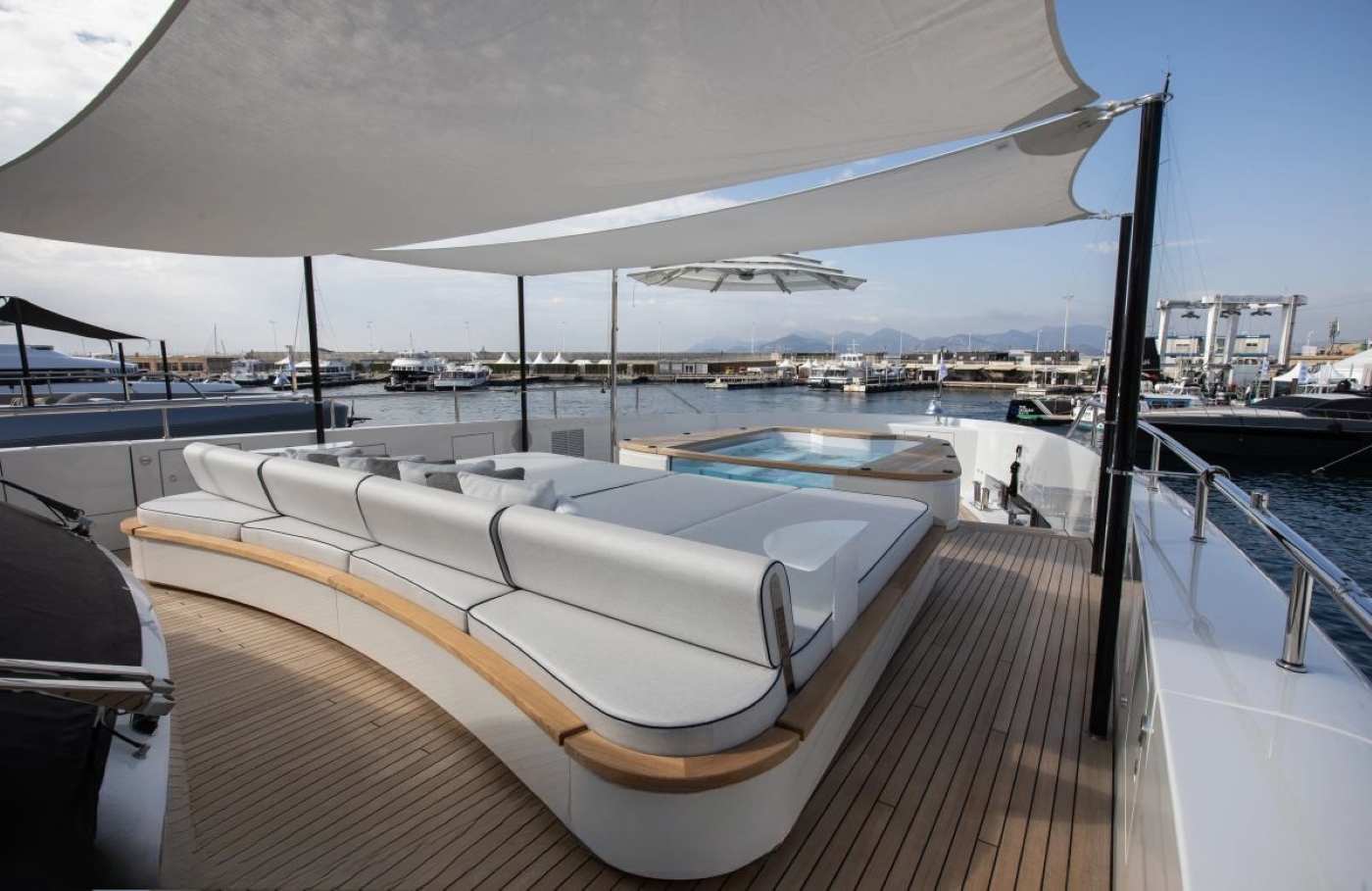 The upper deck aft is dedicated to dining and features a huge table and chairs plus the added bonus of a generous lounge space with opposing L-shaped sofas. Also on this level, the foredeck boasts a superb jacuzzi pool with a row of cushioned sun pads at one edge.
