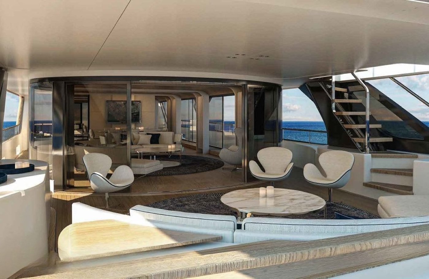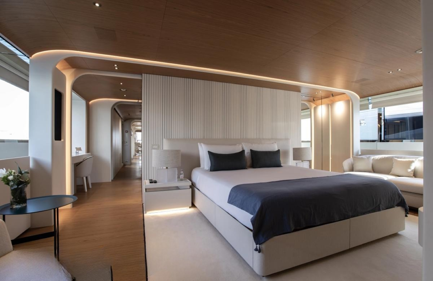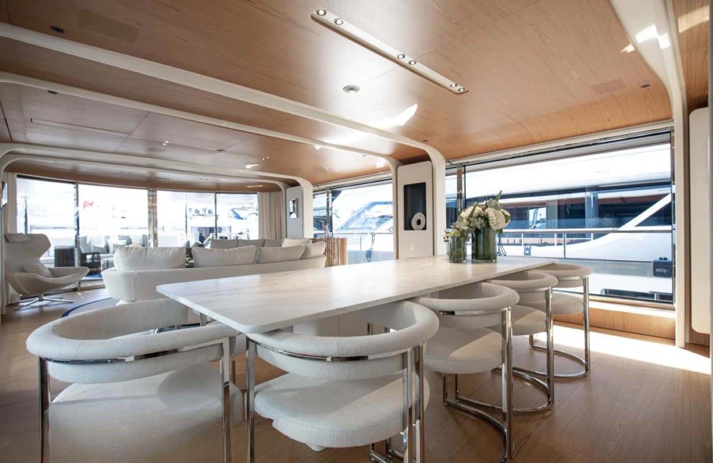 The yacht’s floor-to-ceiling windows, use of reflective surfaces and open-plan interior create an environment that is light and bright and well connected to the surroundings. The main salon windows allow guests to take in the incredible panoramic views while they socialise on the comfortable sofa, enjoy a cocktail by the bar or savour a leisurely dinner in her formal dining area. There is a seamless flow from the interior main salon to the main deck aft creating a large sociable area on the main deck.
